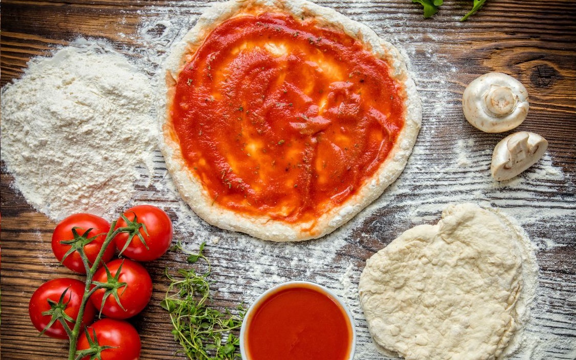 To make your pizza sauce drain the contents of a 400g tin of chopped tomatoes (San Marzano tomatoes are the best, they are sweet and flavoursome) through a sieve over a jug. Press lightly with the back of a spoon until about half the juice has been removed. Then tip the tomatoes into a bowl and stir in 2 tbsp of tomato puree, a glug of extra virgin olive oil, 1 tsp of dried oregano, and a pinch of salt and pepper. Optional extras are a dash of balsamic vinegar or even a chilli, but basic is good when it comes to traditional sauce. Some sauce recipes suggest you cook the sauce but this is unnecessary, especially if you are enjoying a fun evening, and it would leave you with less wine-drinking time.