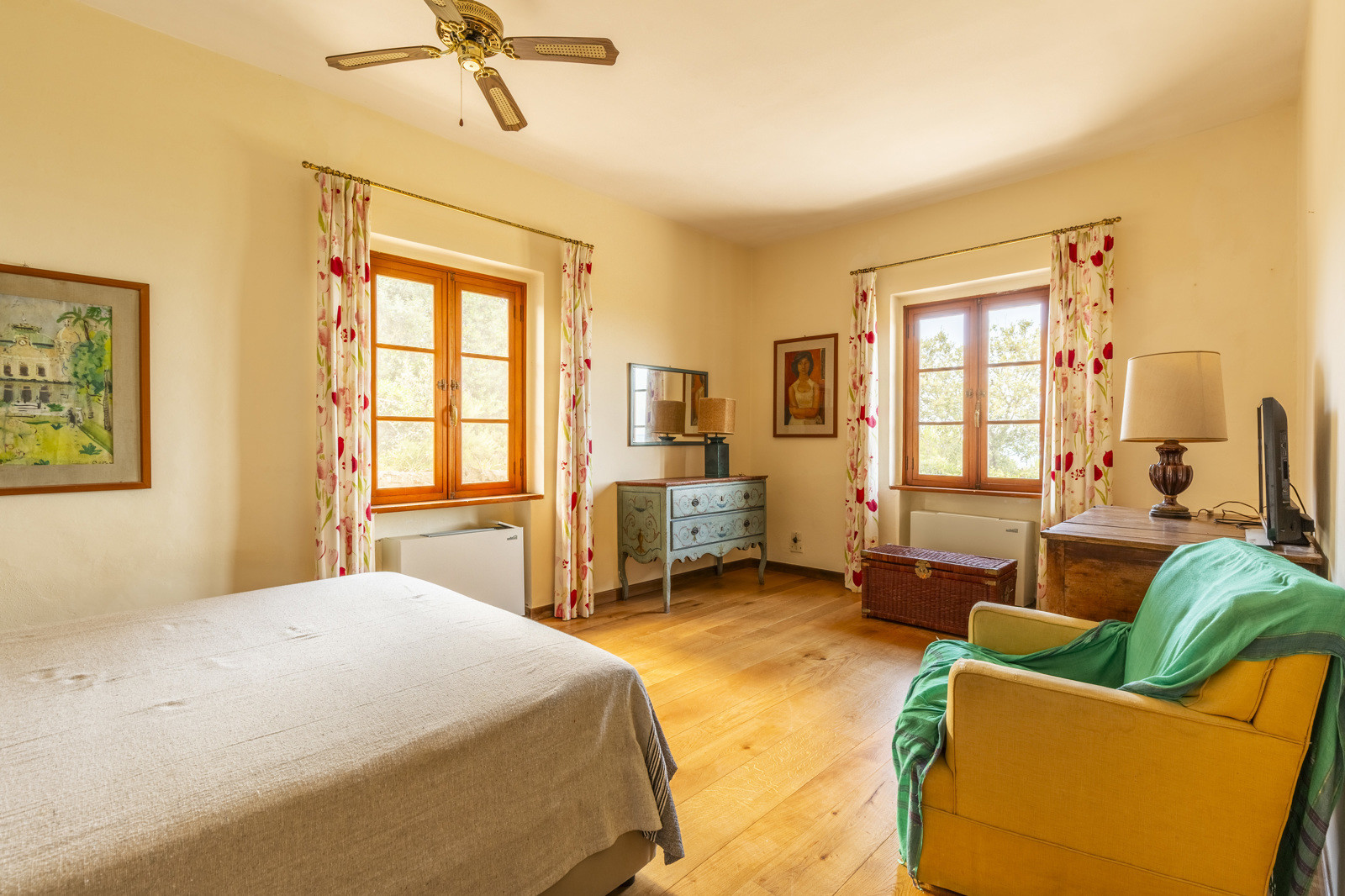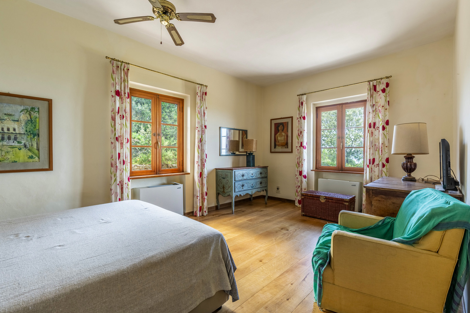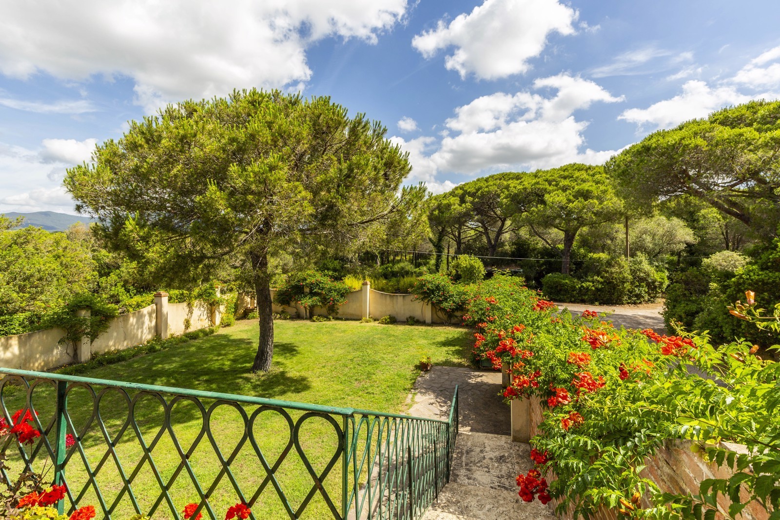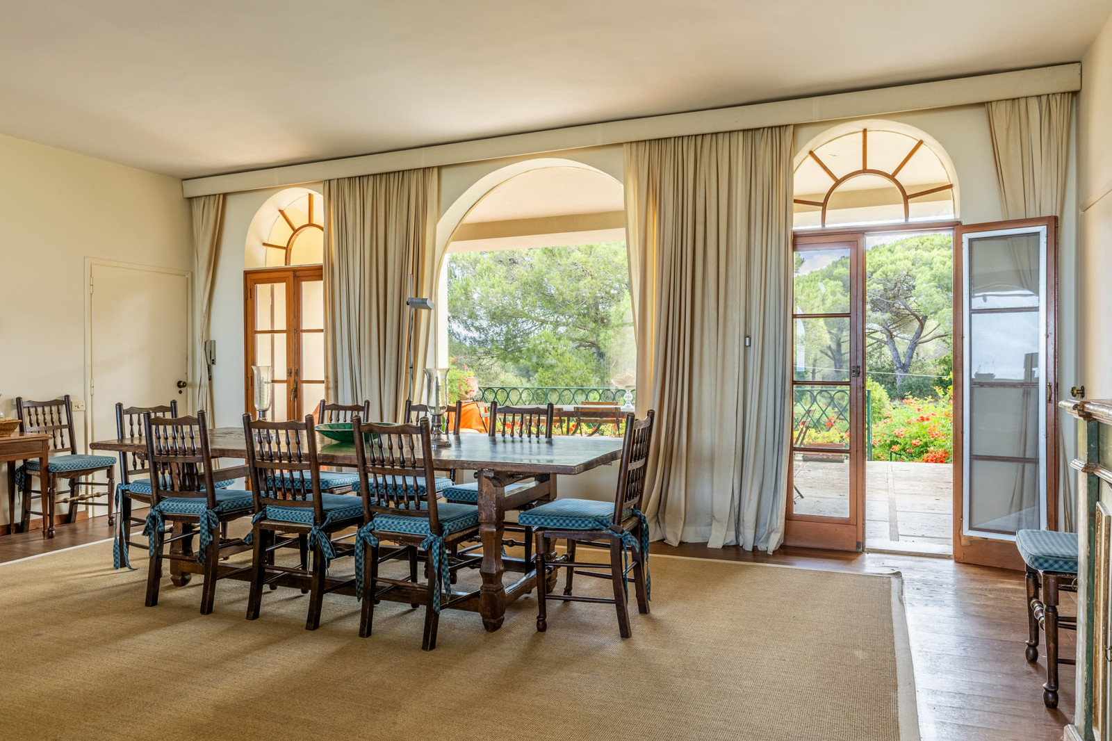 The fenced garden to the rear offers privacy for various activities. In the park of this magnificent property of about 15 hectares, are pine trees and Mediterranean scrub that reaches up to the gate of the property. Additional parking spaces are outside.