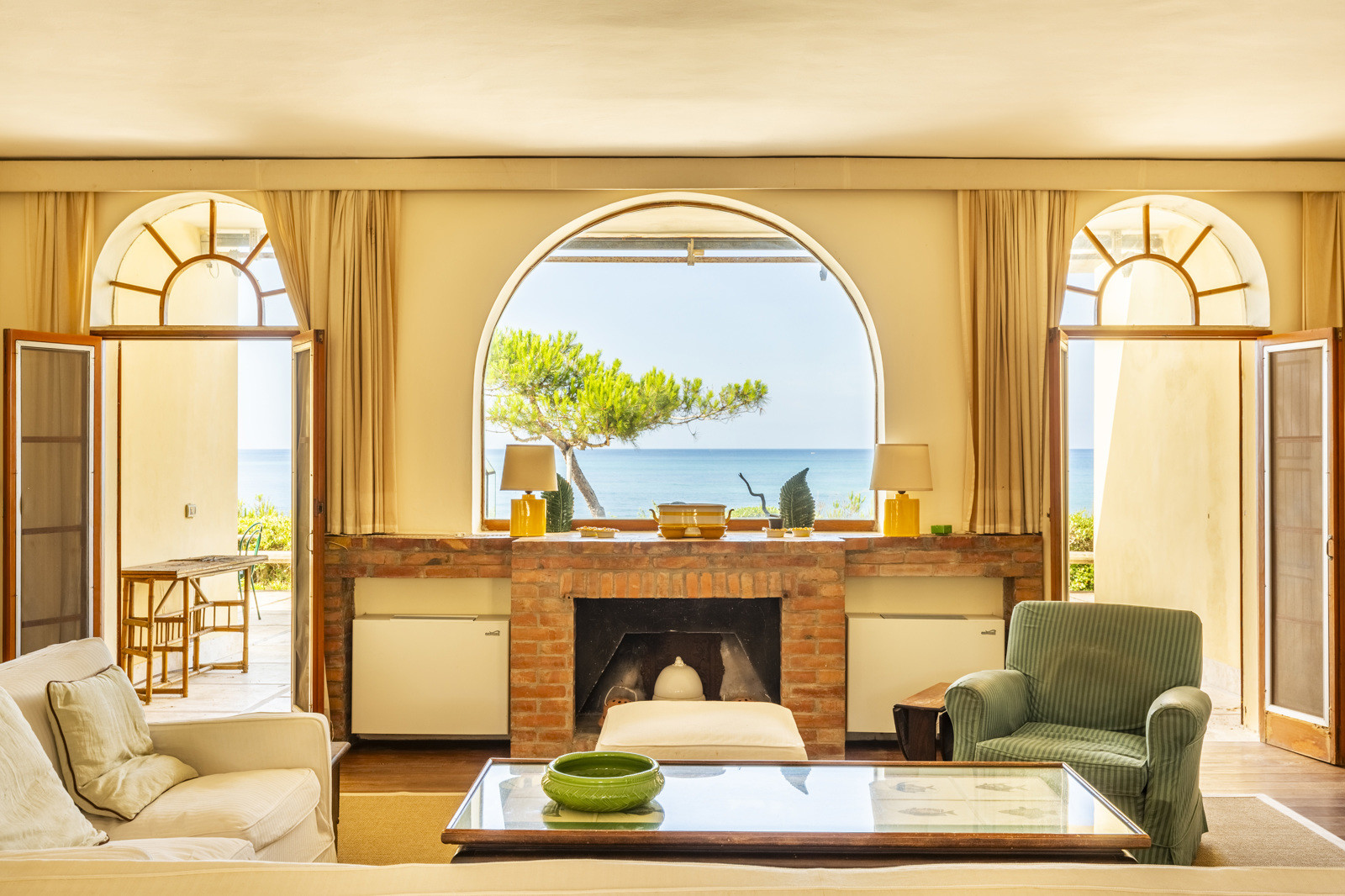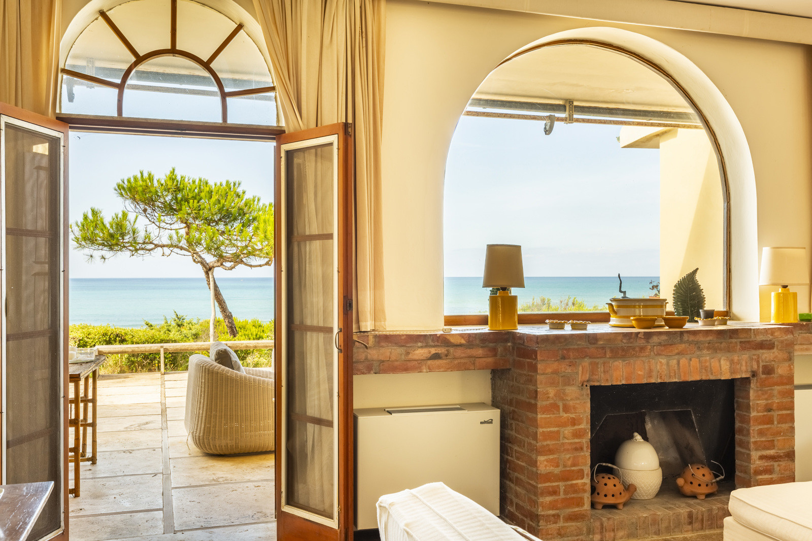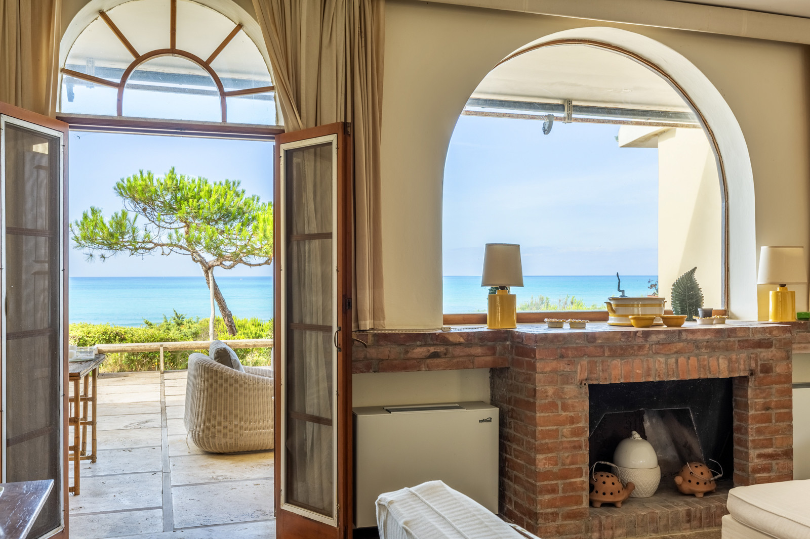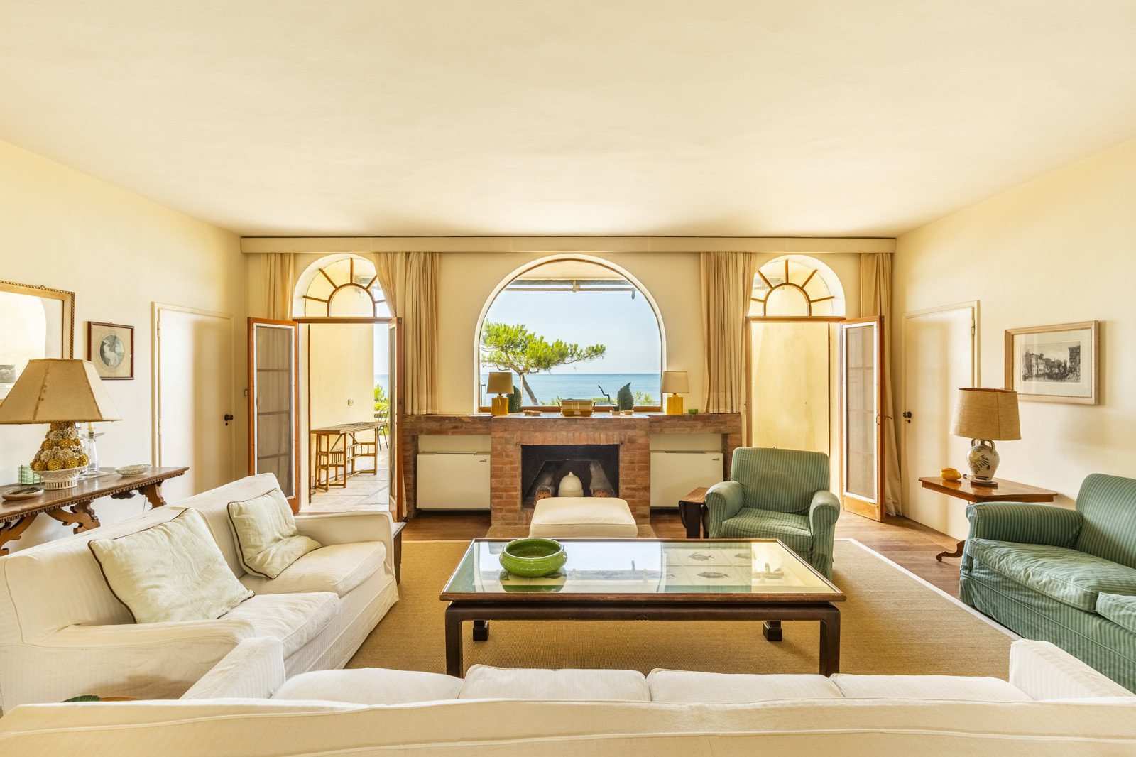 On the upper floor, is a large and magnificent living room with a terracotta fireplace and large arched windows framing the sea, several bedrooms with en suite bathrooms, and a panoramic terrace offering views of the crystal clear sea of the Tuscan coast.