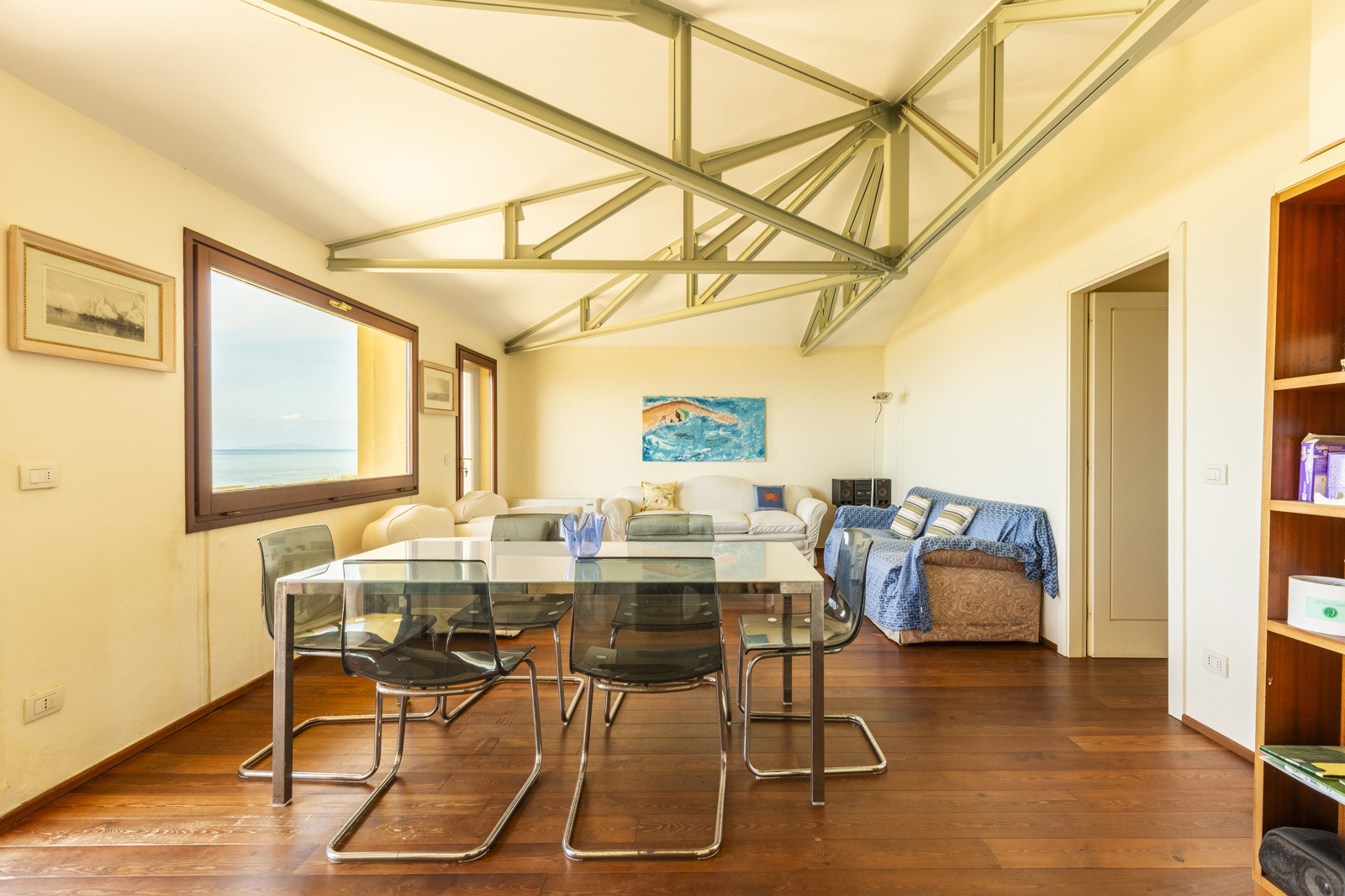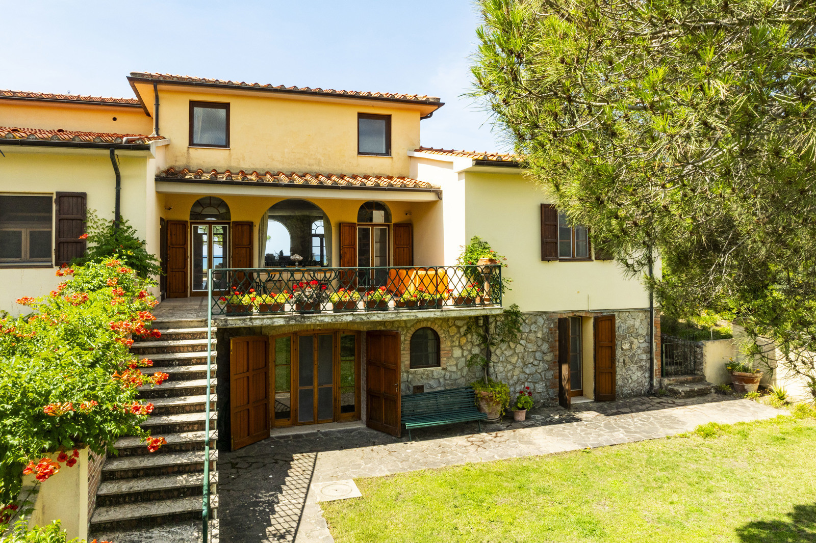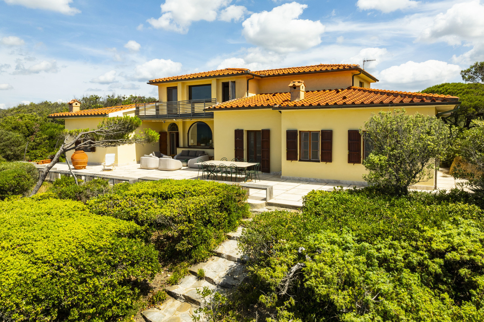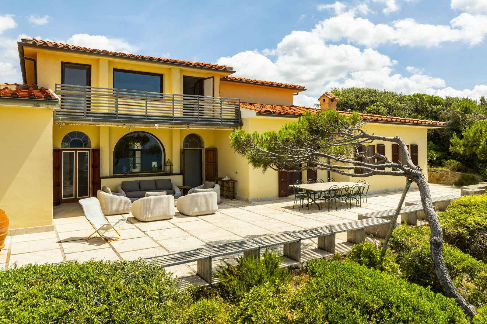 On the upper floor, is a large and magnificent living room with a terracotta fireplace and large arched windows framing the sea, several bedrooms with en suite bathrooms, and a panoramic terrace offering views of the crystal clear sea of the Tuscan coast.
