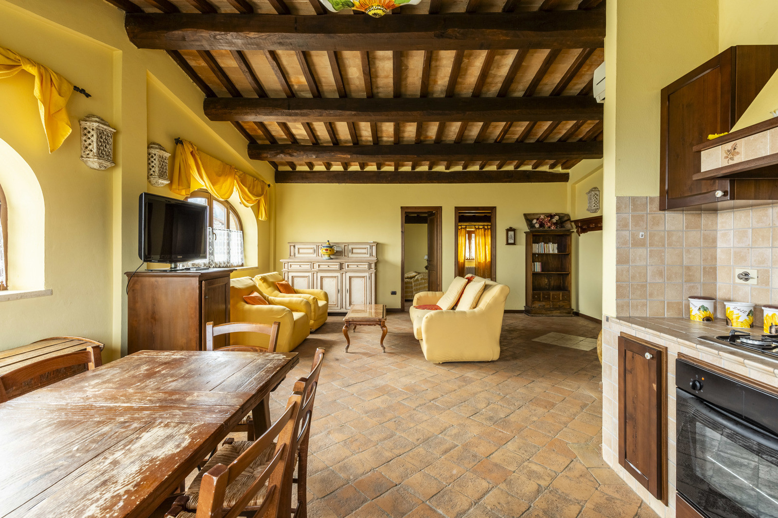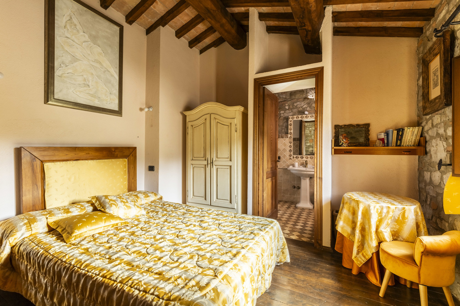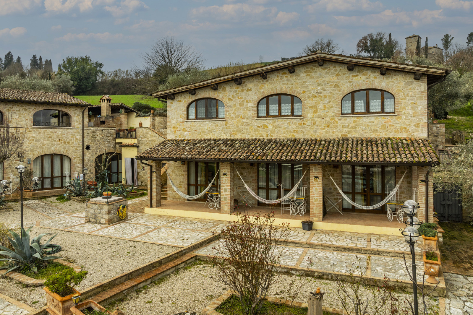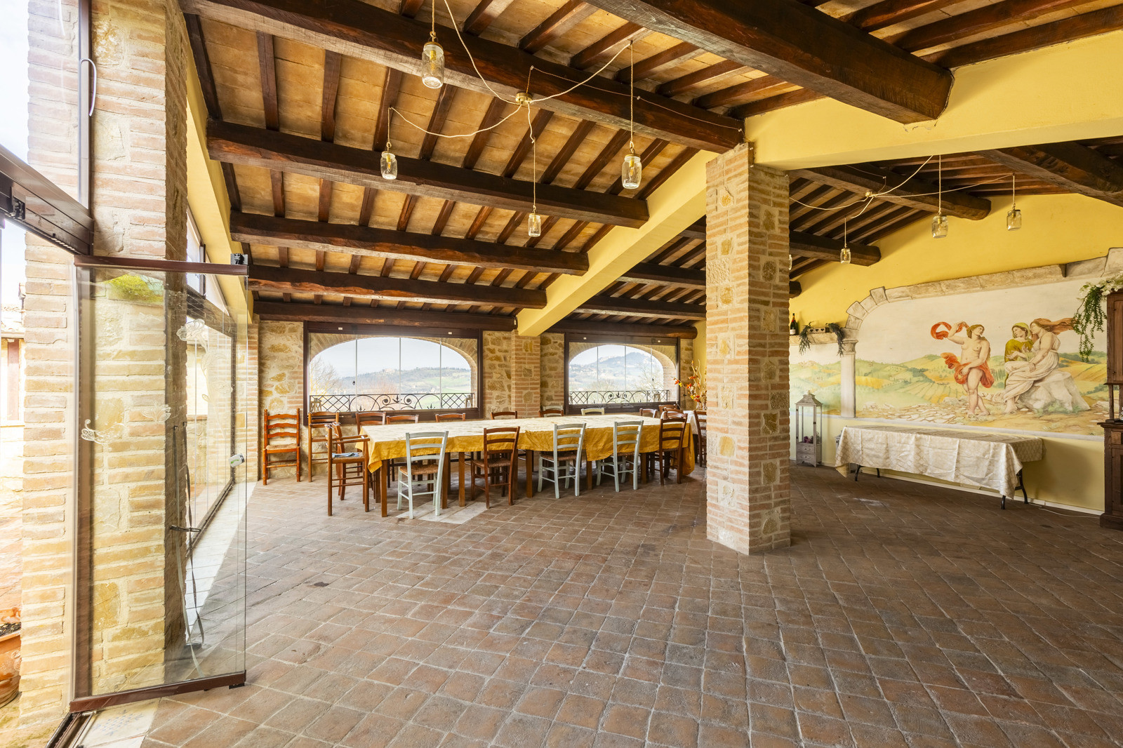 The second building, currently used for hospitality, offers 4 independent apartments and a lovely studio apartment on the ground floor, while on the second floor are 4 spacious rooms with private bathrooms. A distinctive element of this structure is the charming panoramic loggia, equipped with an oven and kitchen, ideal for outdoor dining immersed in the beauty of the Umbrian landscape.