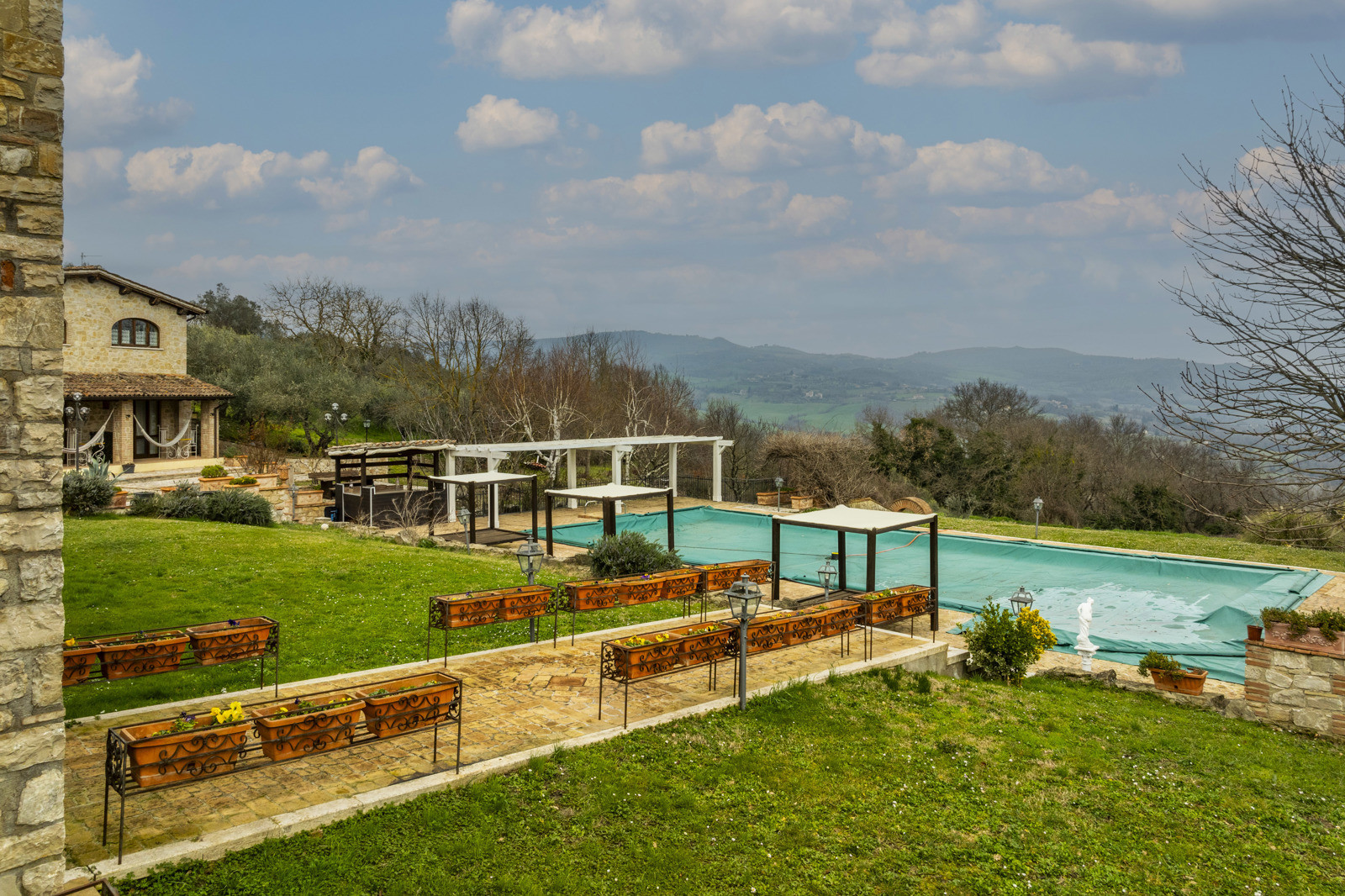 The property covers about 1.8 hectares of land, where a lush garden, dotted with aromatic plants and flowers, surrounds the large swimming pool, offering a corner of pure relaxation with spectacular views of Todi and the rolling Umbrian hills.