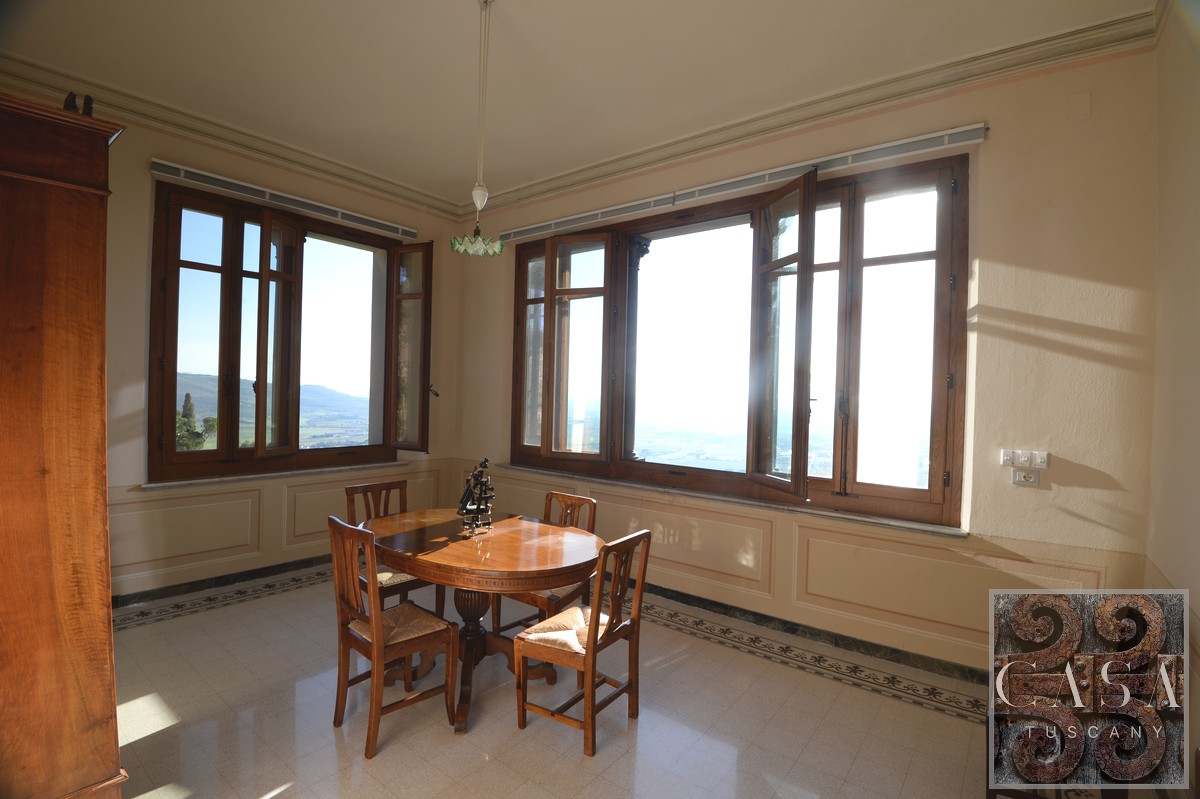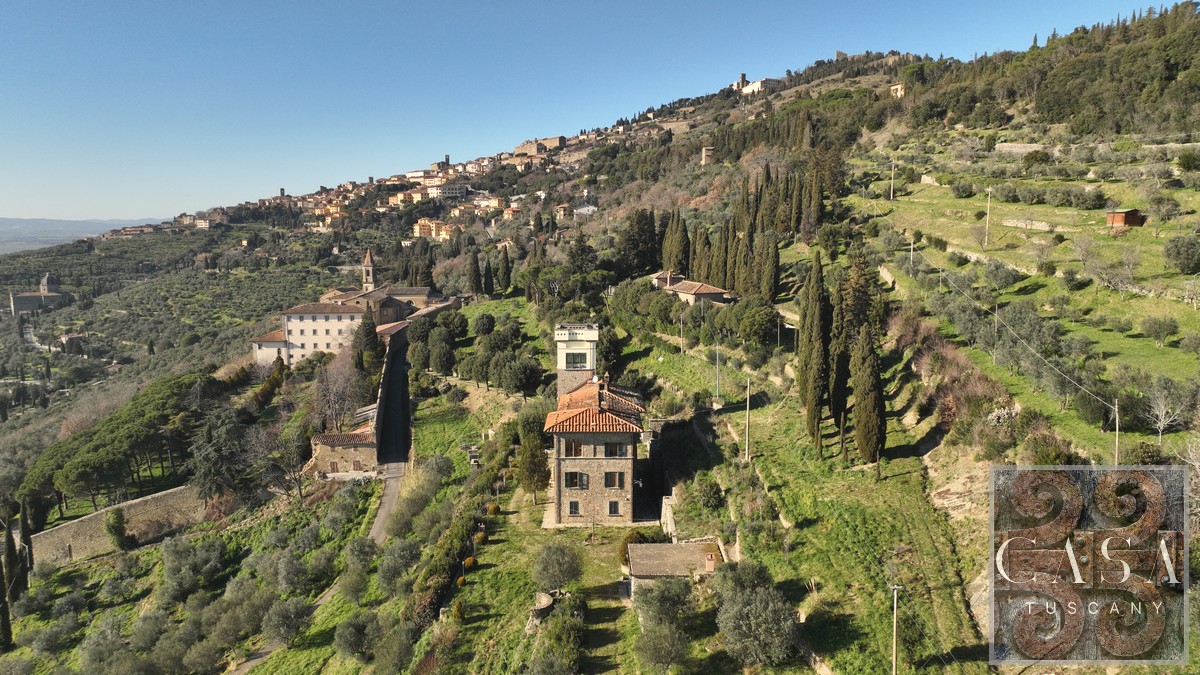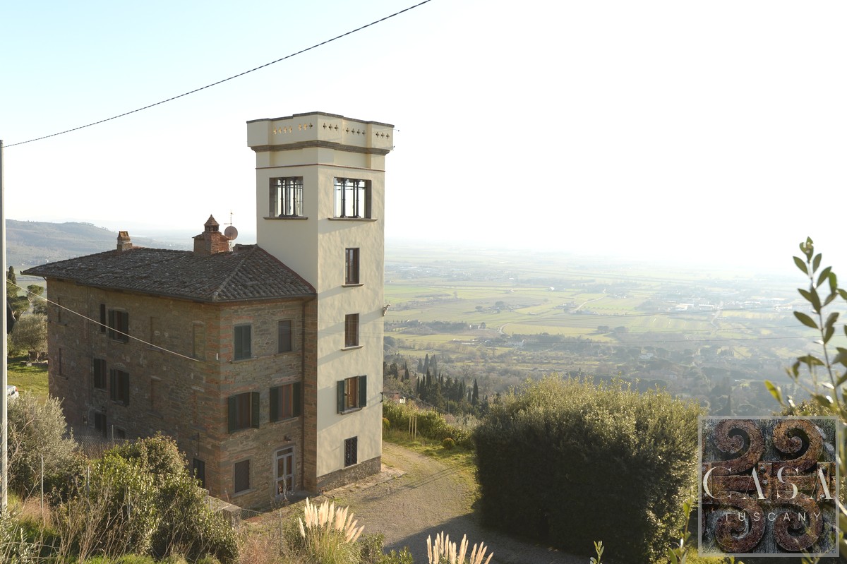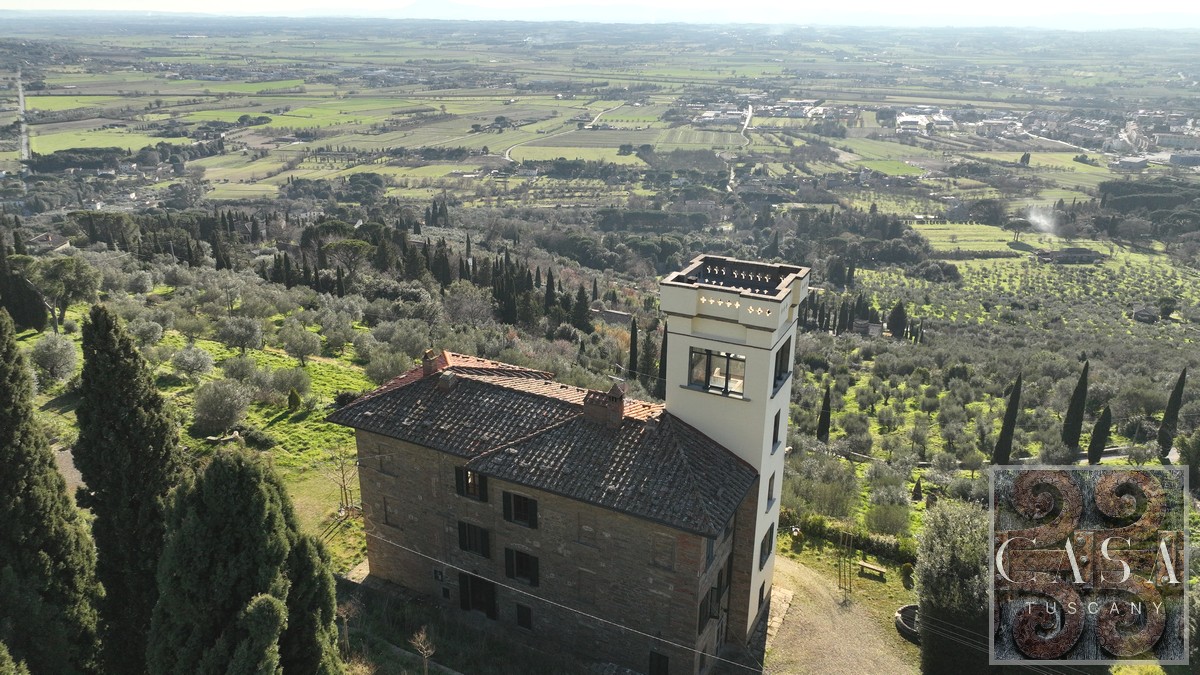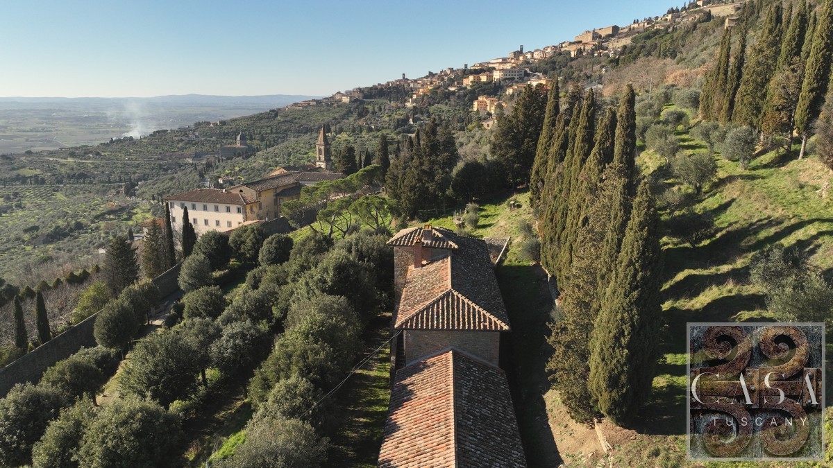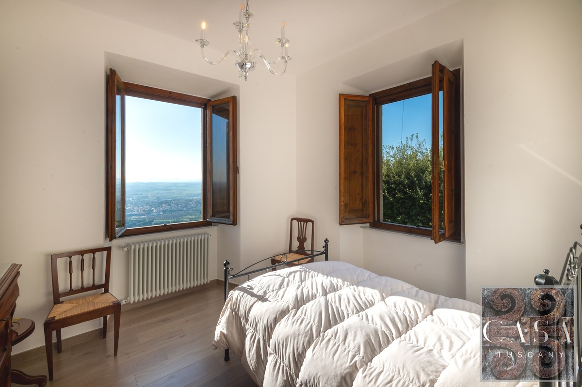 In the rolling hills near Cortona, a historic home dating from the late 1800s, facing south/west and with a 360-degree view, sunny dawn to dusk and with a spectacular view of the valley below, of Lake Trasimeno and Cortona. Just 800 m from Cortona, the location allows you to reach the historic town also on foot, taking about 10 minutes through a park. Despite its proximity to the beating heart of the town, the villa enjoys absolute privacy. The silence is interrupted only by the rustling of the wind in the trees and the singing of birds.