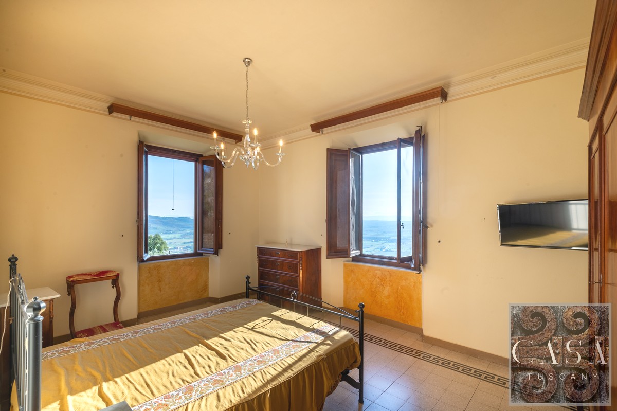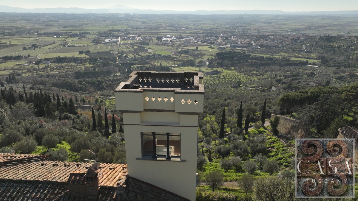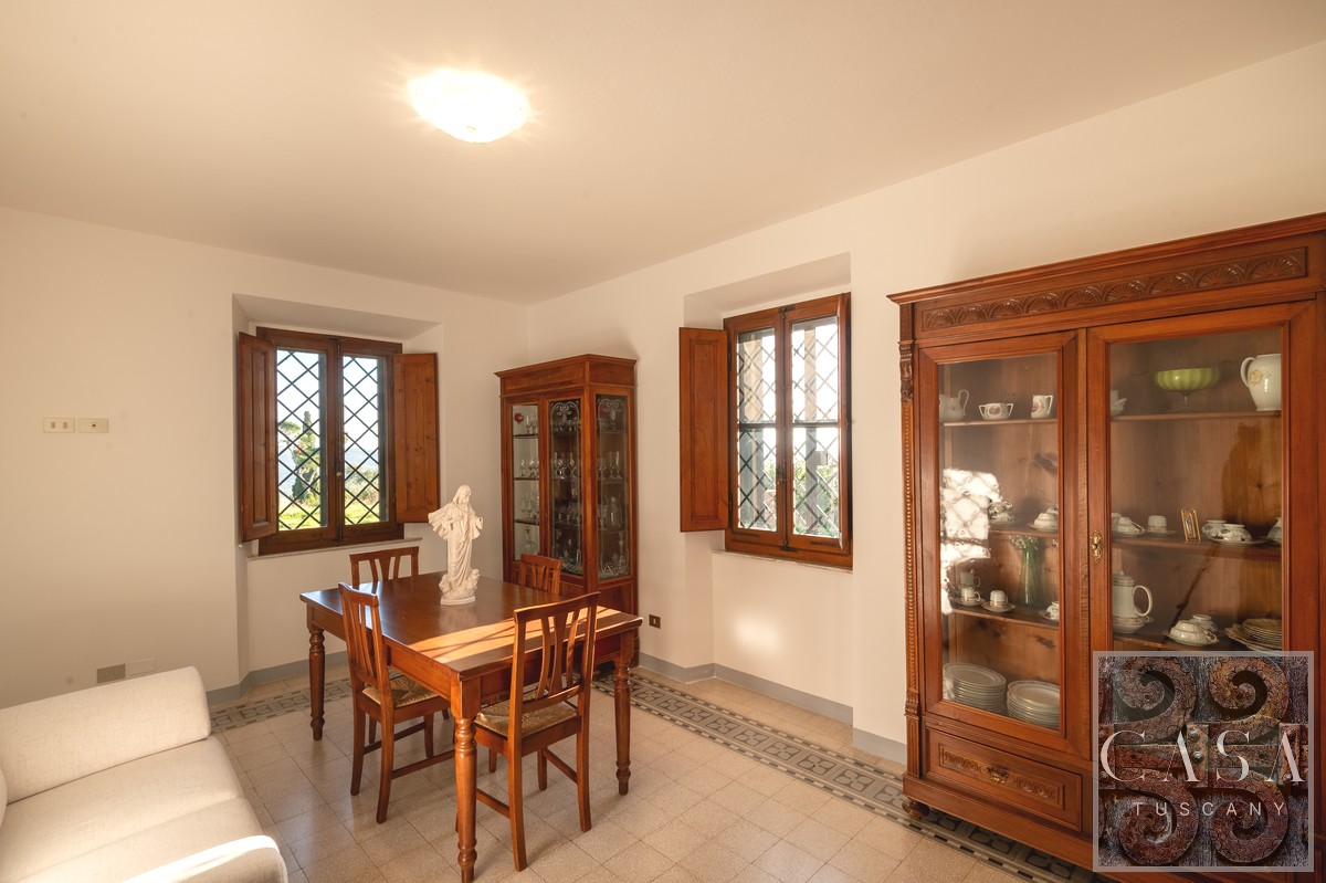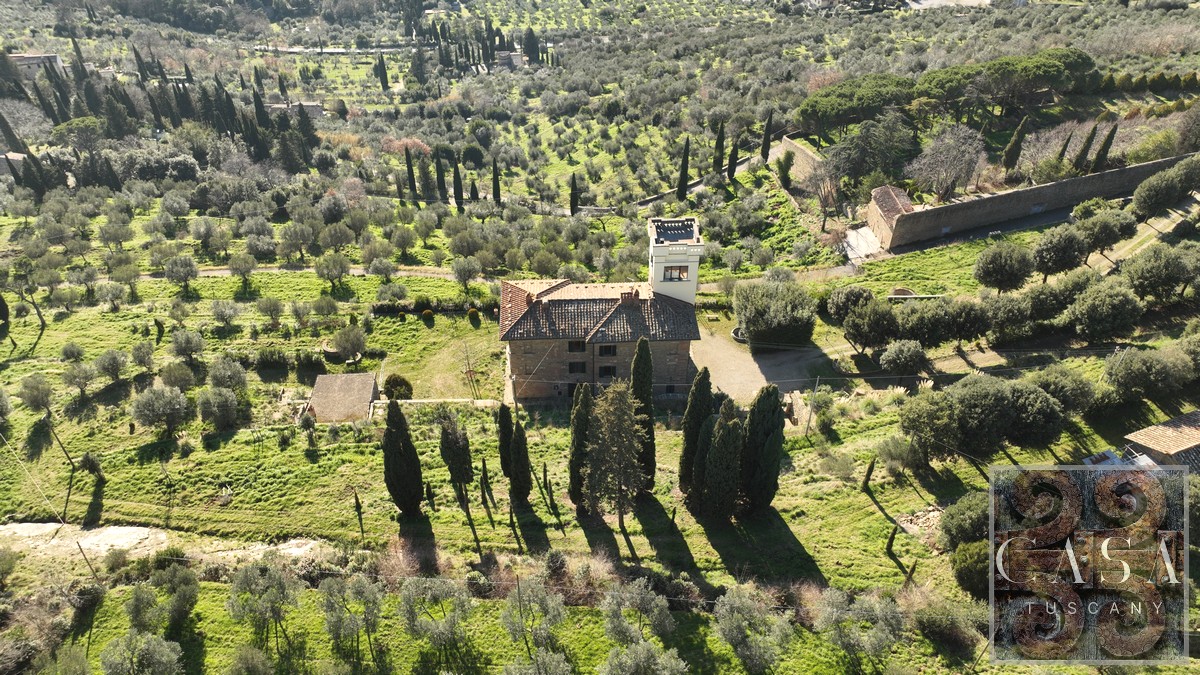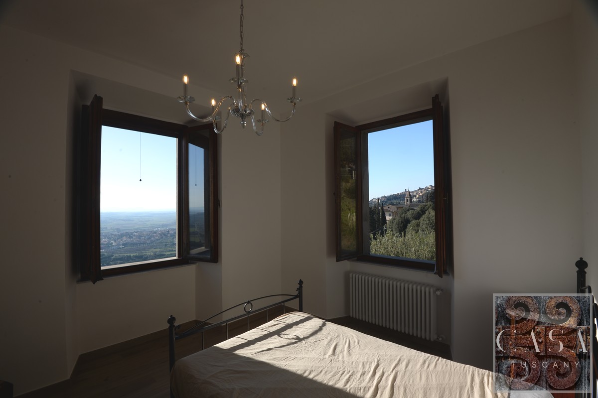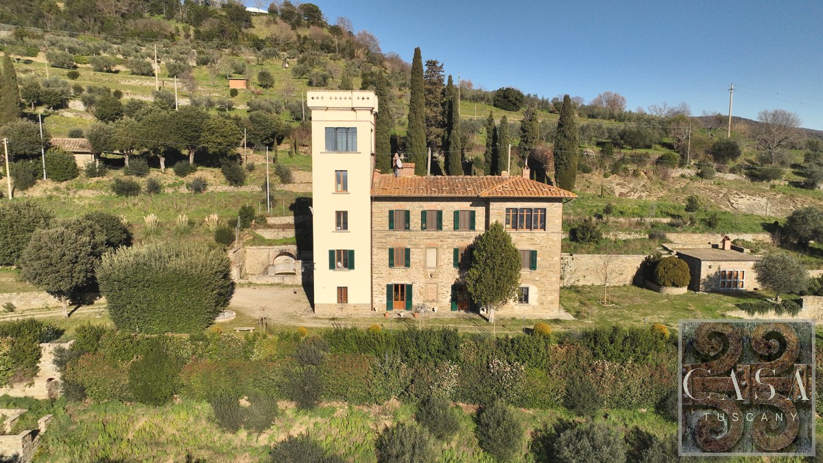 In the rolling hills near Cortona, a historic home dating from the late 1800s, facing south/west and with a 360-degree view, sunny dawn to dusk and with a spectacular view of the valley below, of Lake Trasimeno and Cortona. Just 800 m from Cortona, the location allows you to reach the historic town also on foot, taking about 10 minutes through a park. Despite its proximity to the beating heart of the town, the villa enjoys absolute privacy. The silence is interrupted only by the rustling of the wind in the trees and the singing of birds.