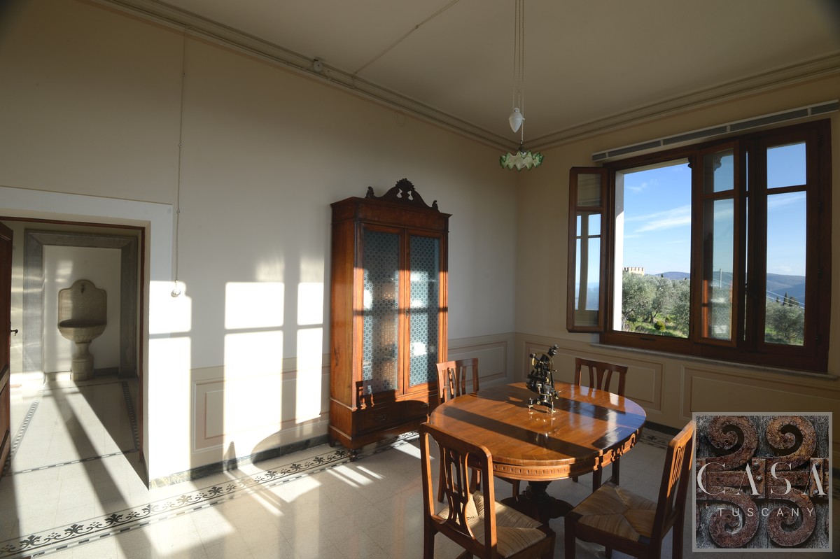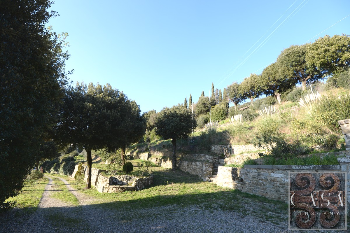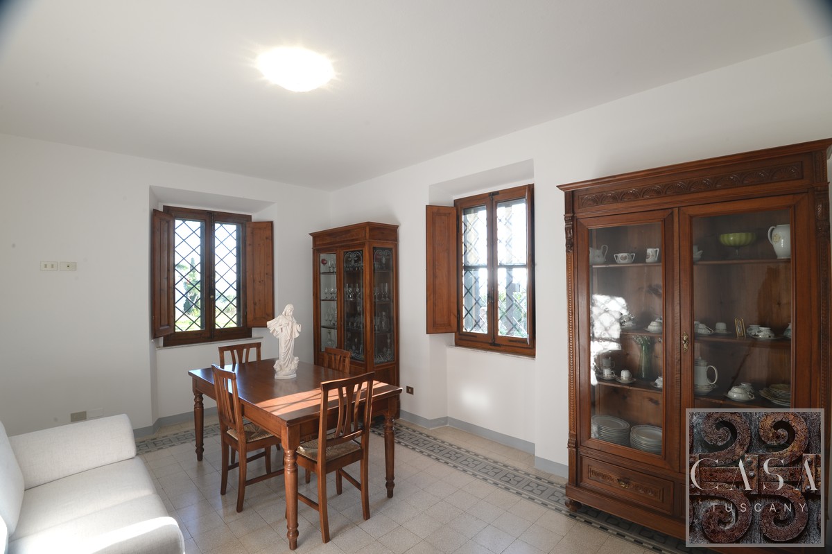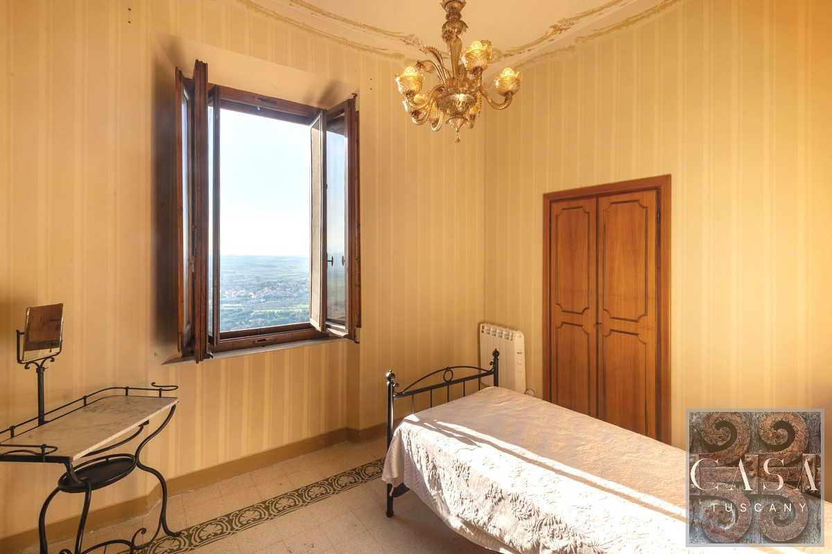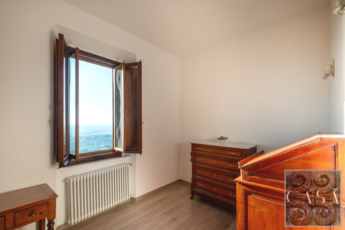 In the rolling hills near Cortona, a historic home dating from the late 1800s, facing south/west and with a 360-degree view, sunny dawn to dusk and with a spectacular view of the valley below, of Lake Trasimeno and Cortona. Just 800 m from Cortona, the location allows you to reach the historic town also on foot, taking about 10 minutes through a park. Despite its proximity to the beating heart of the town, the villa enjoys absolute privacy. The silence is interrupted only by the rustling of the wind in the trees and the singing of birds.