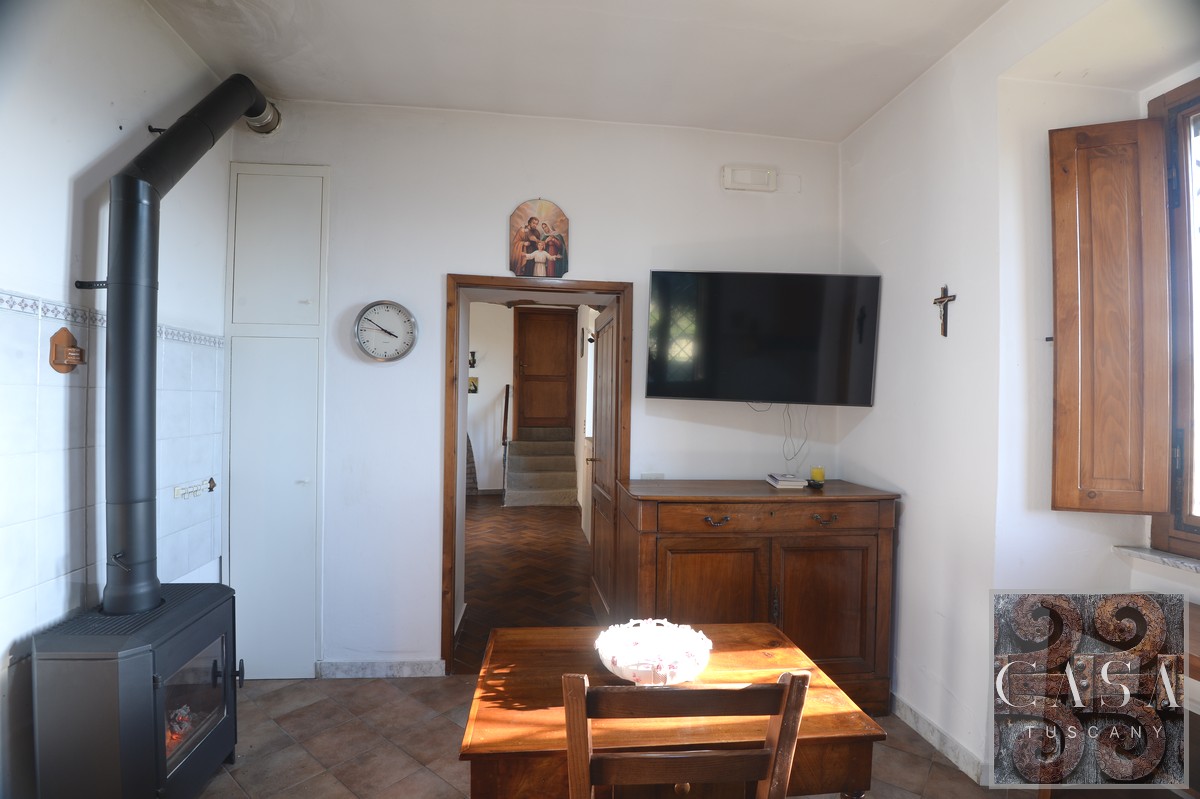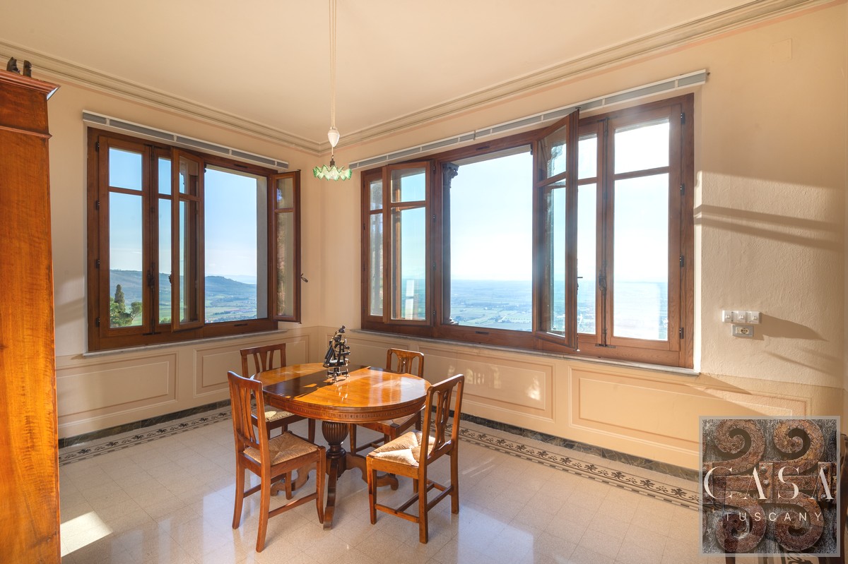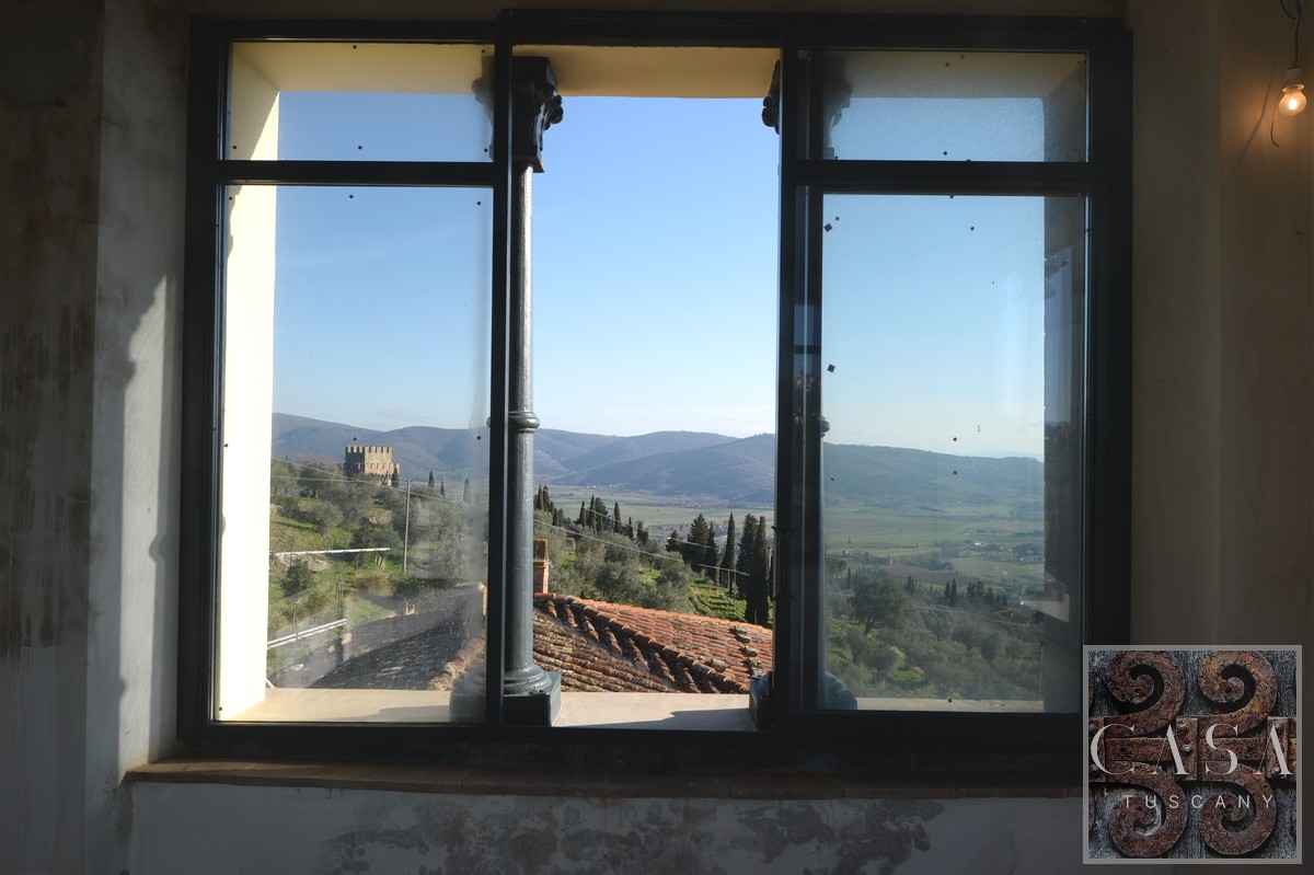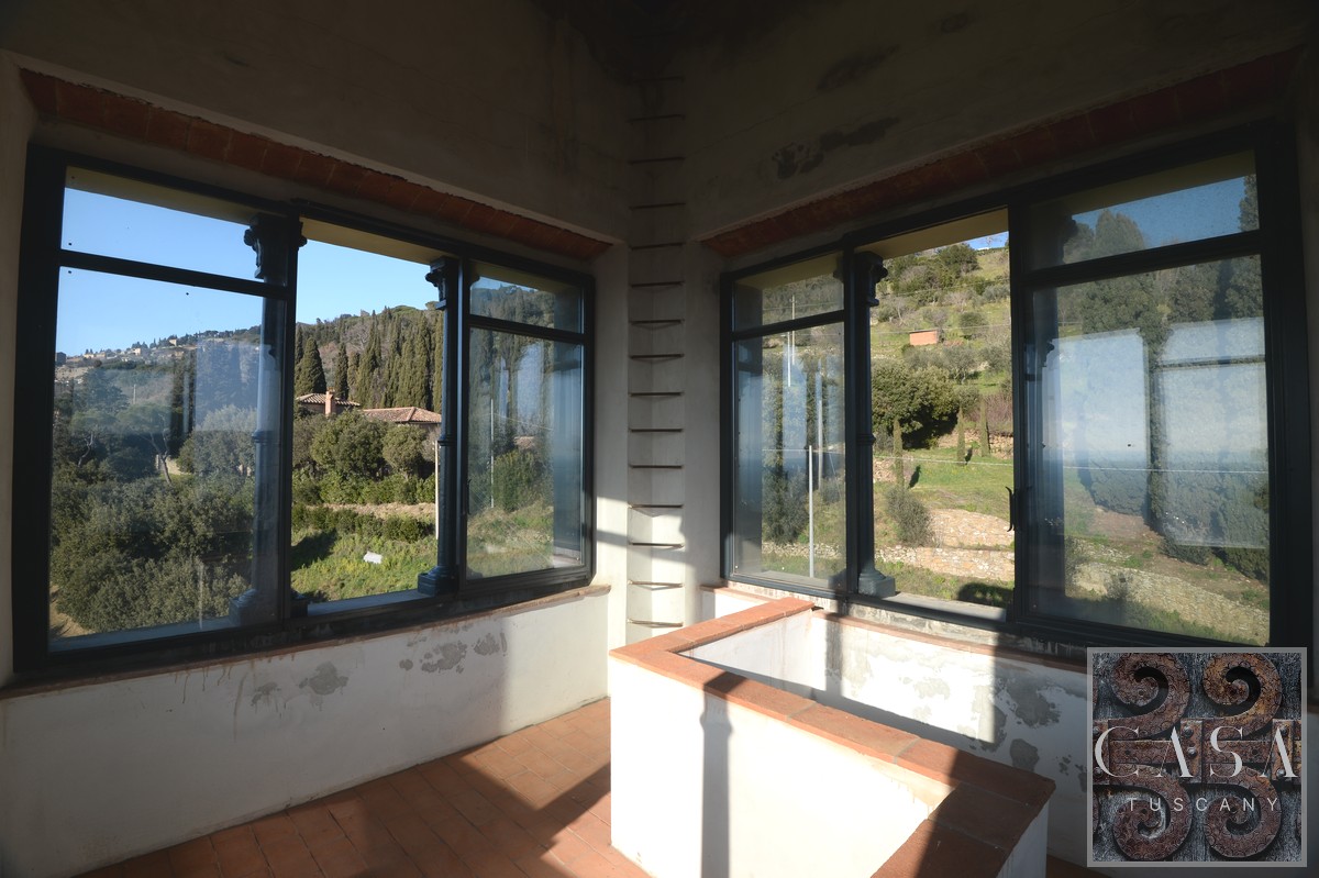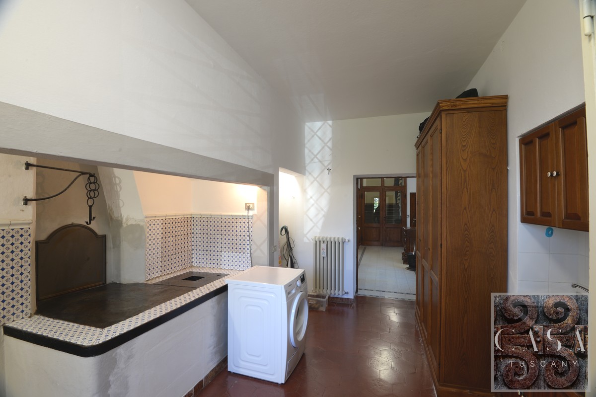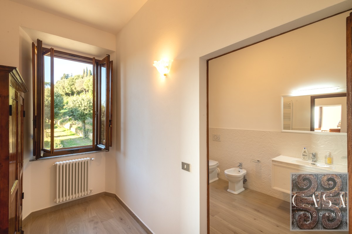 In the rolling hills near Cortona, a historic home dating from the late 1800s, facing south/west and with a 360-degree view, sunny dawn to dusk and with a spectacular view of the valley below, of Lake Trasimeno and Cortona. Just 800 m from Cortona, the location allows you to reach the historic town also on foot, taking about 10 minutes through a park. Despite its proximity to the beating heart of the town, the villa enjoys absolute privacy. The silence is interrupted only by the rustling of the wind in the trees and the singing of birds.