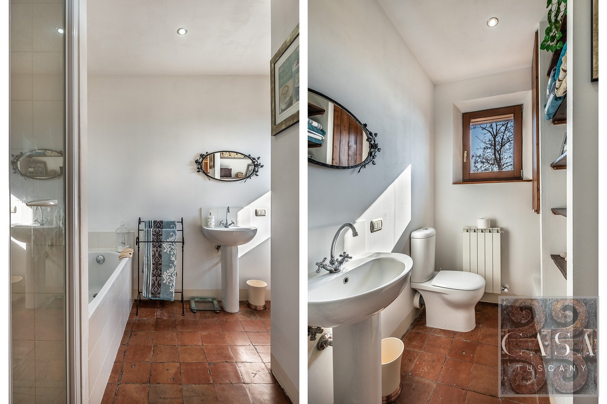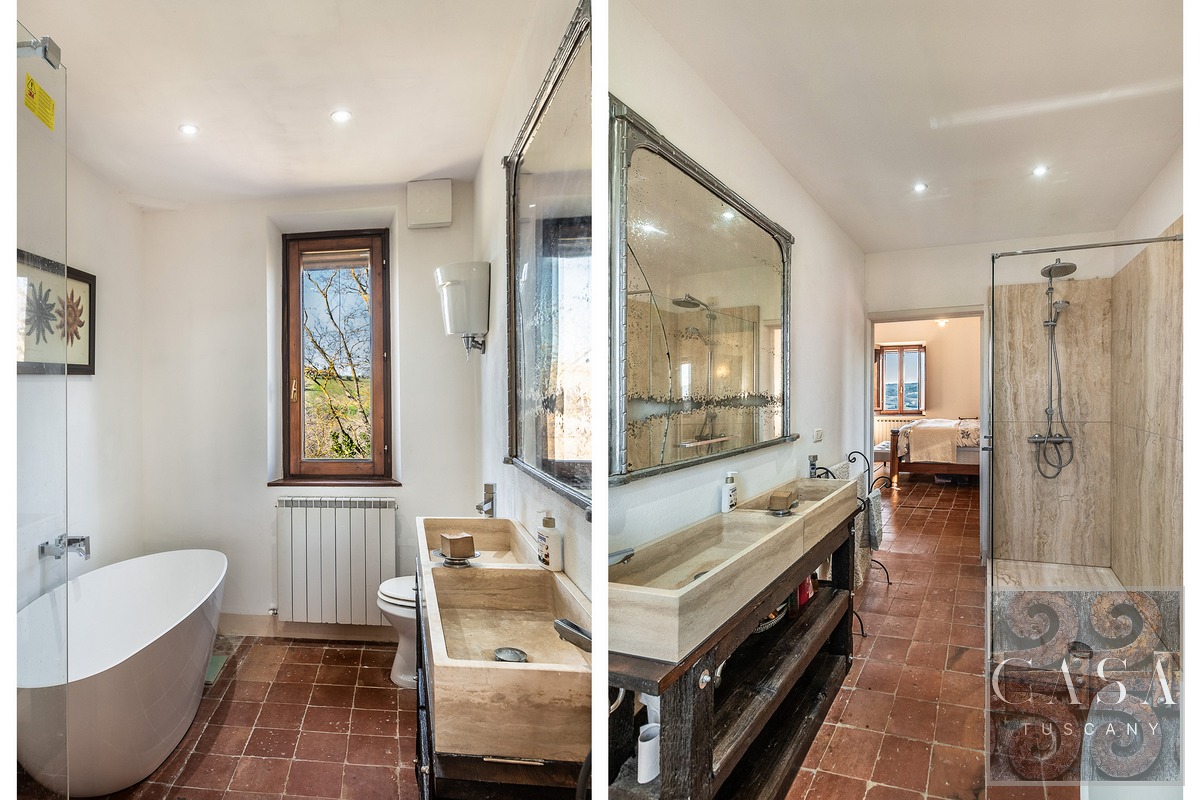 On the second floor, a covered loggia becomes a delightful nook for relaxing, while a spacious living room with bookshelves, double windows and a cast-iron stove opens on to the bedrooms: a generous main bedroom with closets and private bathroom, two bedrooms with en suite bathrooms, two additional bedrooms and a family bathroom.