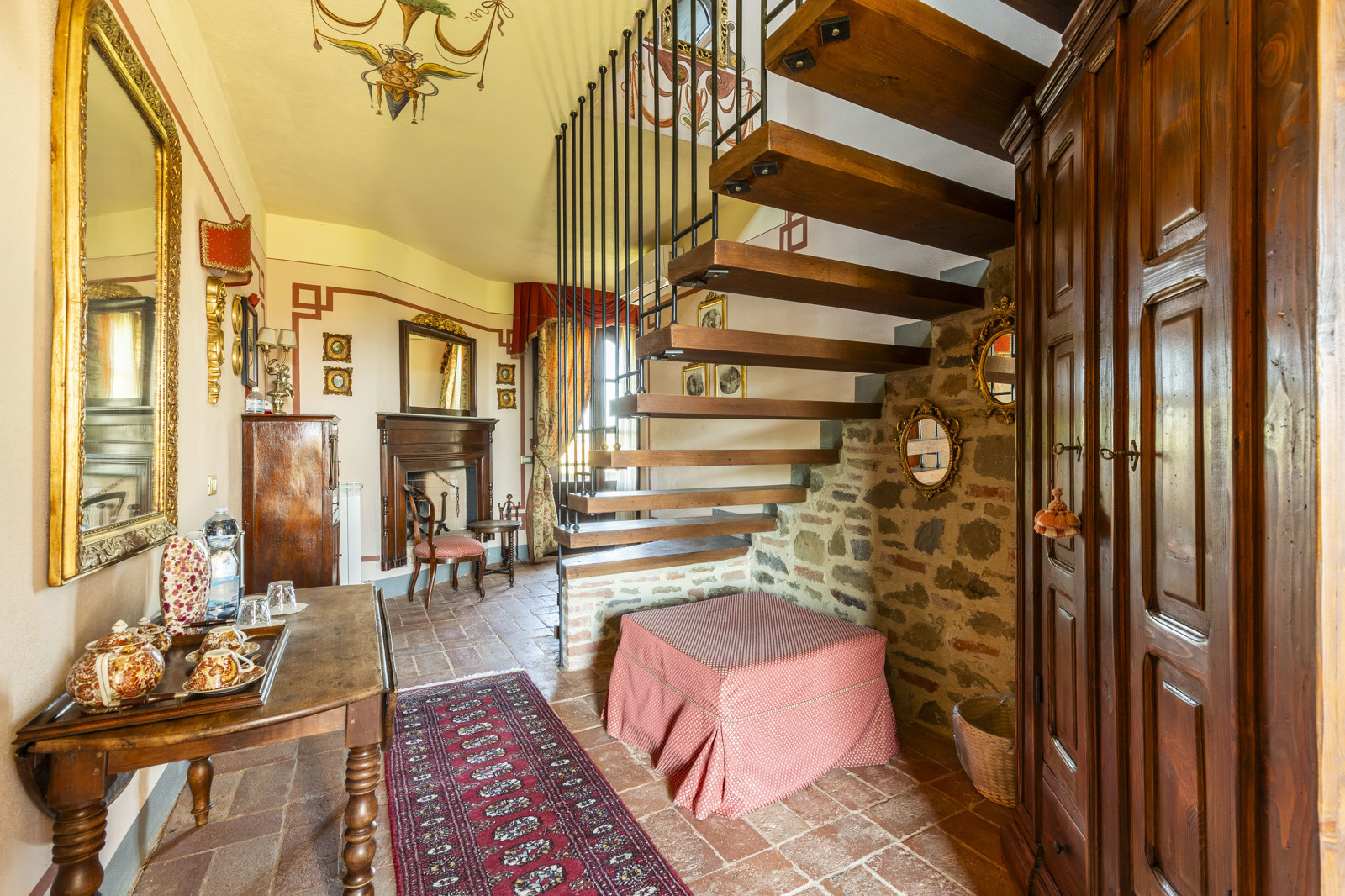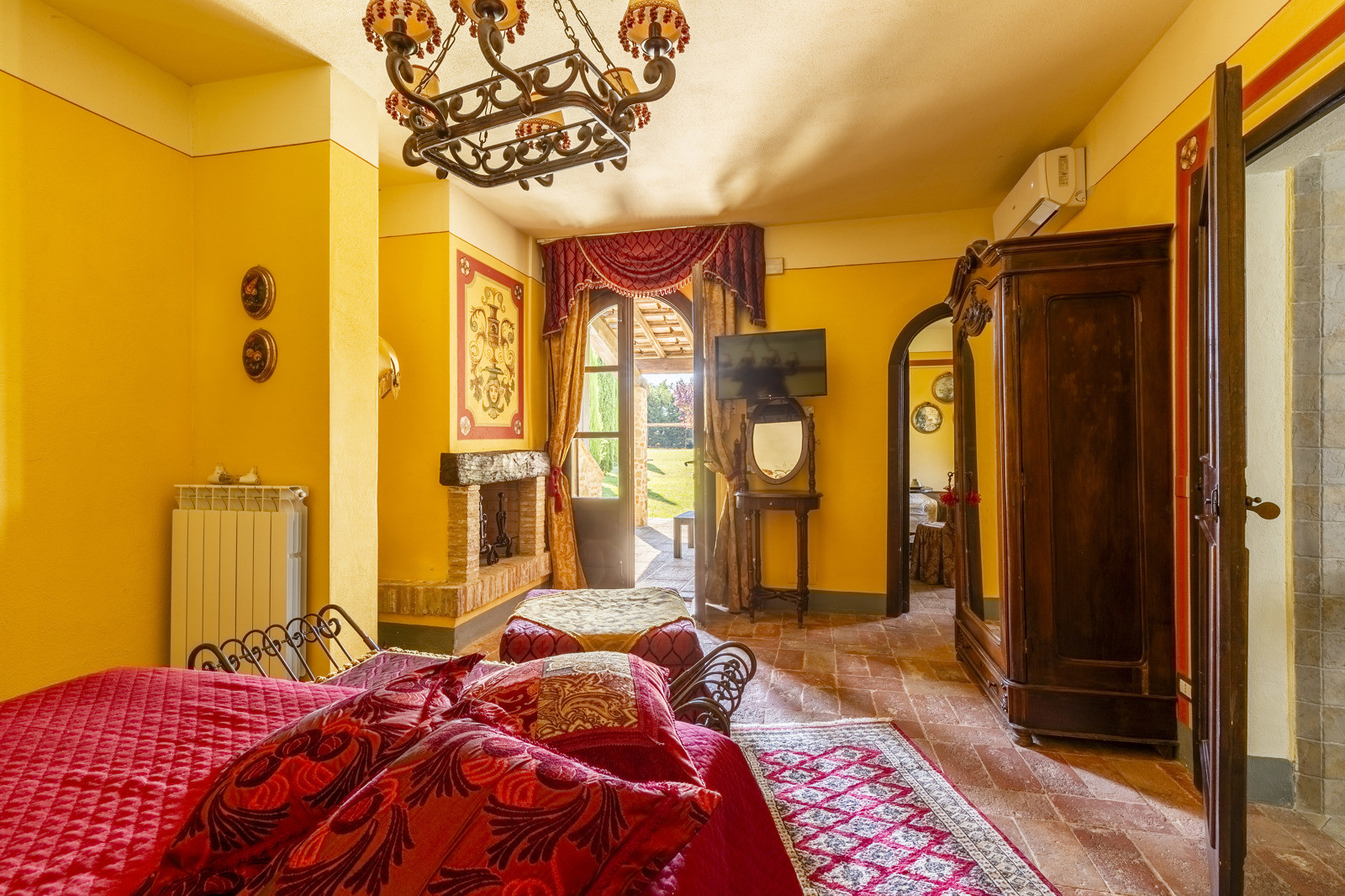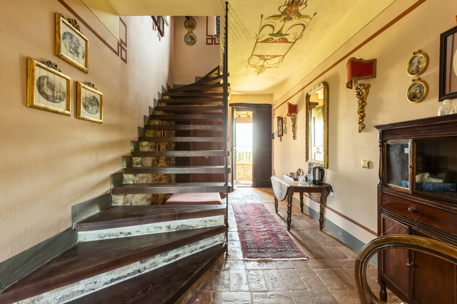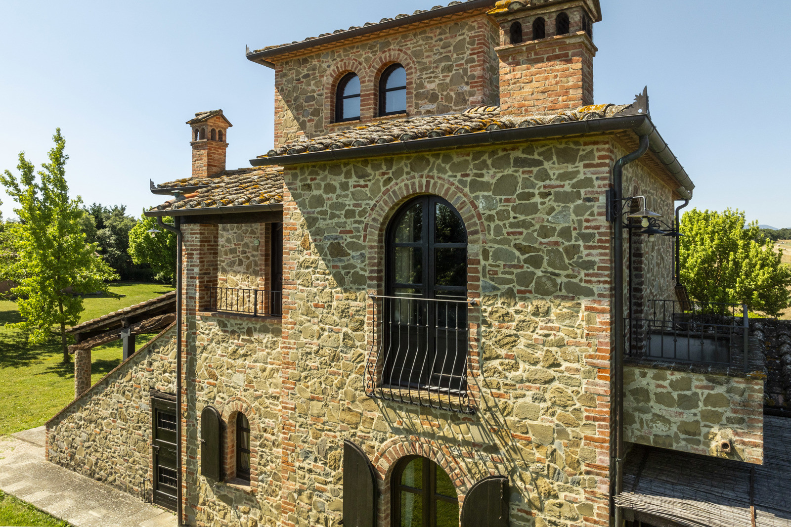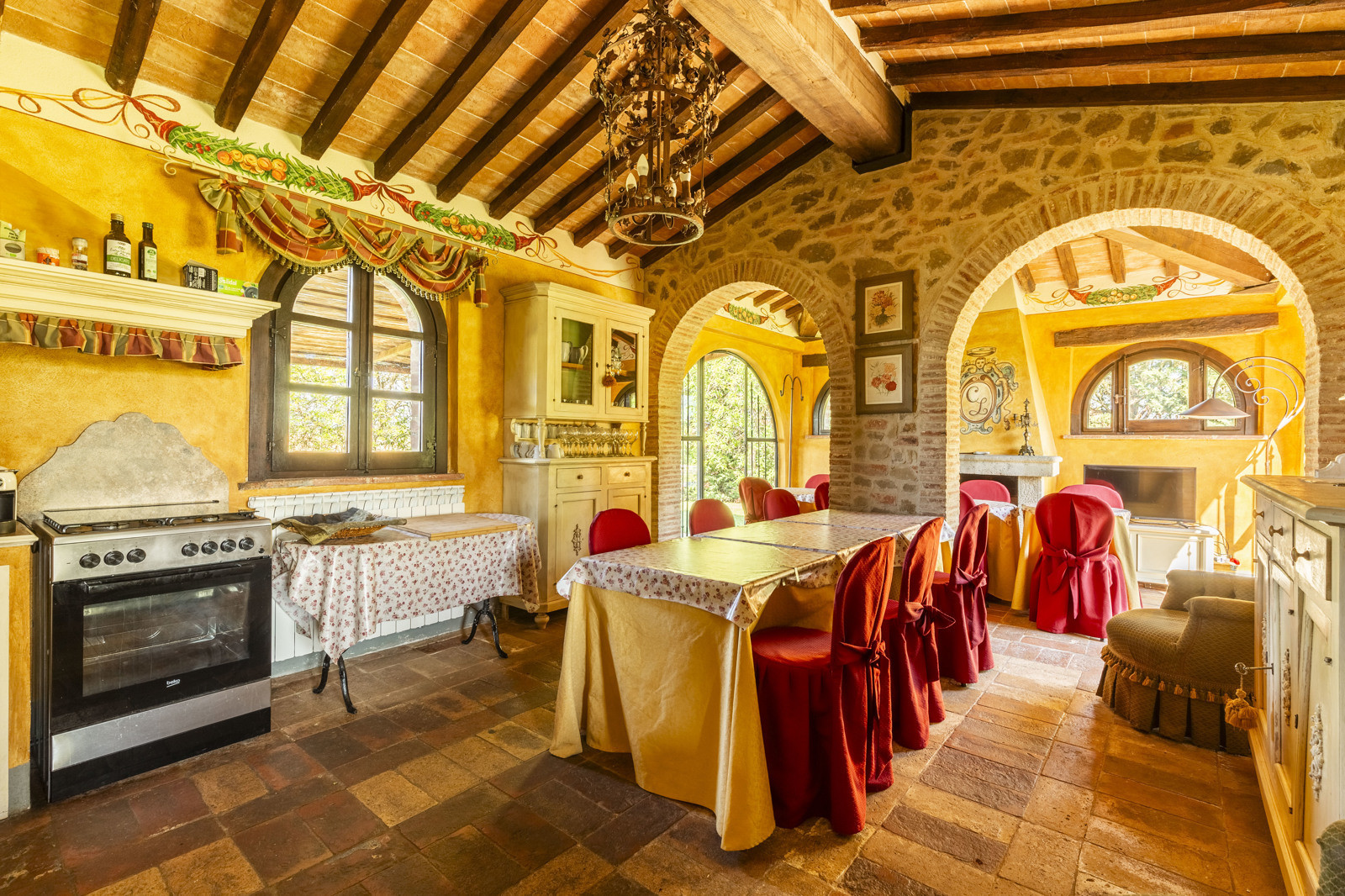 A characteristic outdoor staircase with a loggia leads to the upper floor, where there is a second kitchen and four more bedrooms, including a particularly striking one in the tower, with charming arched windows and breathtaking views across the typical Umbrian-Tuscan landscape. All rooms are furnished in modern taste, with touches of 18th-century inspiration, including frescoes and hand-painted decorations, fine fabrics and elegant furniture.