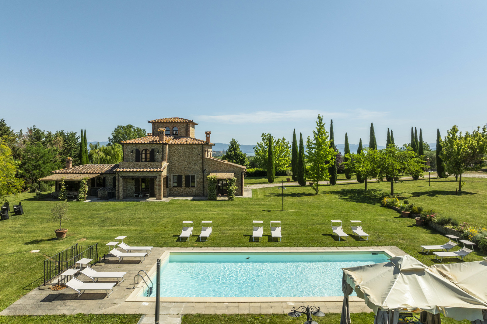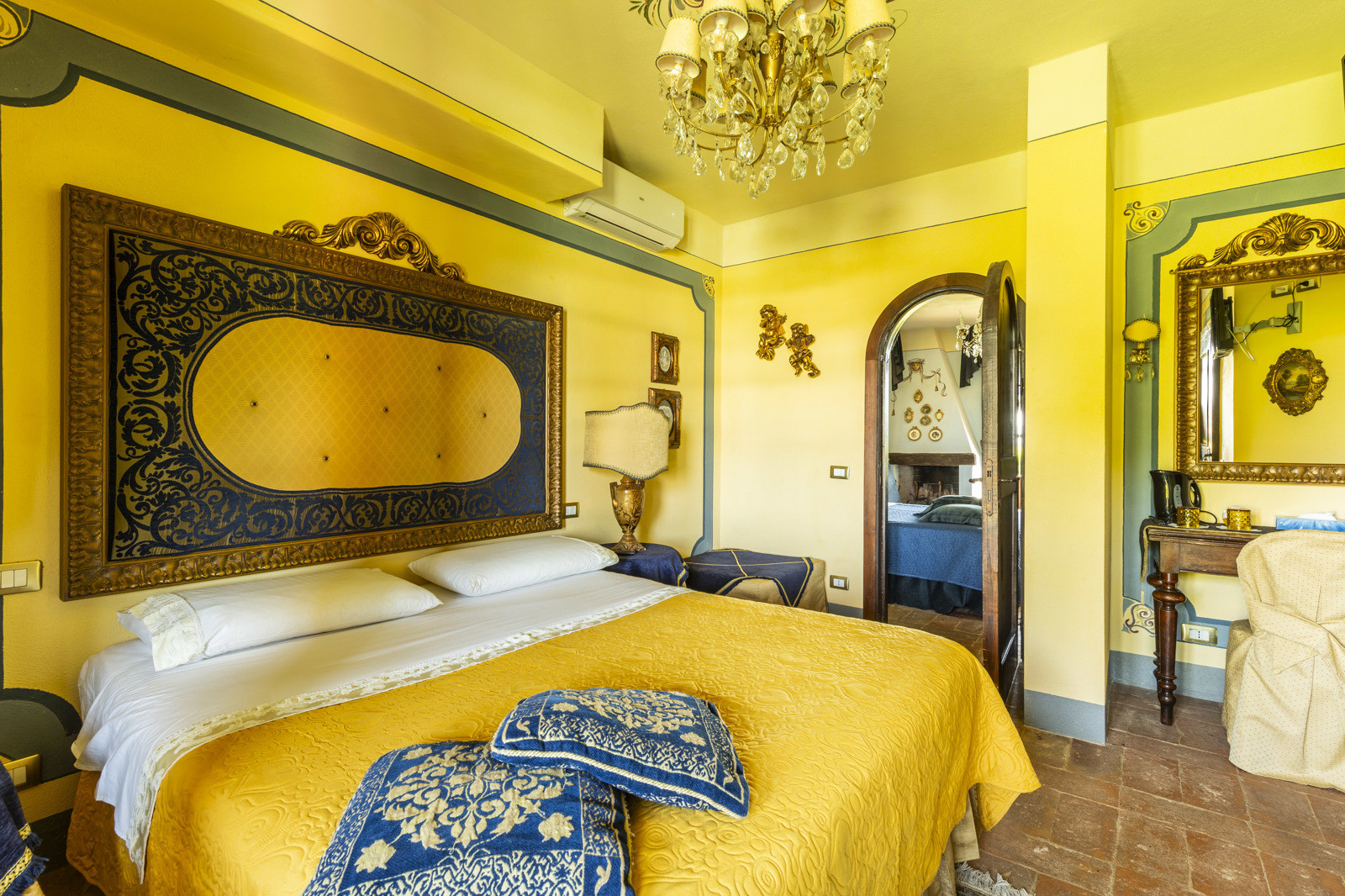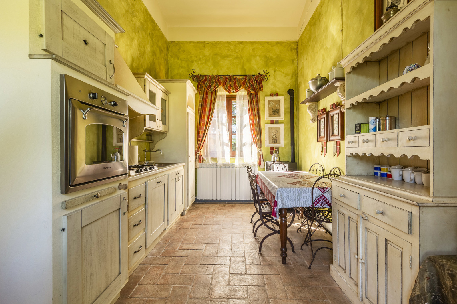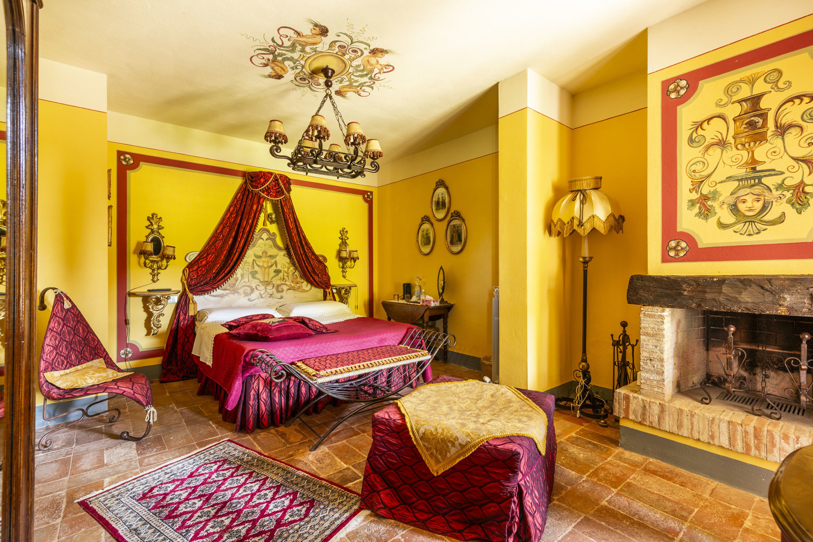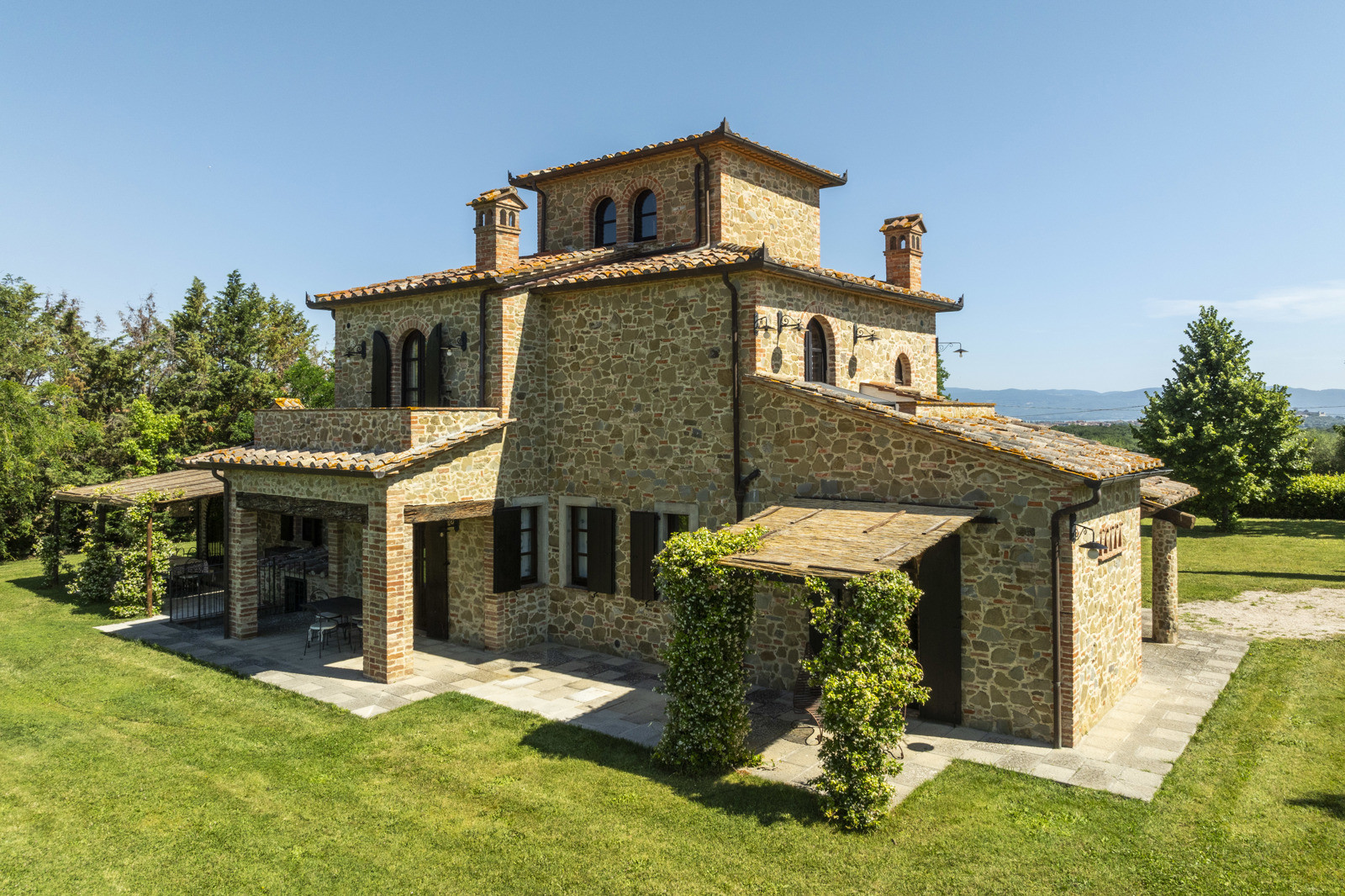 A characteristic outdoor staircase with a loggia leads to the upper floor, where there is a second kitchen and four more bedrooms, including a particularly striking one in the tower, with charming arched windows and breathtaking views across the typical Umbrian-Tuscan landscape. All rooms are furnished in modern taste, with touches of 18th-century inspiration, including frescoes and hand-painted decorations, fine fabrics and elegant furniture.