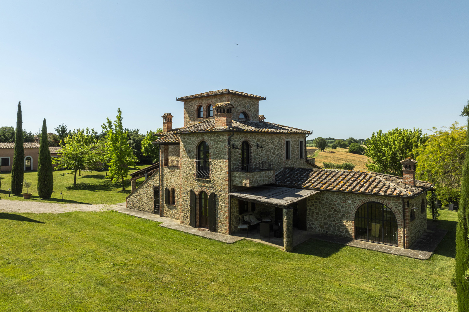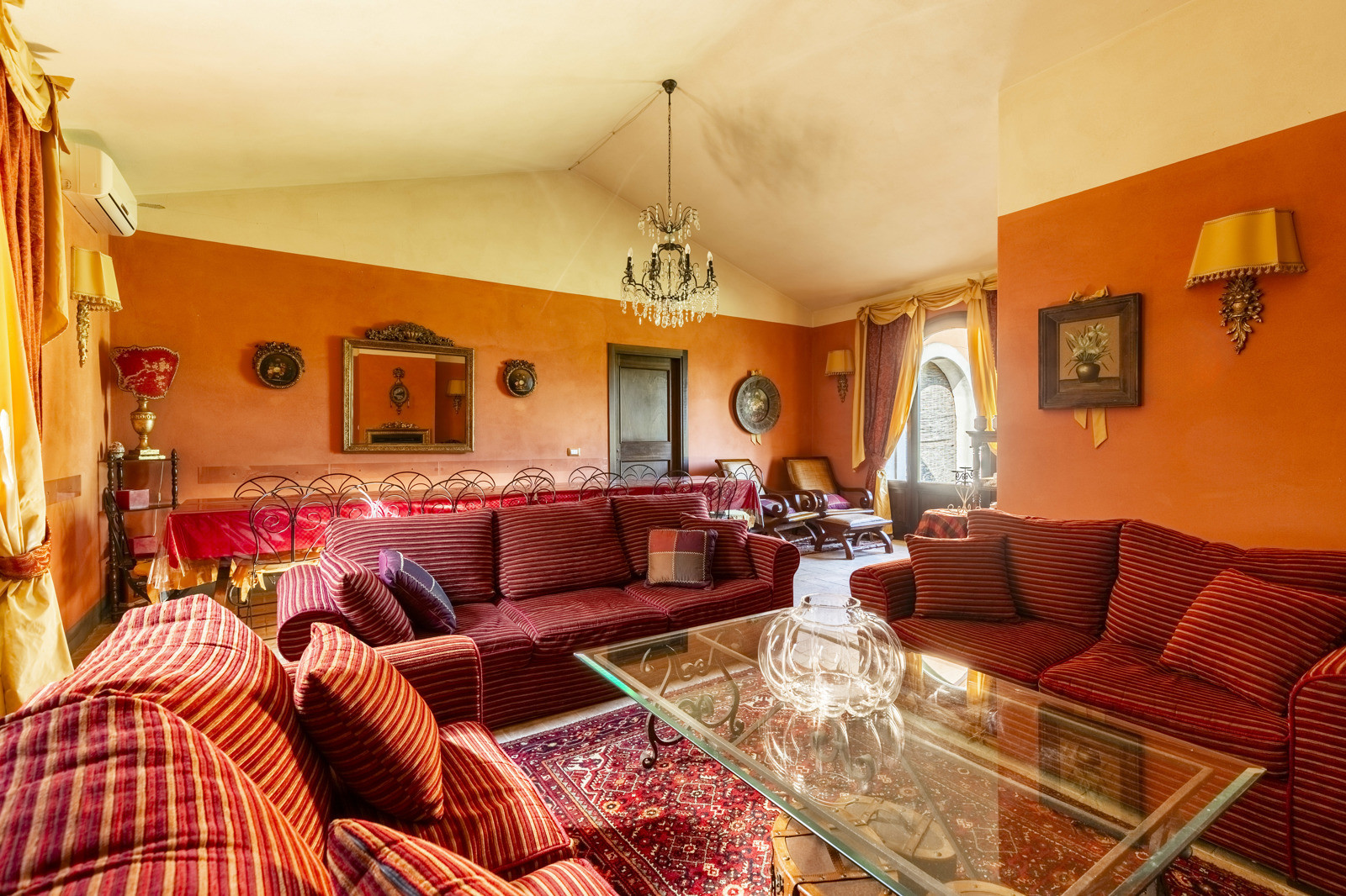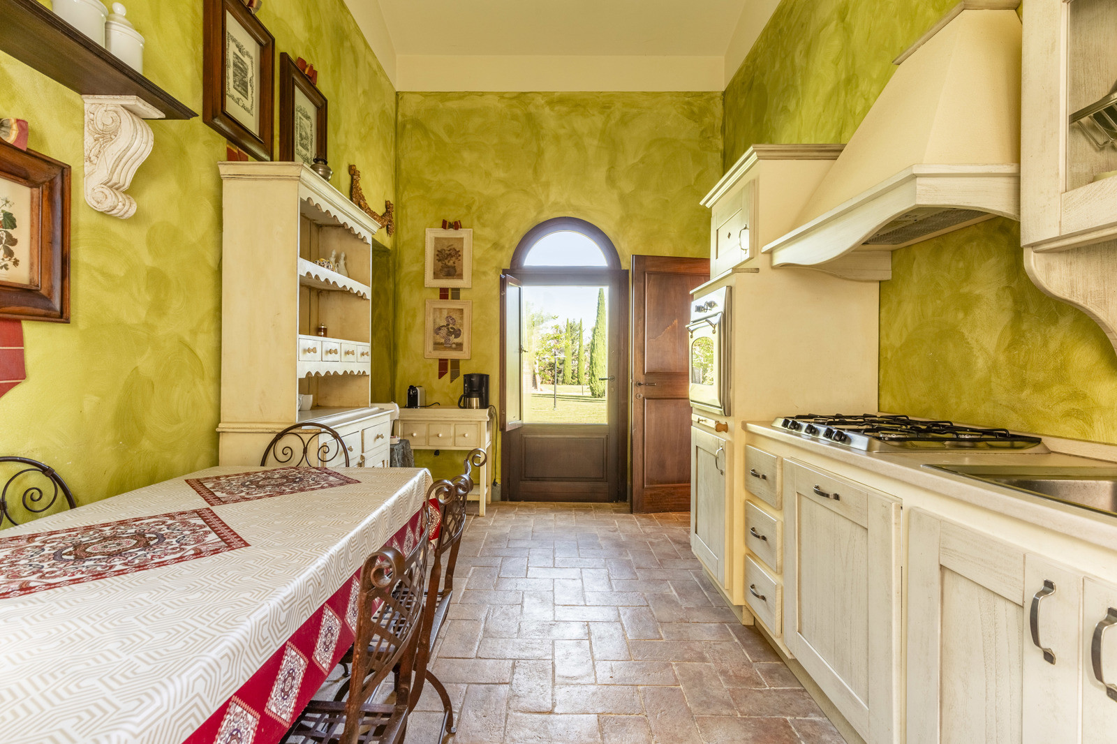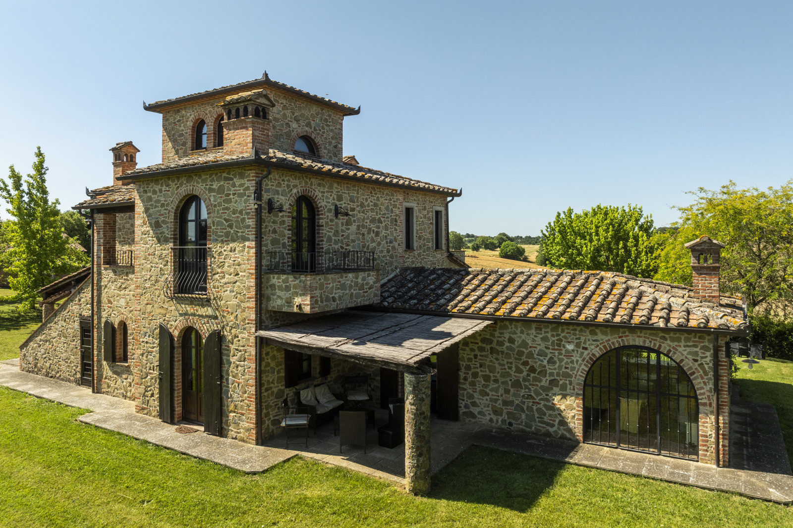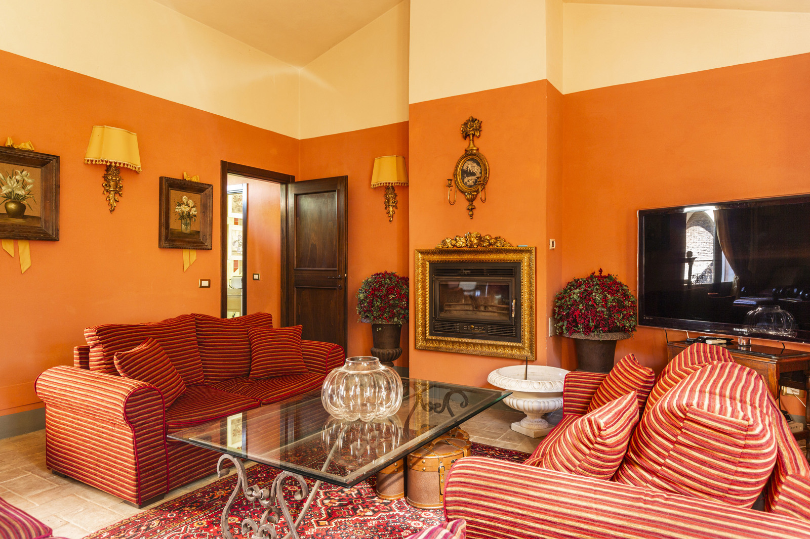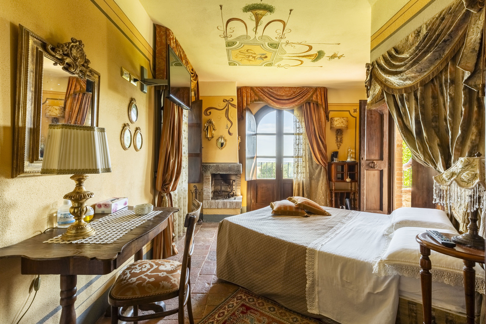 A characteristic outdoor staircase with a loggia leads to the upper floor, where there is a second kitchen and four more bedrooms, including a particularly striking one in the tower, with charming arched windows and breathtaking views across the typical Umbrian-Tuscan landscape. All rooms are furnished in modern taste, with touches of 18th-century inspiration, including frescoes and hand-painted decorations, fine fabrics and elegant furniture.