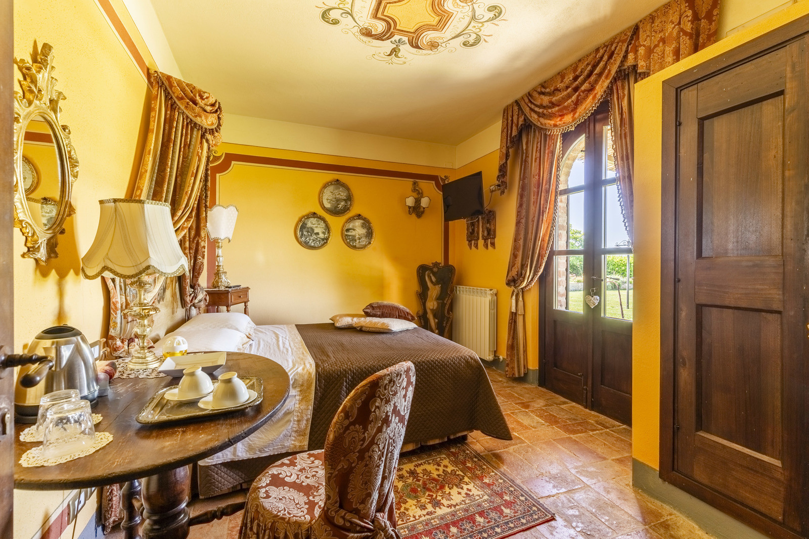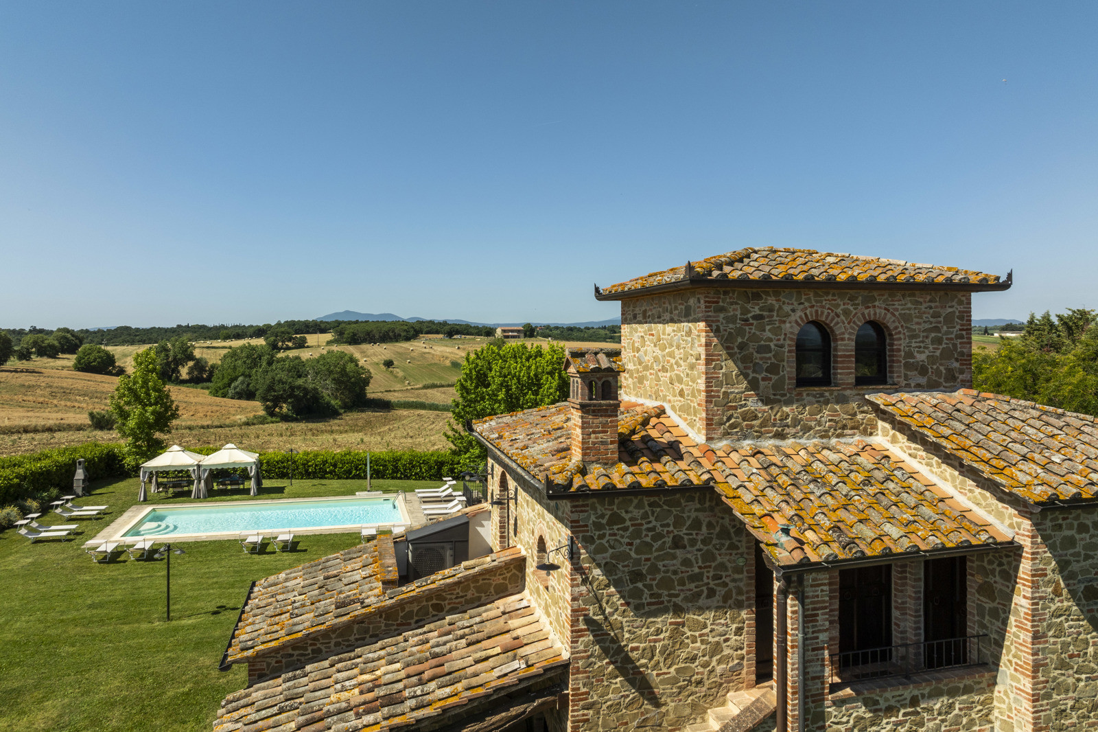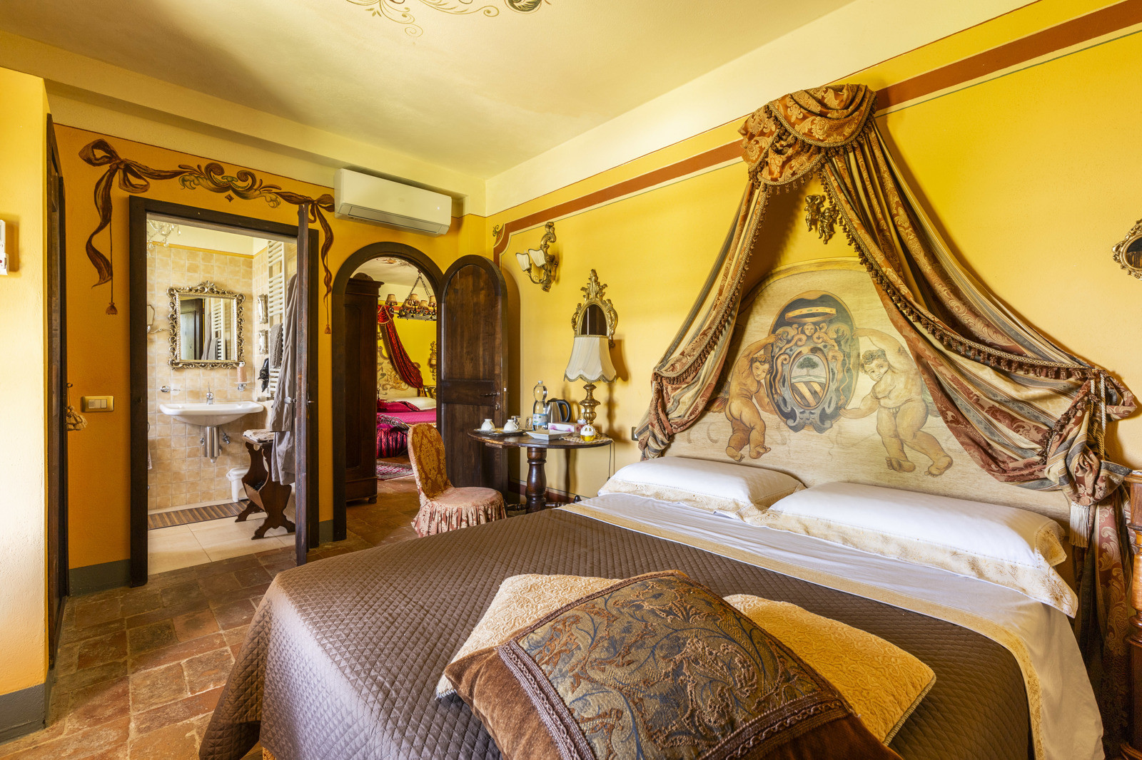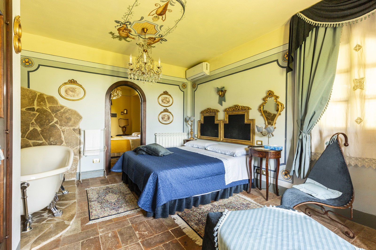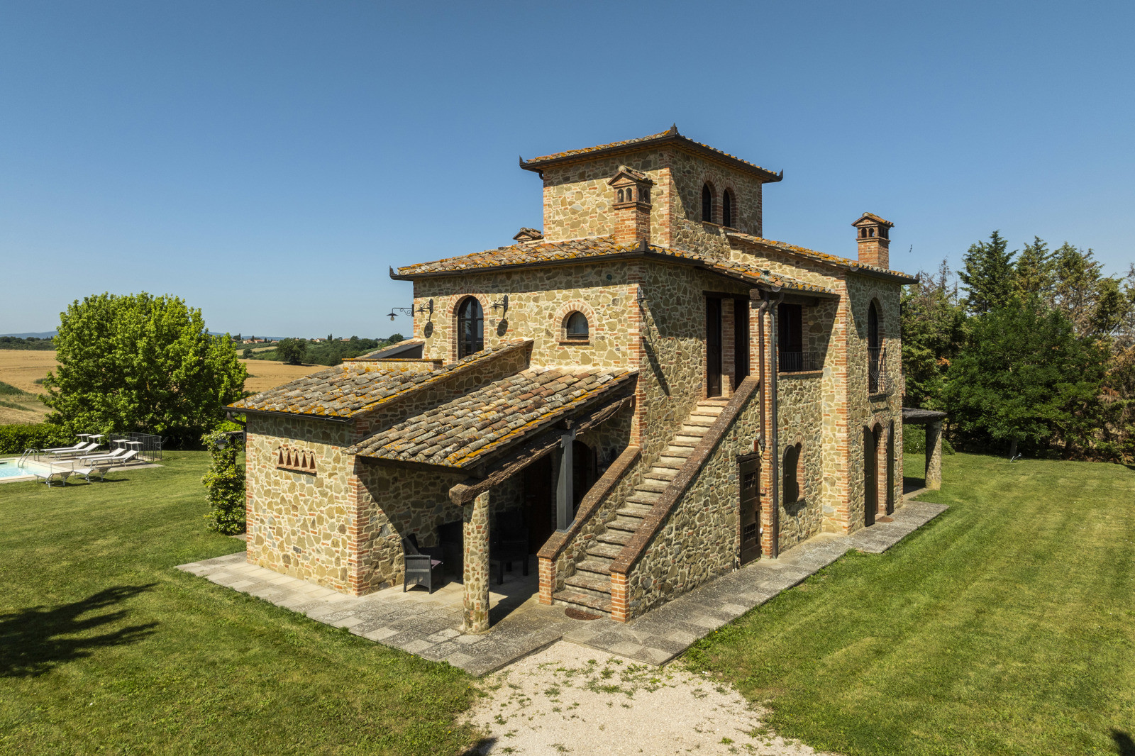 A characteristic outdoor staircase with a loggia leads to the upper floor, where there is a second kitchen and four more bedrooms, including a particularly striking one in the tower, with charming arched windows and breathtaking views across the typical Umbrian-Tuscan landscape. All rooms are furnished in modern taste, with touches of 18th-century inspiration, including frescoes and hand-painted decorations, fine fabrics and elegant furniture.