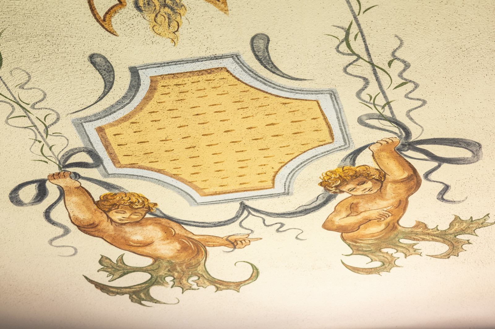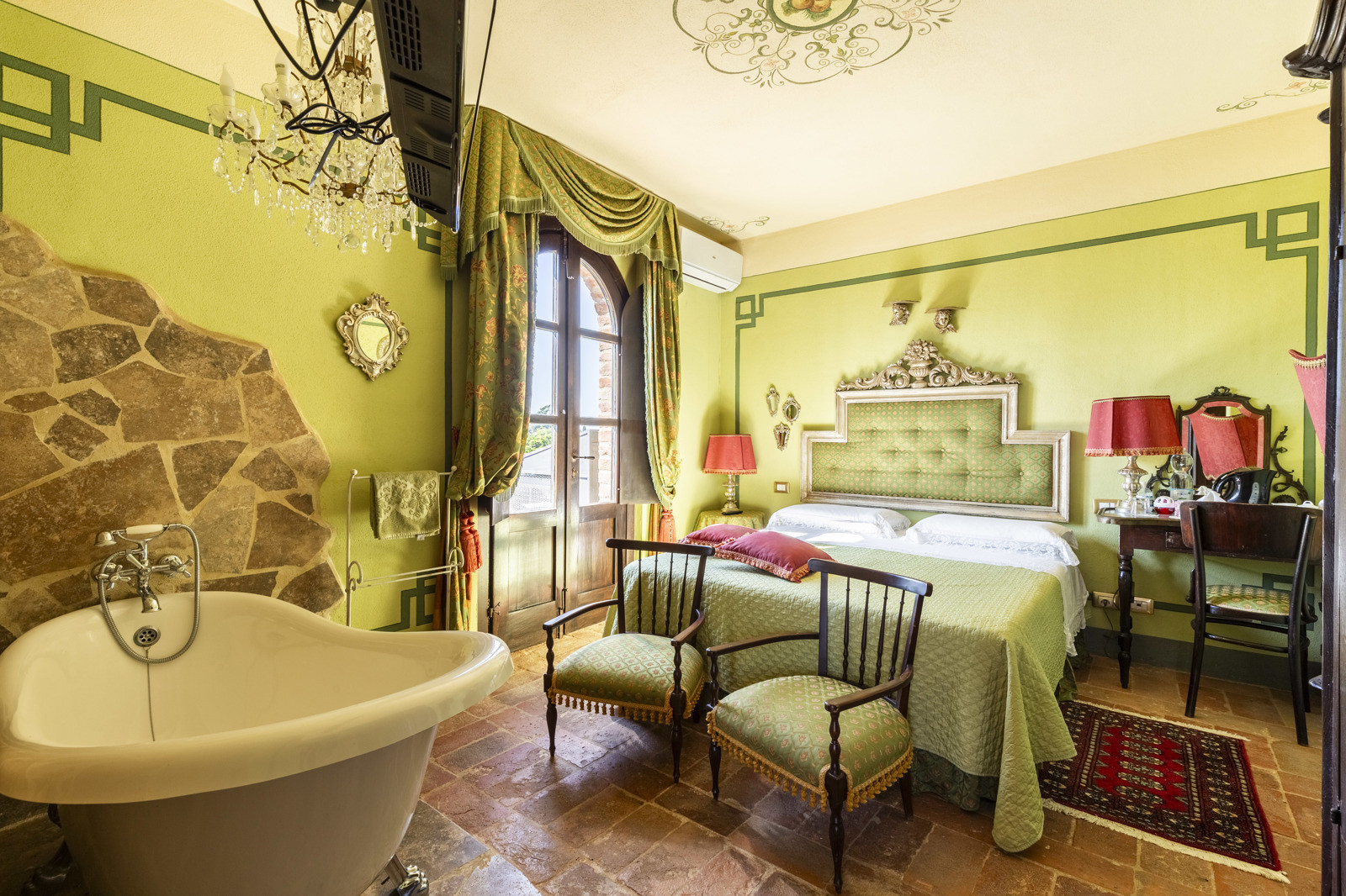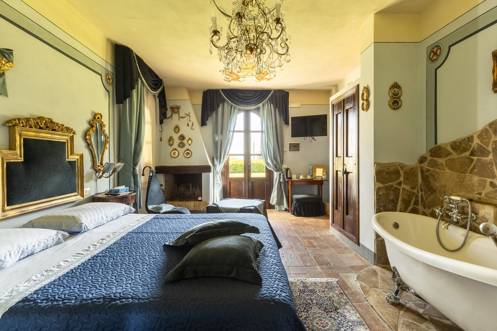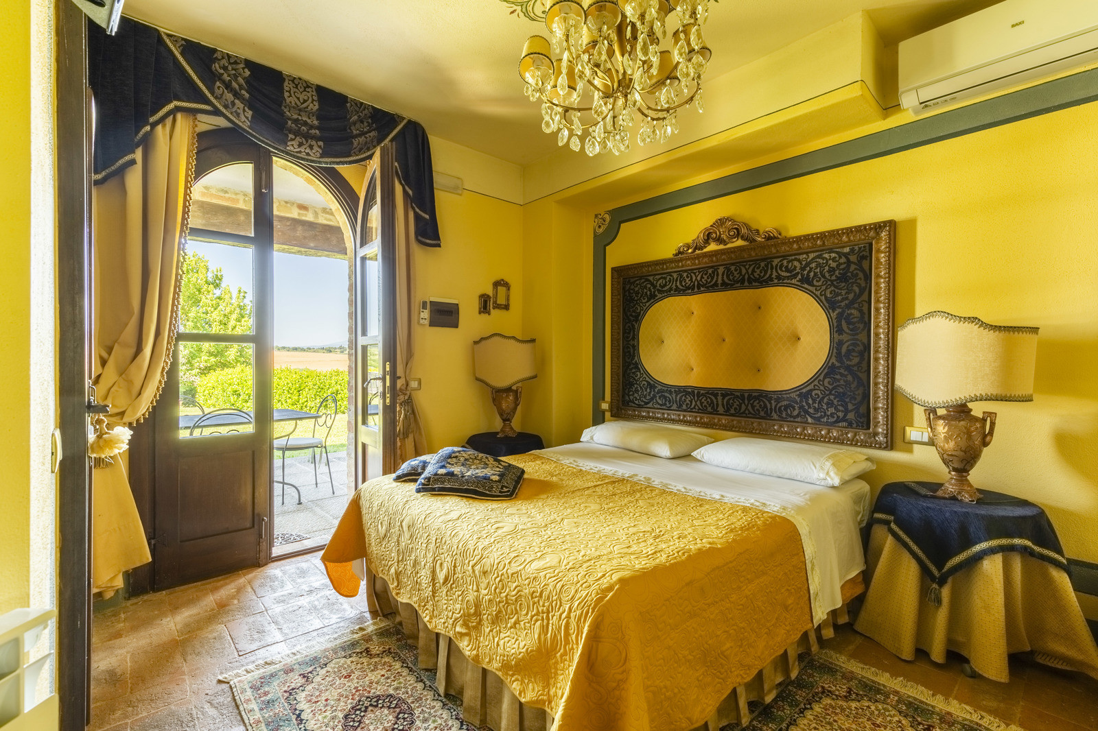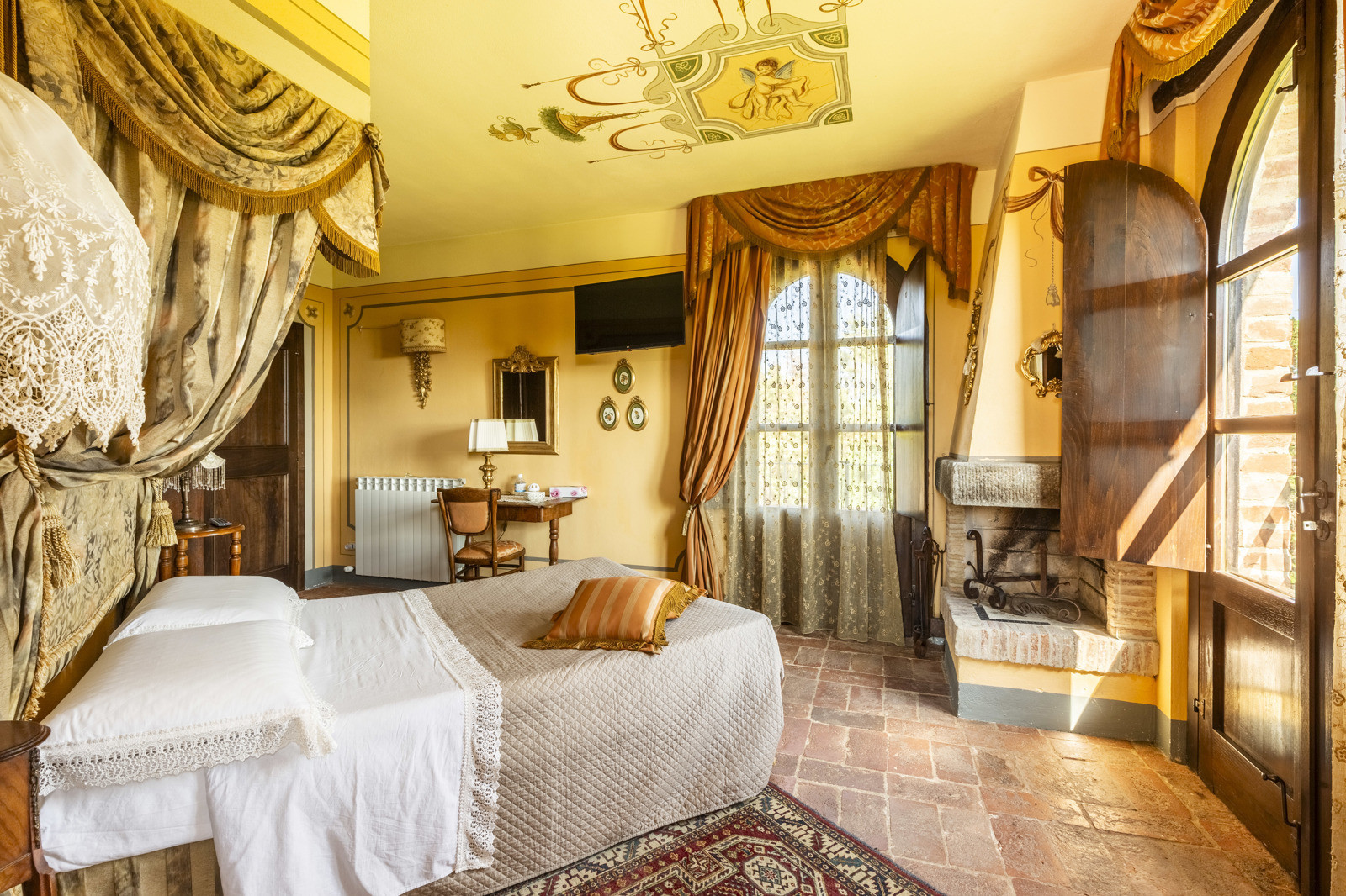 A characteristic outdoor staircase with a loggia leads to the upper floor, where there is a second kitchen and four more bedrooms, including a particularly striking one in the tower, with charming arched windows and breathtaking views across the typical Umbrian-Tuscan landscape. All rooms are furnished in modern taste, with touches of 18th-century inspiration, including frescoes and hand-painted decorations, fine fabrics and elegant furniture.