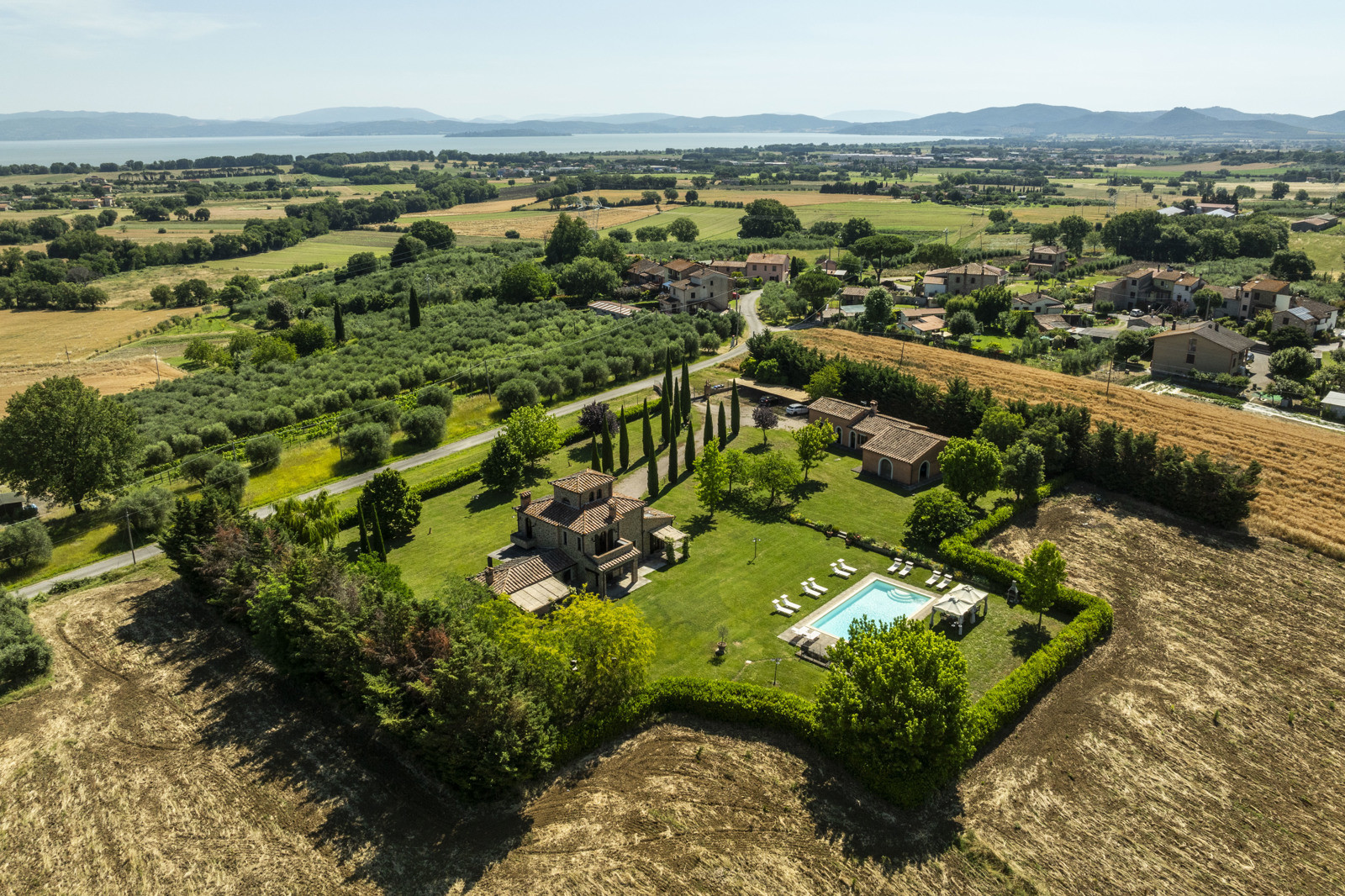 Beautifully remodeled traditional old villa with panoramic lake views and 7 lovely bedrooms plus a cottage, a swimming pool and extensive grounds, for sale near Lake Trasimeno in Umbria.