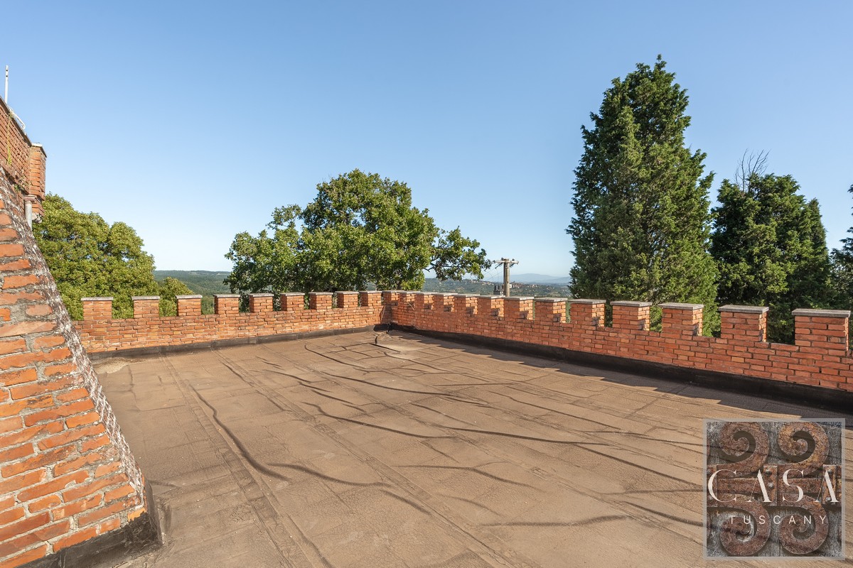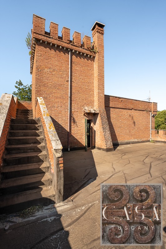 Interiors include a grand ground floor open plan living area with fireplace, and two upper floors opening onto two terraces, plus a rooftop terrace on the turret adorned with Ghibelline crenellations, offering spectacular views.