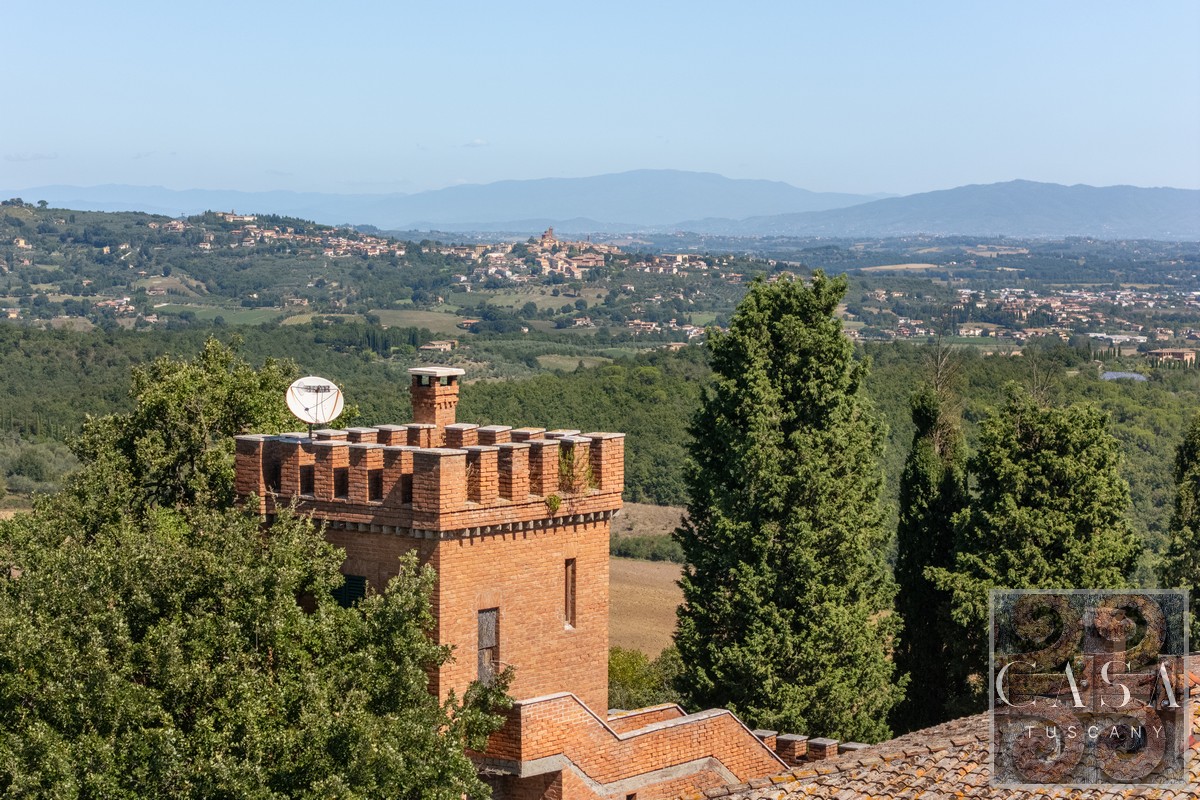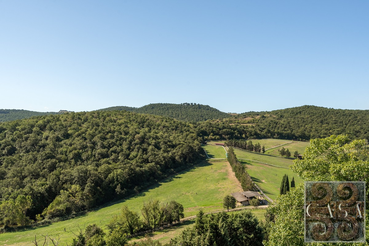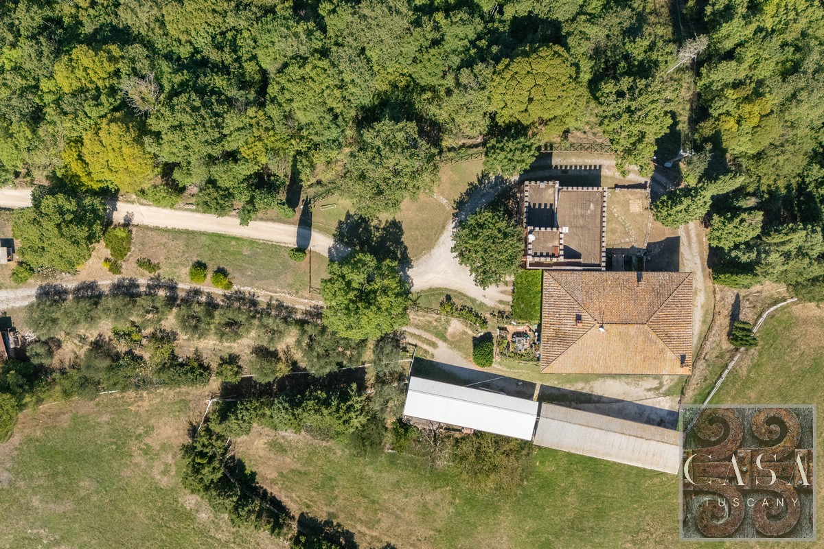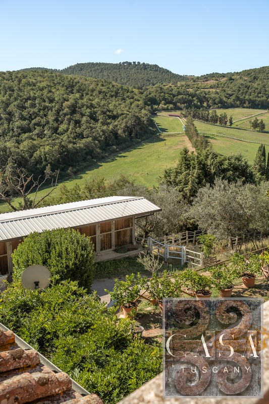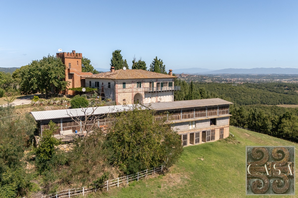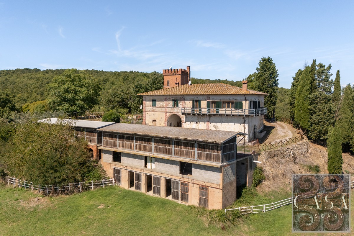 98 hectare estate with a four-storey villa with a crenellated turret, a guest house, and a horse facility, for sale near Trequanda.