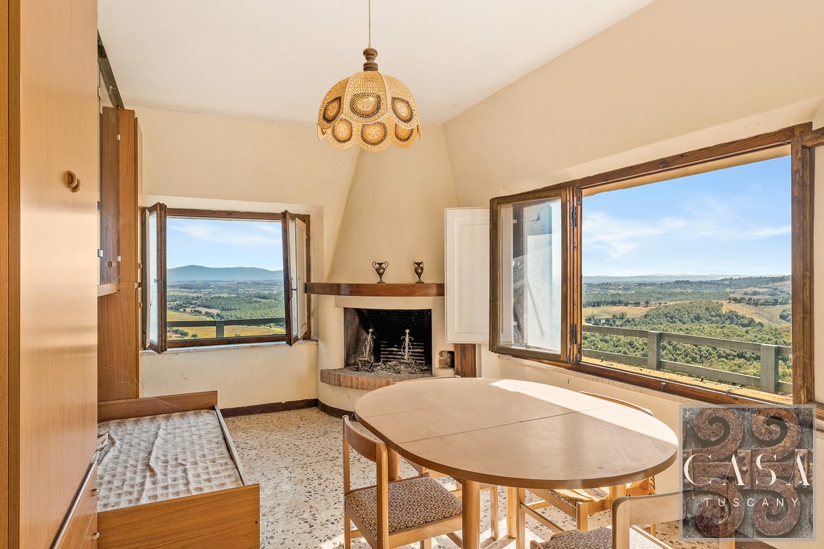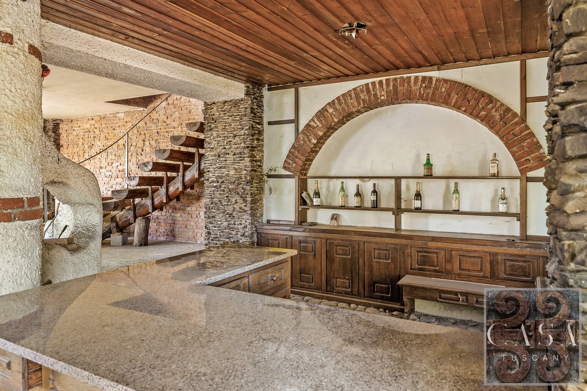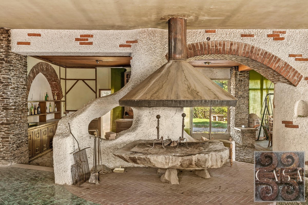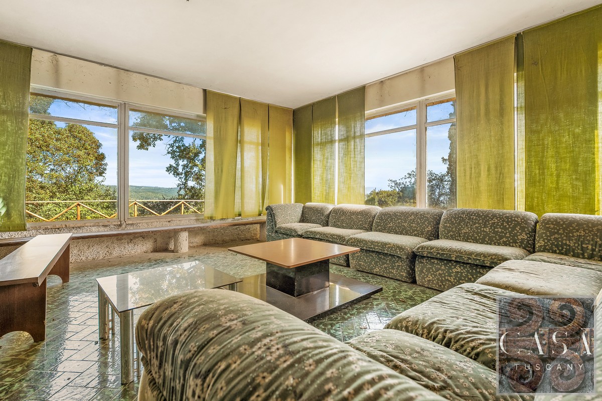The main residence is a 223 sqm (2551 sq ft) villa with a crenellated turret, built in the 1950s and inspired by Sienese medieval castles, in addition to a country house.