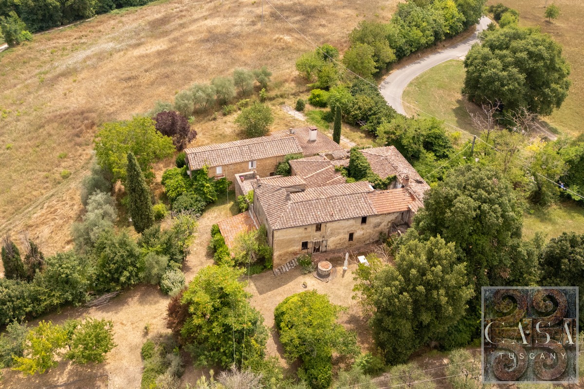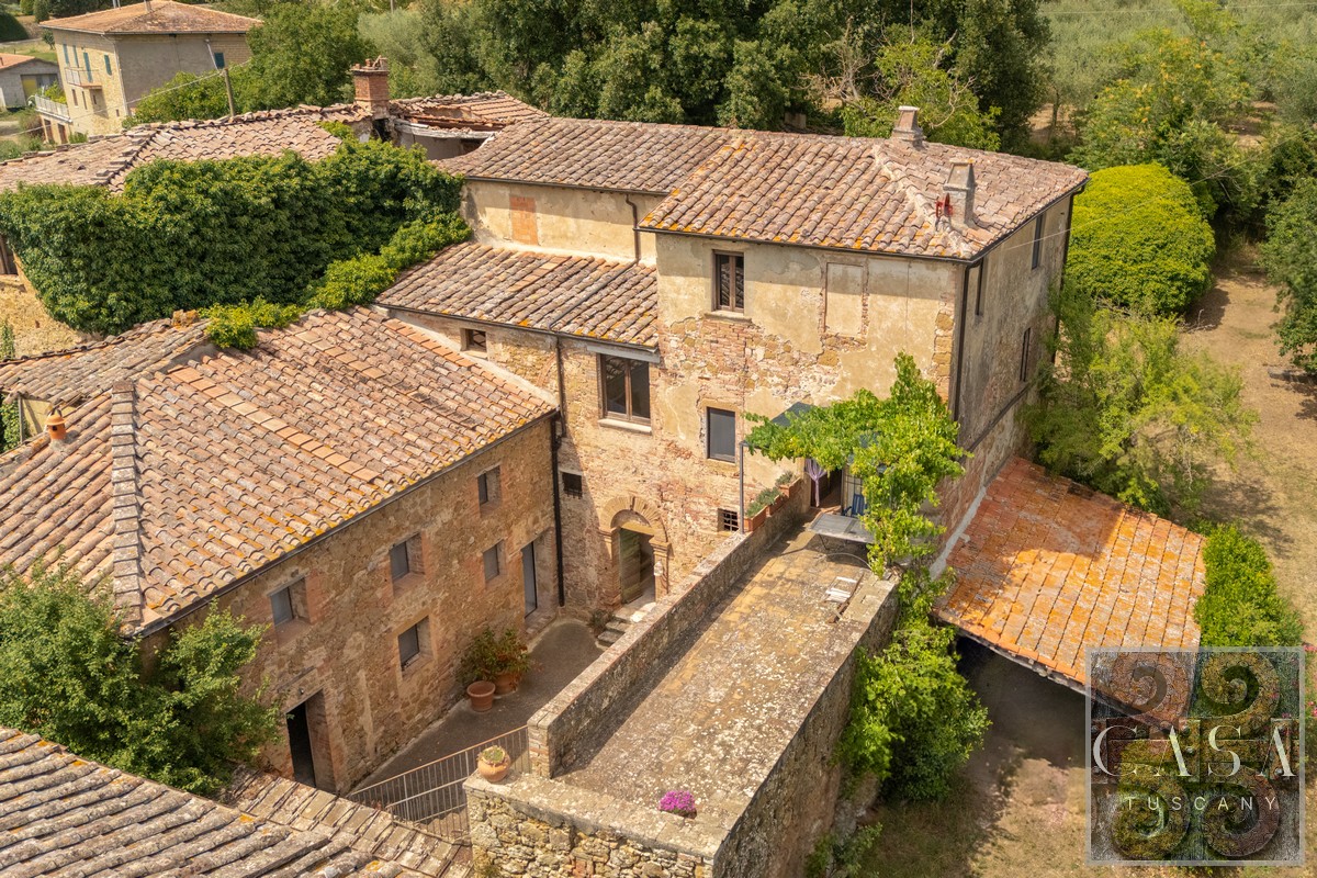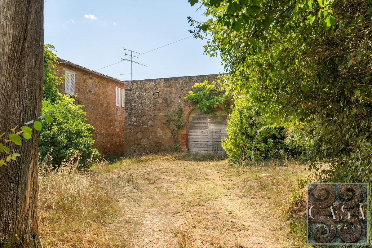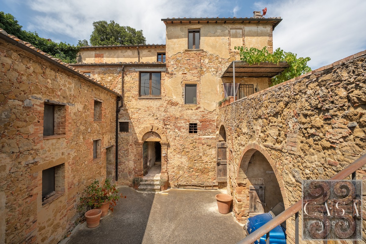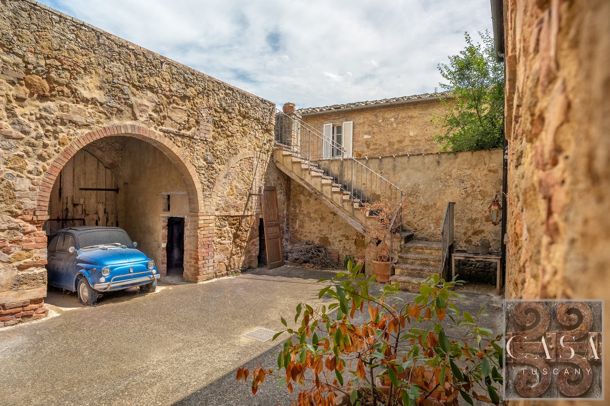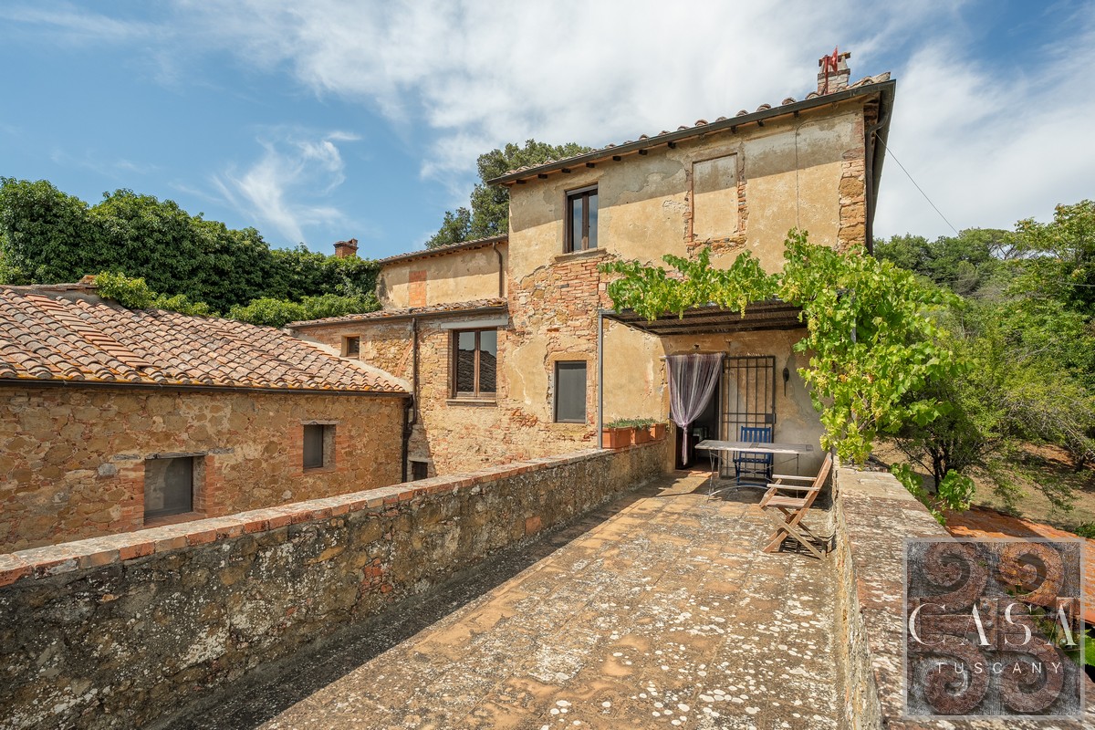 In a scenic hamlet in the Sienese countryside near Trequanda, a charming former farmhouse for sale featuring a traditional courtyard, terrace, and an olive grove. Just a short distance from the charming village of Trequanda, this enchanting semi-detached farmhouse offers a rare combination of historical charm, architectural intrigue, and understated elegance. Sheltered by mature trees and open to the sun-drenched southern horizon, the property enjoys an exceptional sense of privacy and calm, with uninterrupted views across the Tuscan landscape.