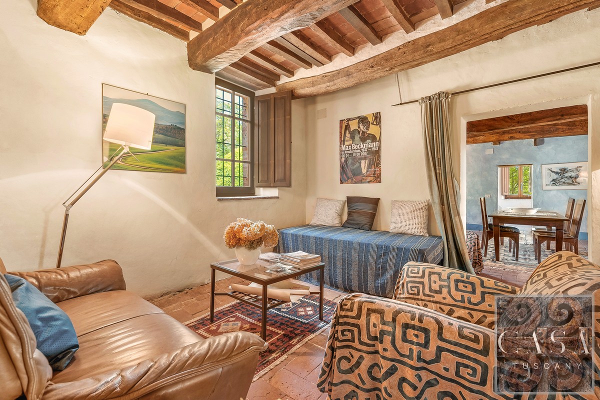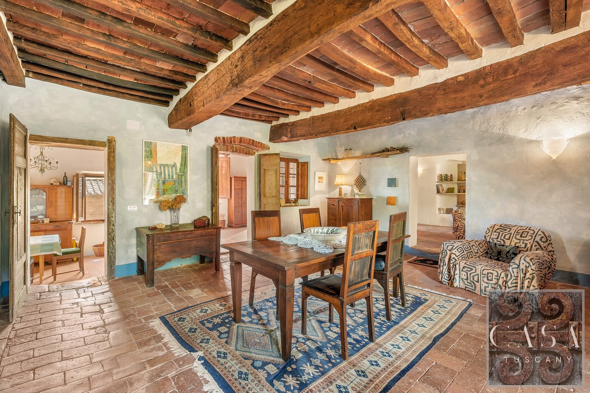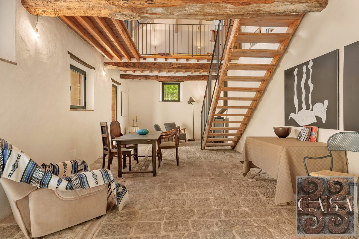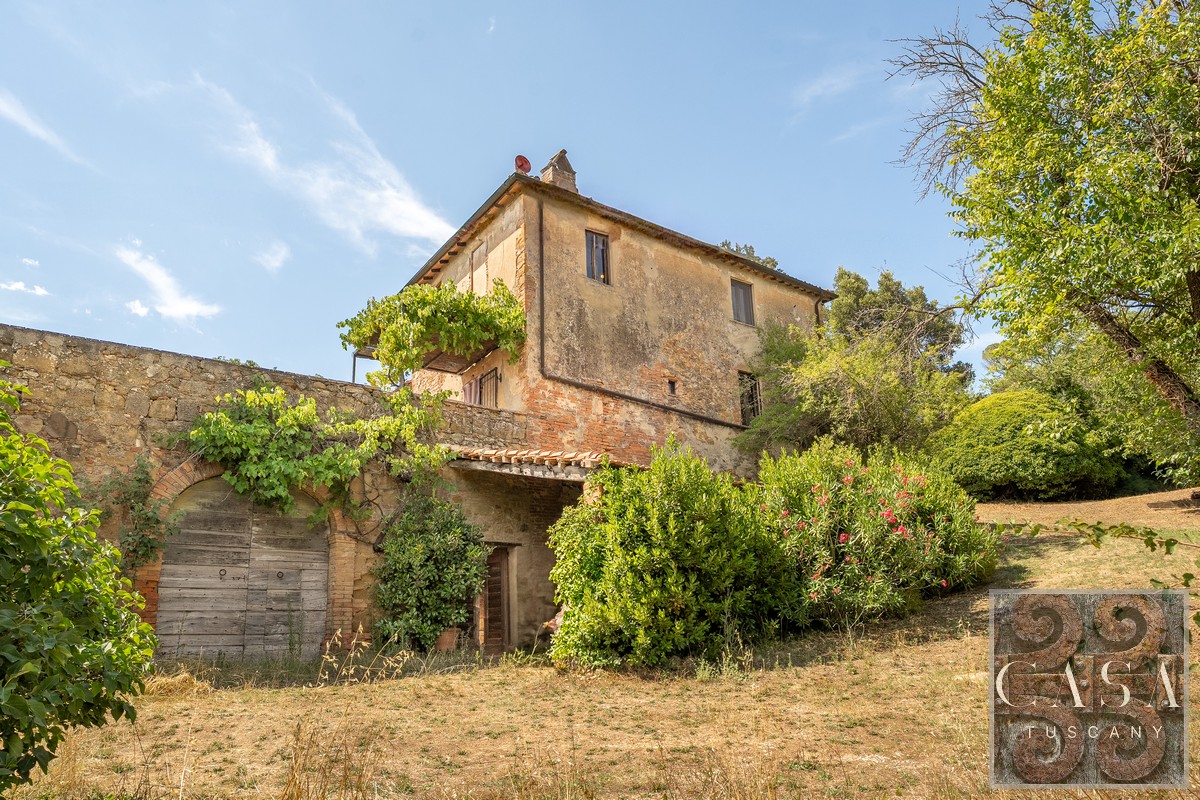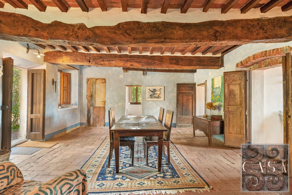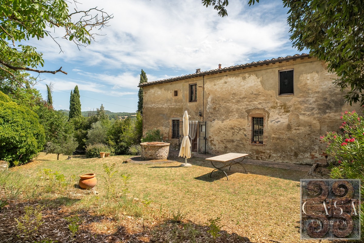 In a scenic hamlet in the Sienese countryside near Trequanda, a charming former farmhouse for sale featuring a traditional courtyard, terrace, and an olive grove. Just a short distance from the charming village of Trequanda, this enchanting semi-detached farmhouse offers a rare combination of historical charm, architectural intrigue, and understated elegance. Sheltered by mature trees and open to the sun-drenched southern horizon, the property enjoys an exceptional sense of privacy and calm, with uninterrupted views across the Tuscan landscape.
