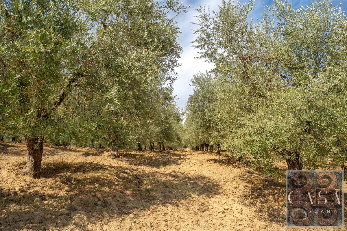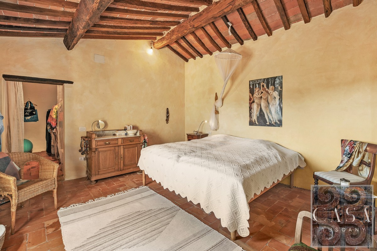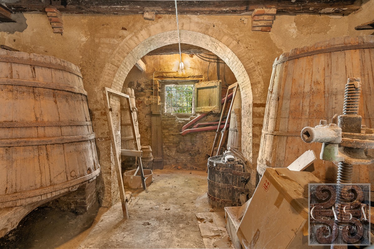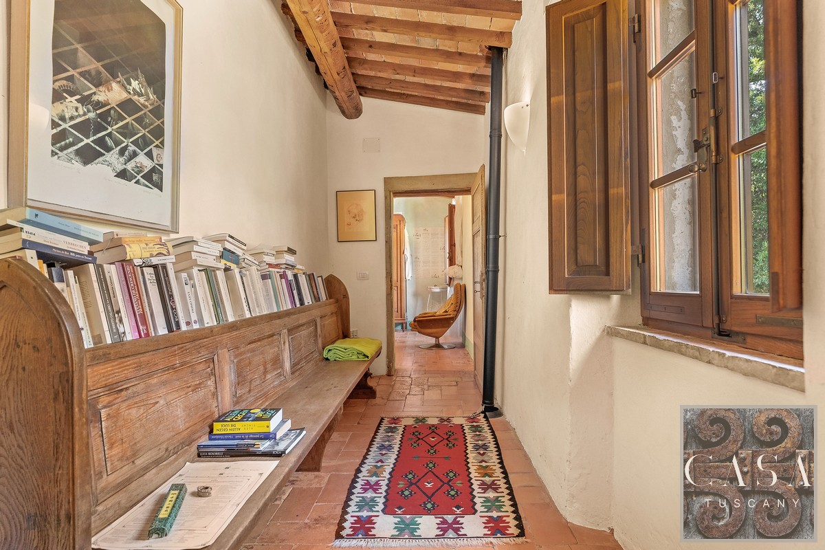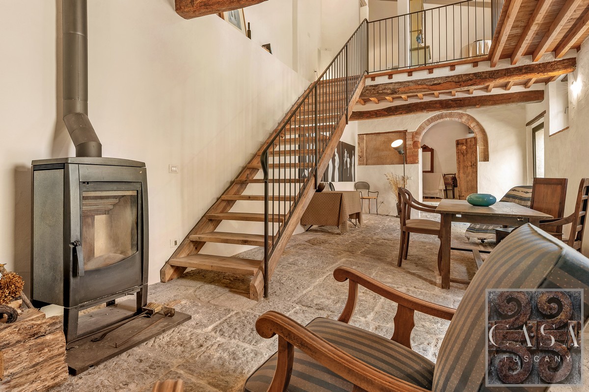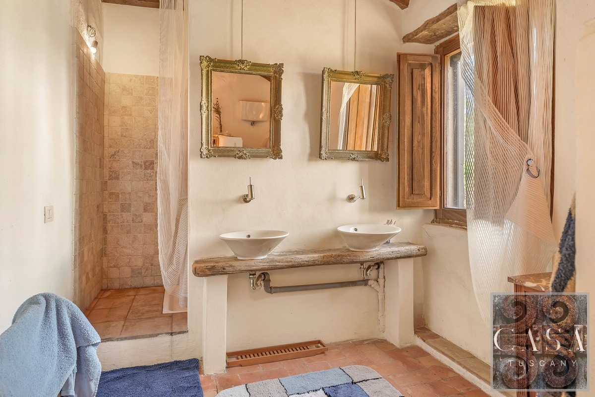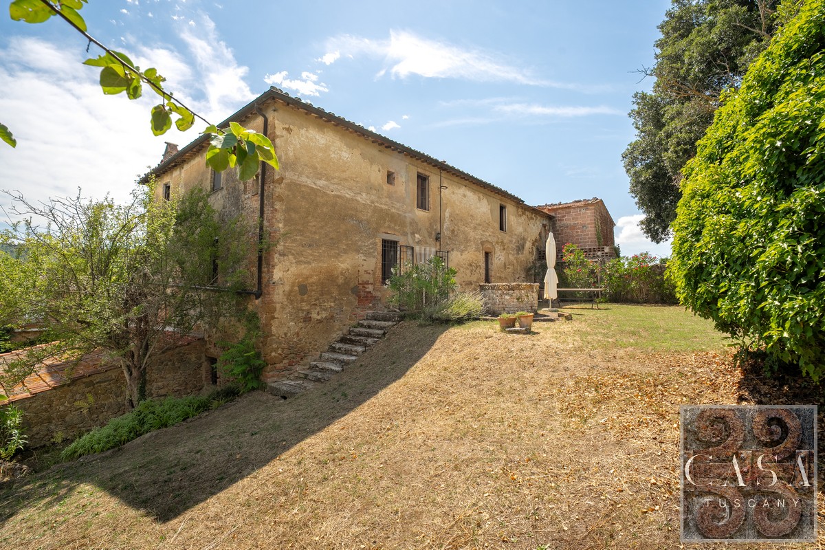 In a scenic hamlet in the Sienese countryside near Trequanda, a charming former farmhouse for sale featuring a traditional courtyard, terrace, and an olive grove. Just a short distance from the charming village of Trequanda, this enchanting semi-detached farmhouse offers a rare combination of historical charm, architectural intrigue, and understated elegance. Sheltered by mature trees and open to the sun-drenched southern horizon, the property enjoys an exceptional sense of privacy and calm, with uninterrupted views across the Tuscan landscape.