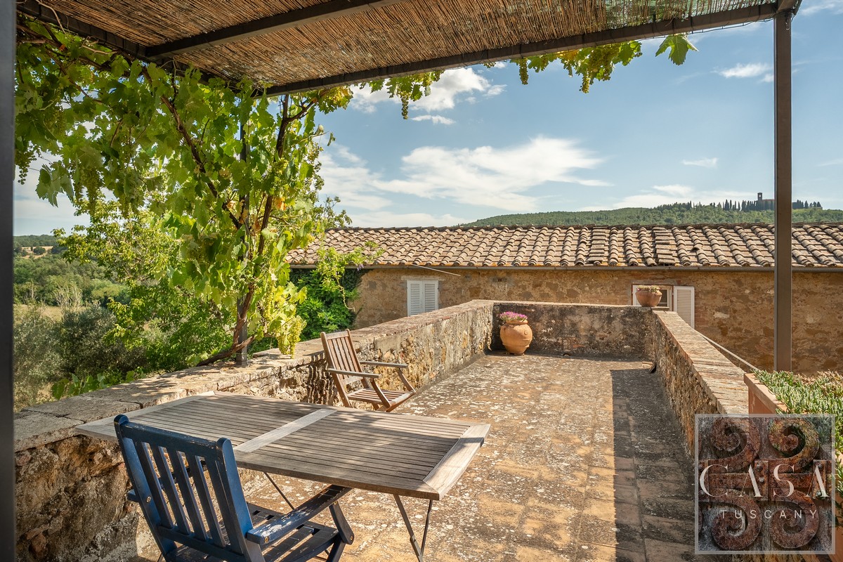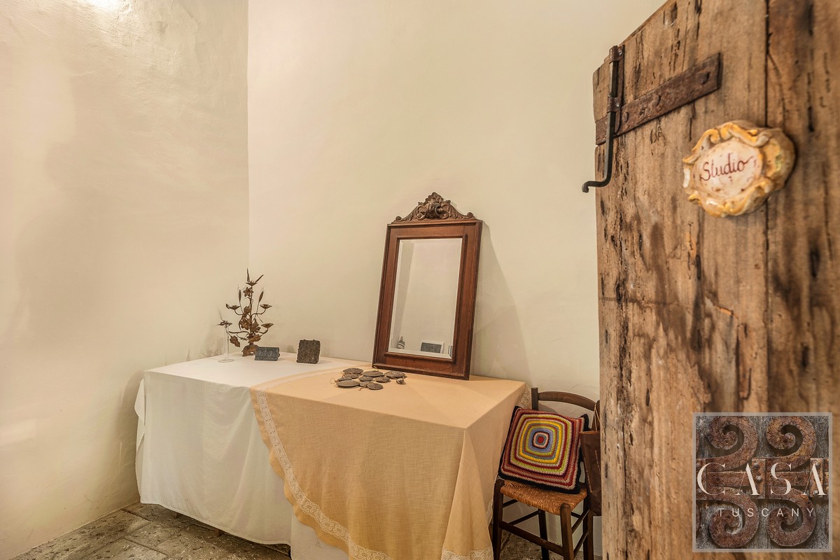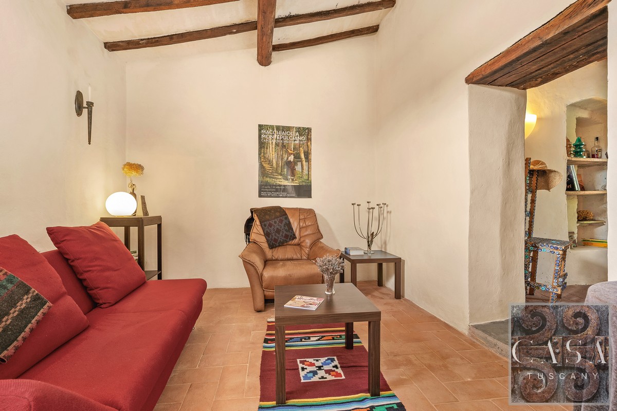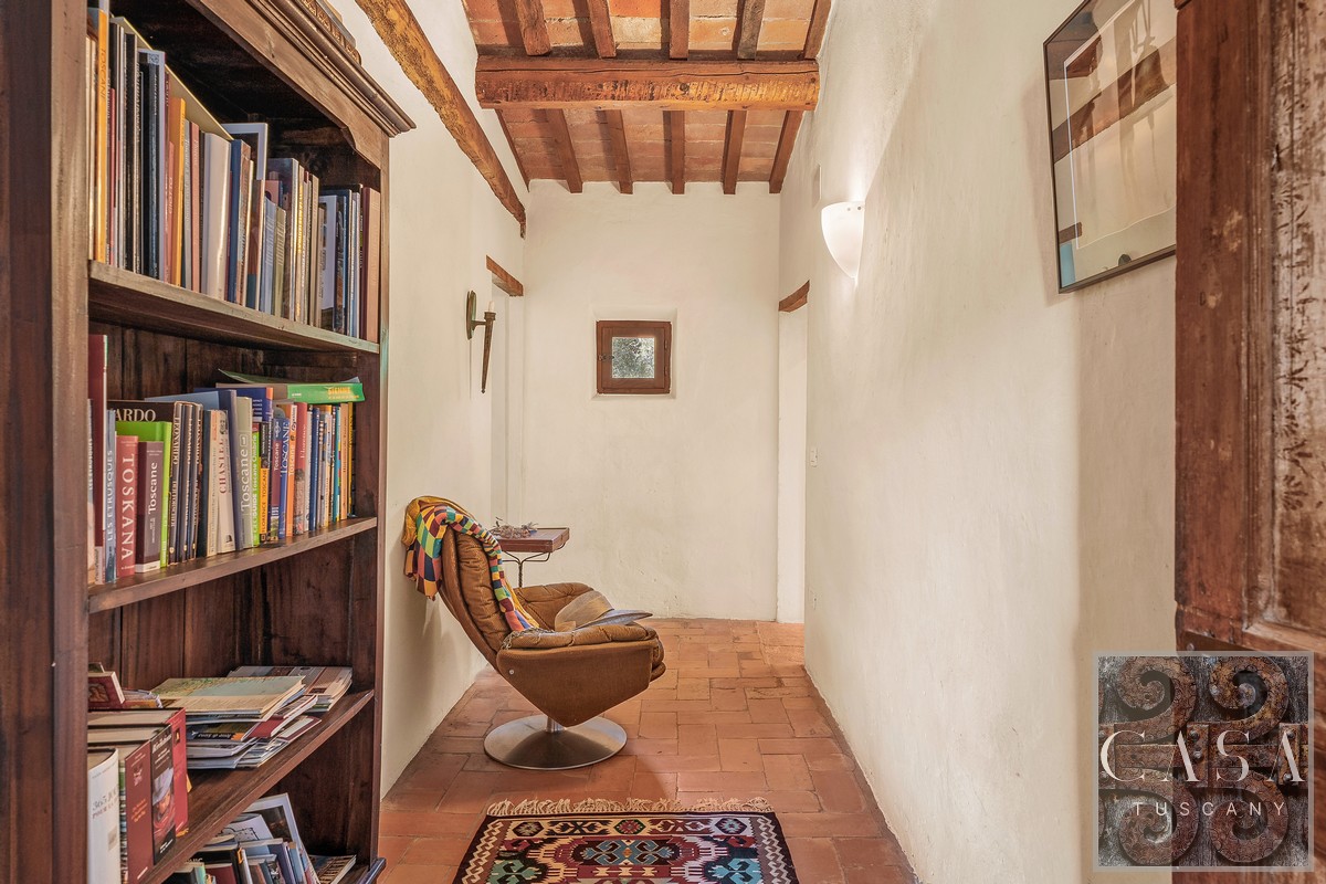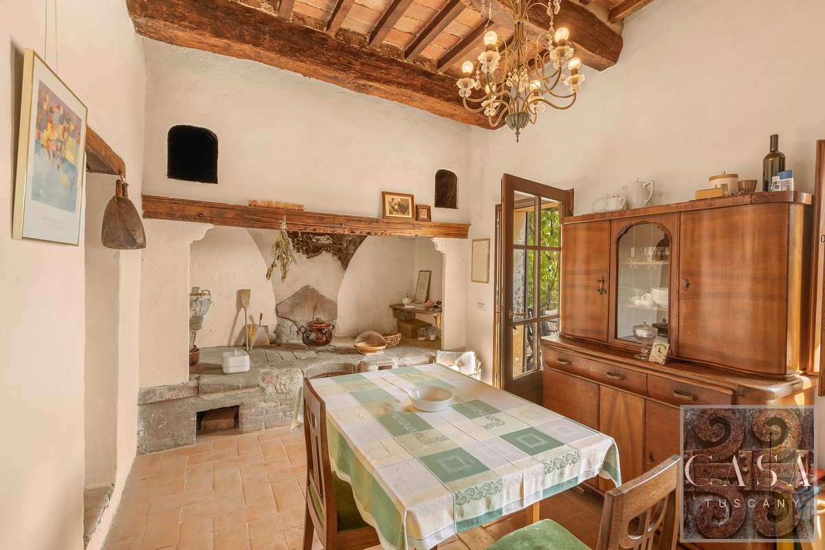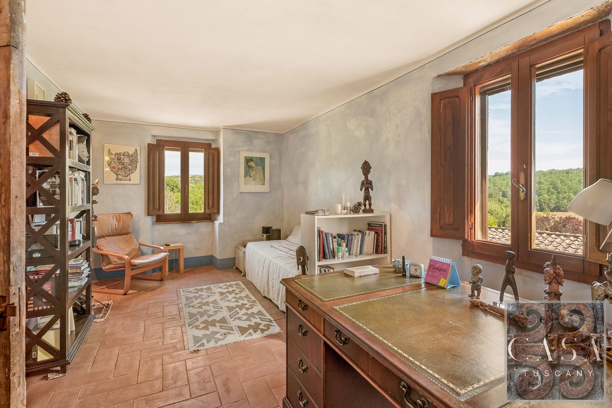 In a scenic hamlet in the Sienese countryside near Trequanda, a charming former farmhouse for sale featuring a traditional courtyard, terrace, and an olive grove. Just a short distance from the charming village of Trequanda, this enchanting semi-detached farmhouse offers a rare combination of historical charm, architectural intrigue, and understated elegance. Sheltered by mature trees and open to the sun-drenched southern horizon, the property enjoys an exceptional sense of privacy and calm, with uninterrupted views across the Tuscan landscape.