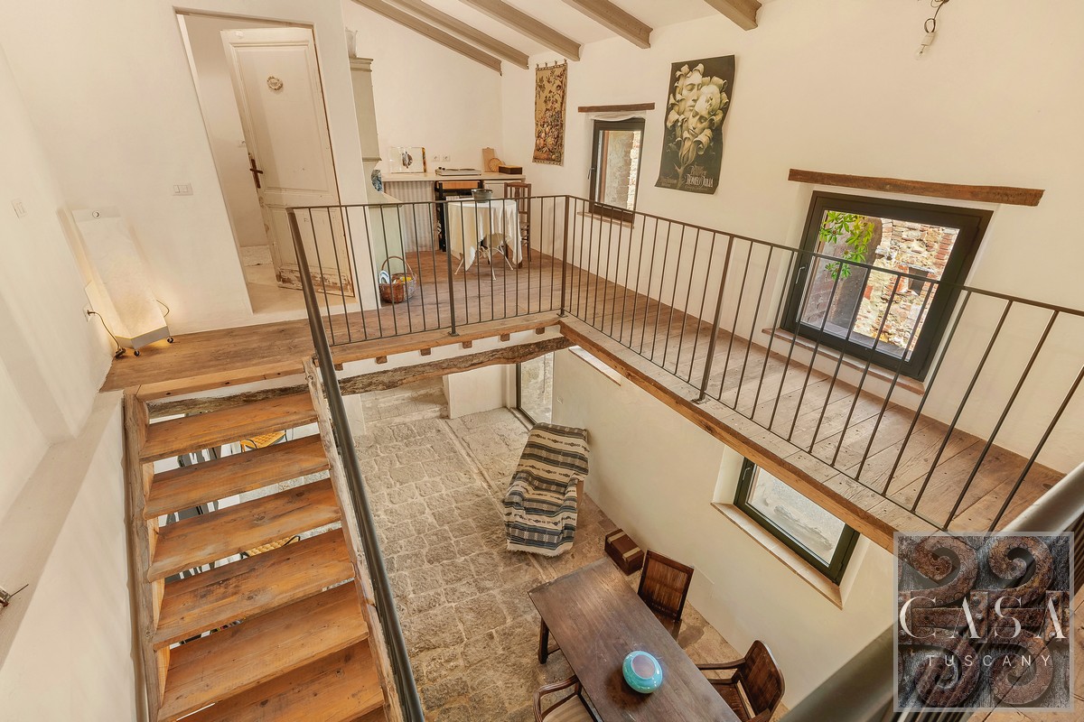 Ascending the staircase, you arrive in the first-floor living area, comprising a spacious drawing room, a characterful kitchen anchored by an imposing antique fireplace, and access to a panoramic south-facing terrace.