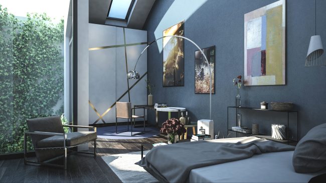 On the first floor, reached by a splendid modern helical staircase, we find the bedroom, which, just like the living room on the floor below, is equipped with floor-to-ceiling windows.