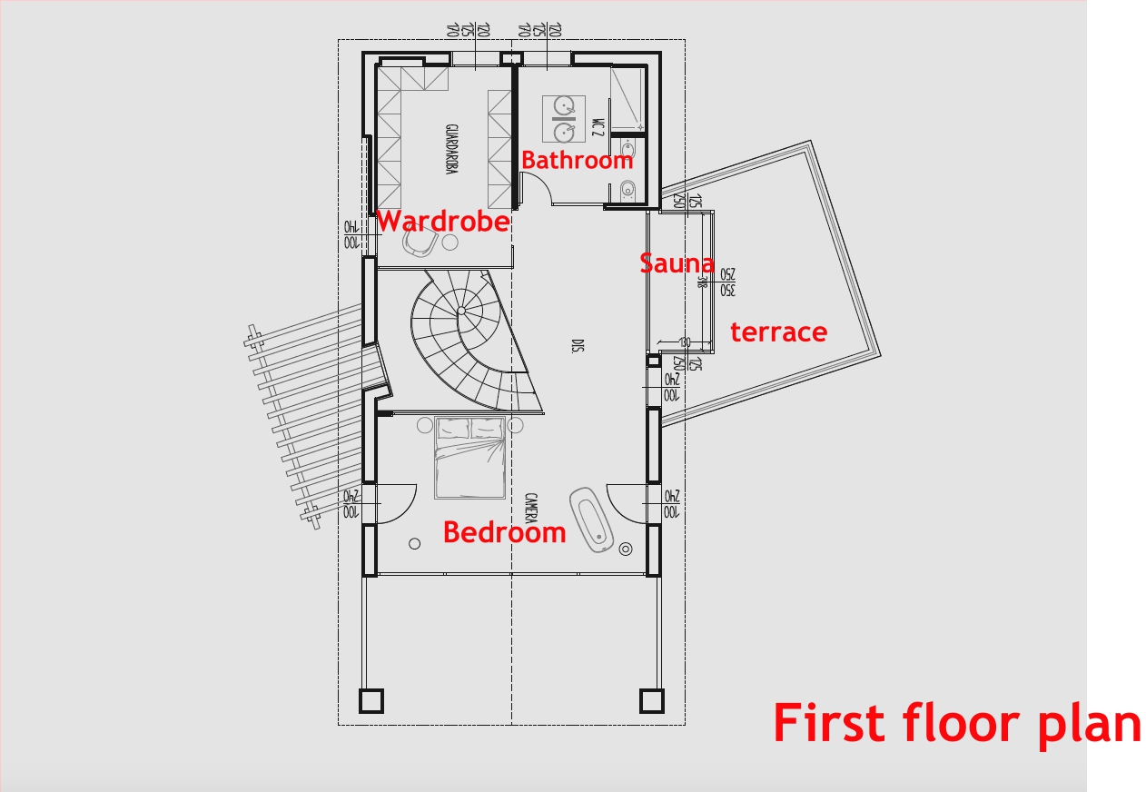 The first floor is completed by the wardrobe area (convertible into a bedroom), a bathroom with shower and double sinks, sauna and terrace.