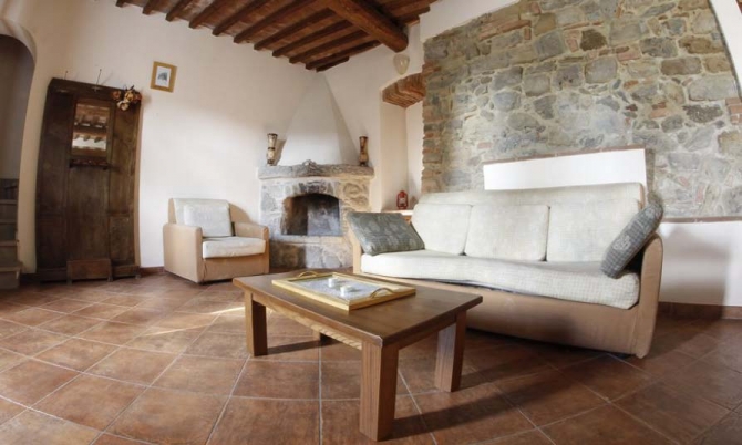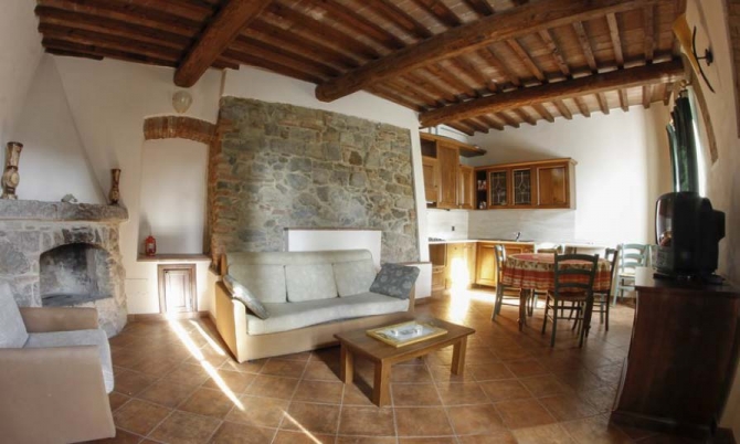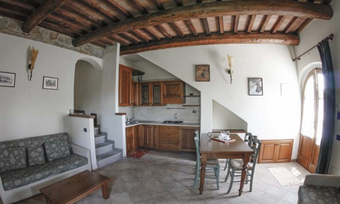 The property has been completely renovated in typical Tuscan style with beamed ceilings, stone walls, and terracotta floors.