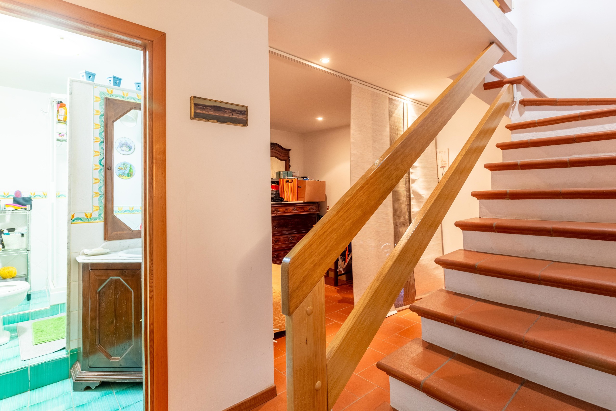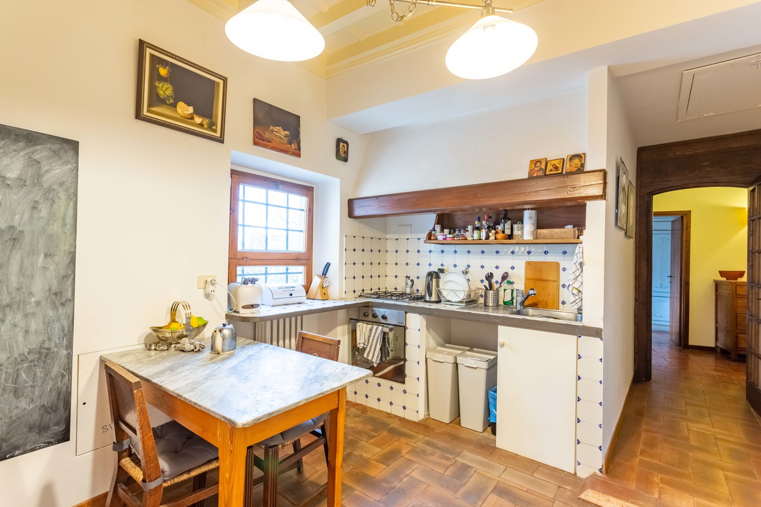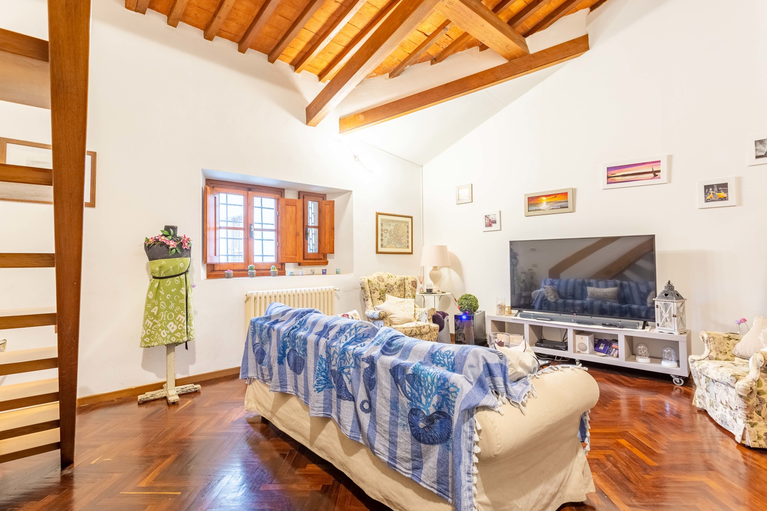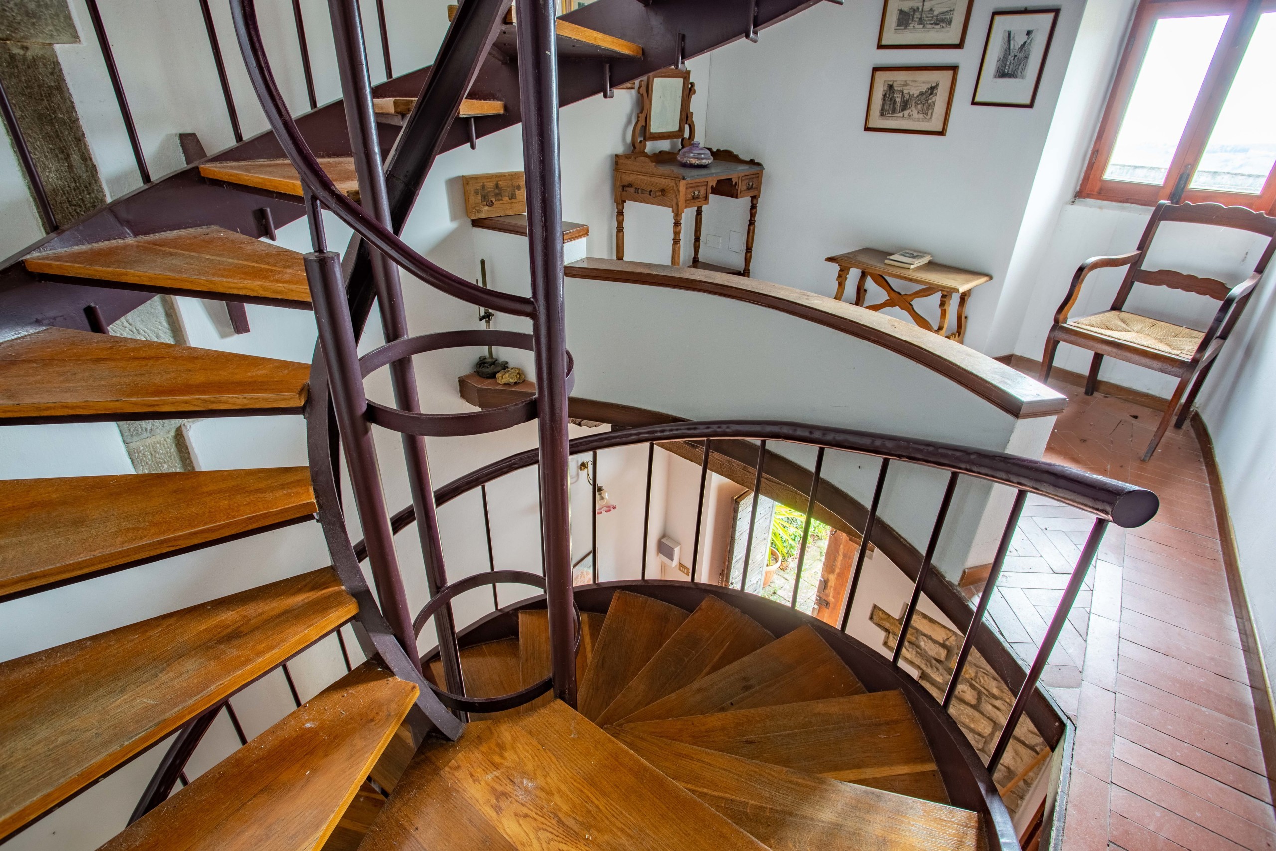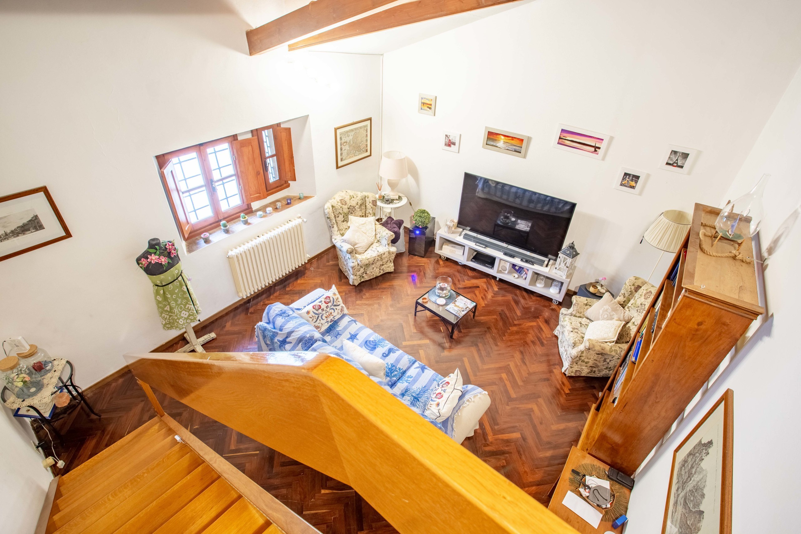 Proceeding through the main entrance we are greeted by an important circular staircase that takes us to the balcony where there are the two entrances that now divide the first floor into two apartments. You enter the bright living area, and there is a large kitchen with the old stone fireplace and a double bedroom making up the second floor.