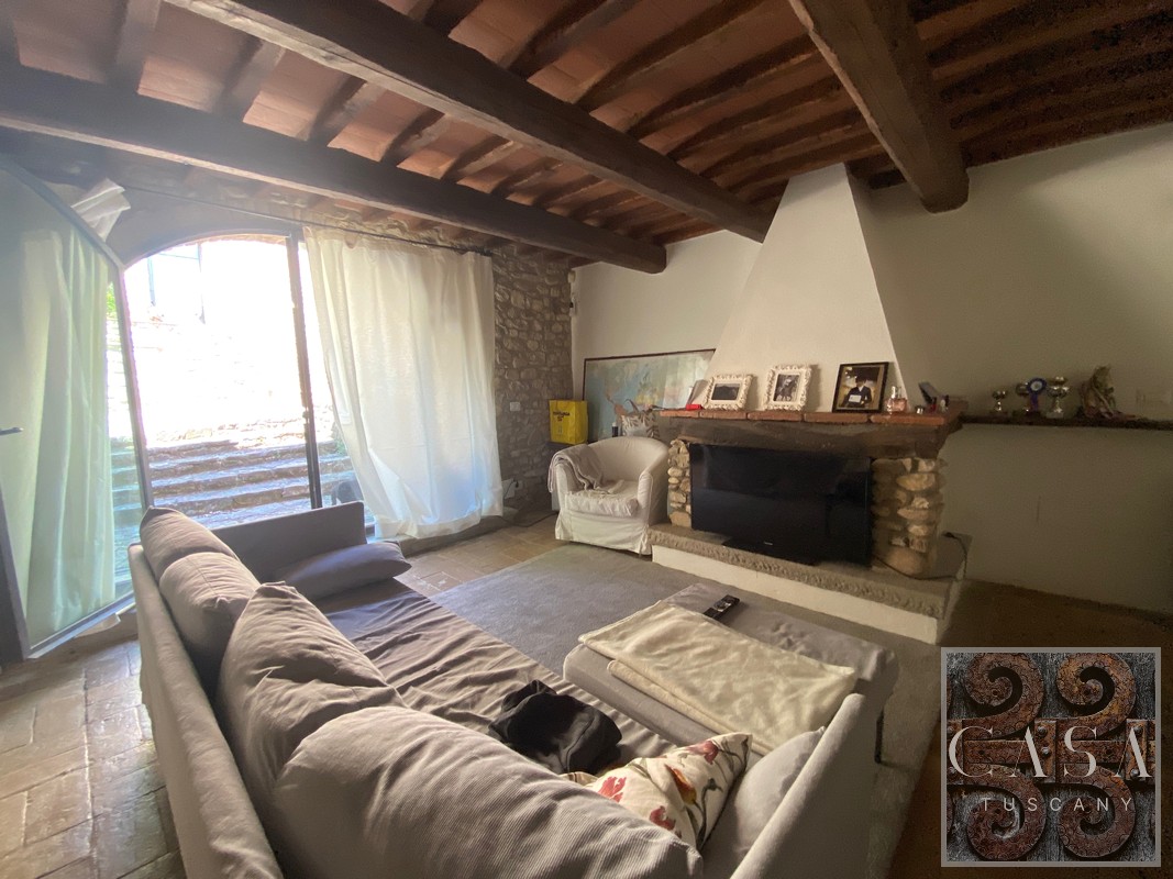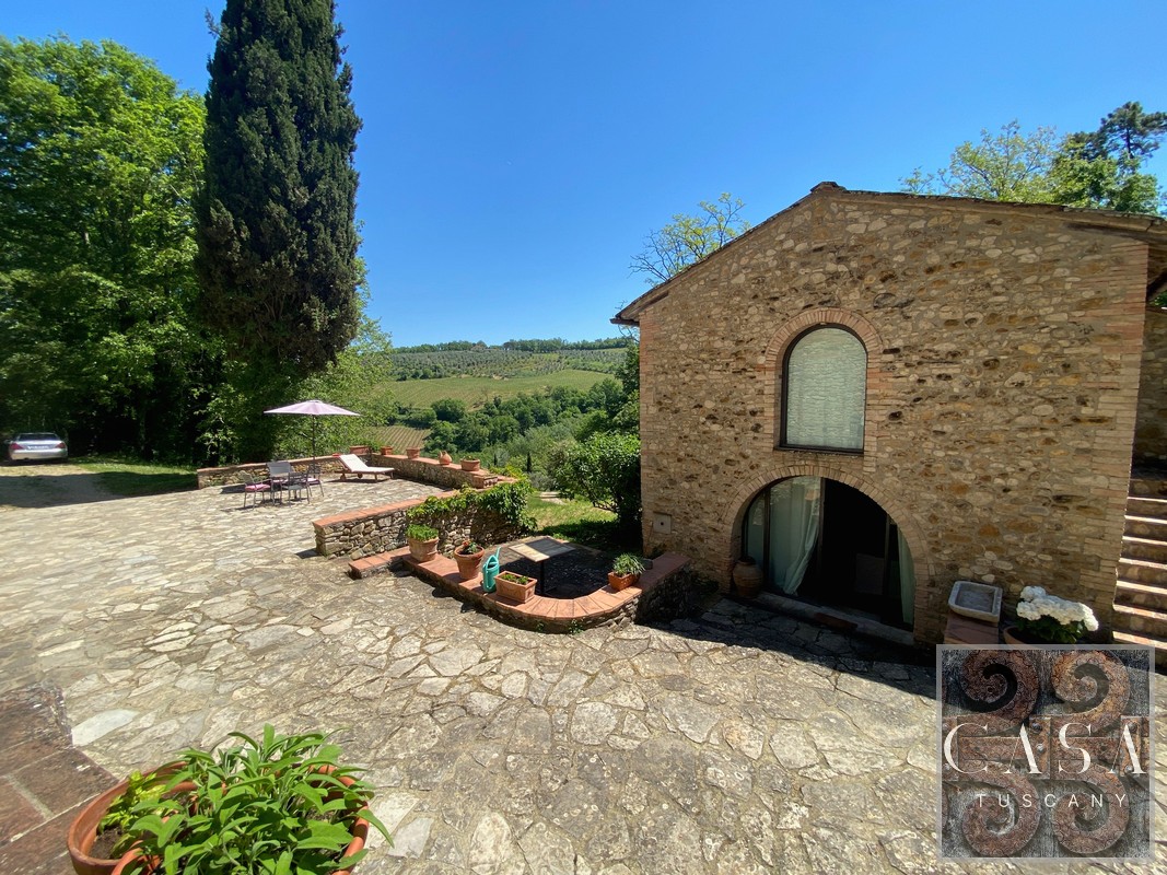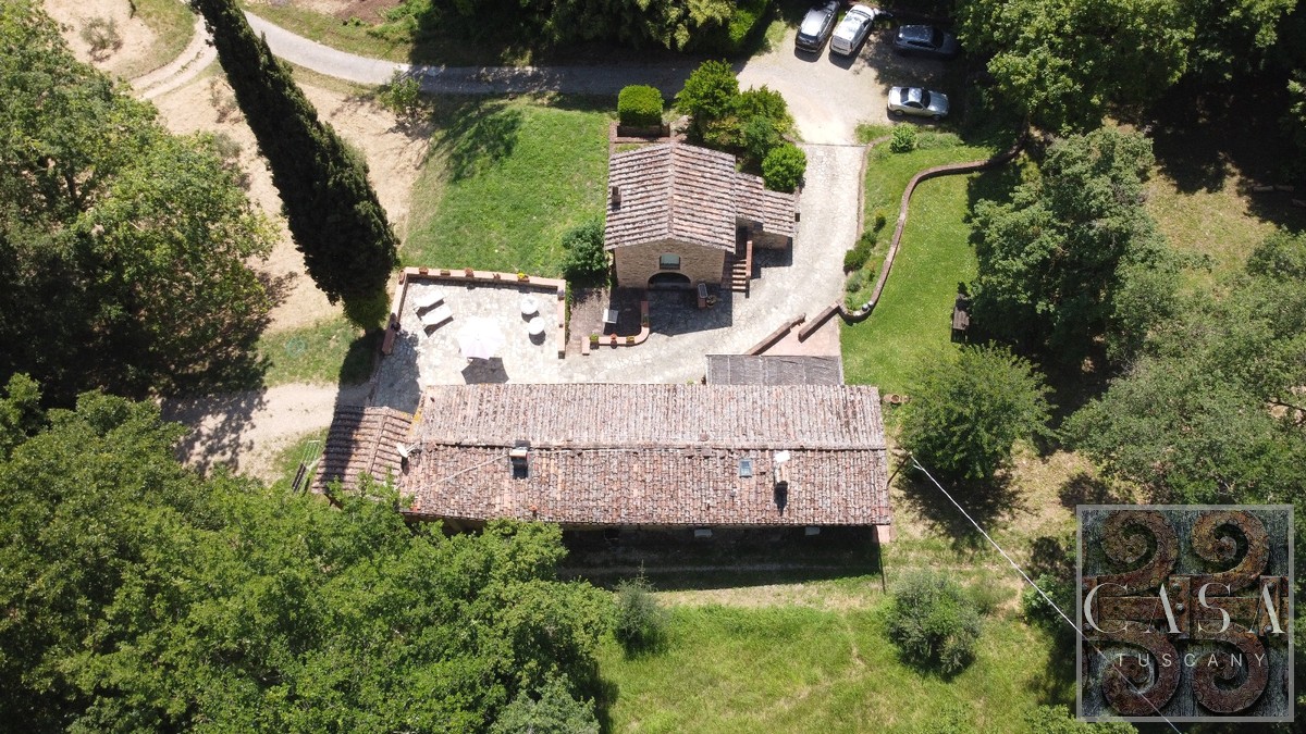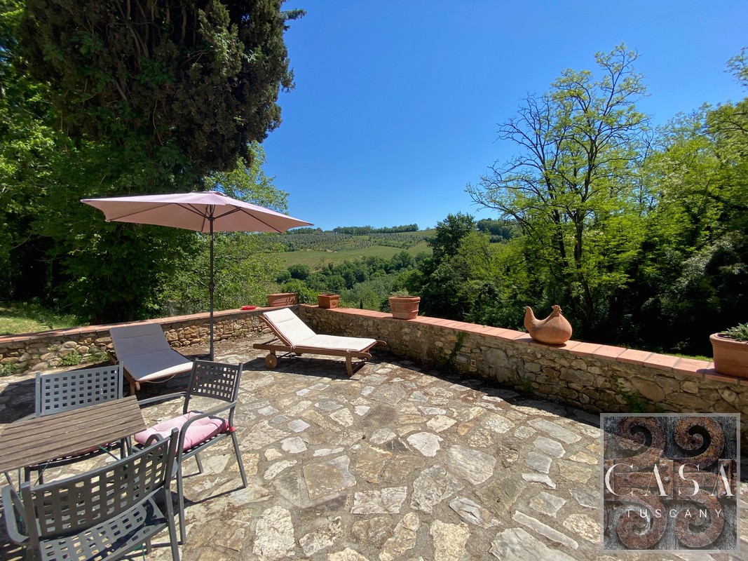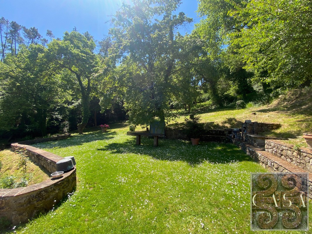 The property is completely independent and features a large paved terrace with antique terracotta tiles and a shady pergola, a beautifully maintained garden, an olive grove, some woodland and private parking.