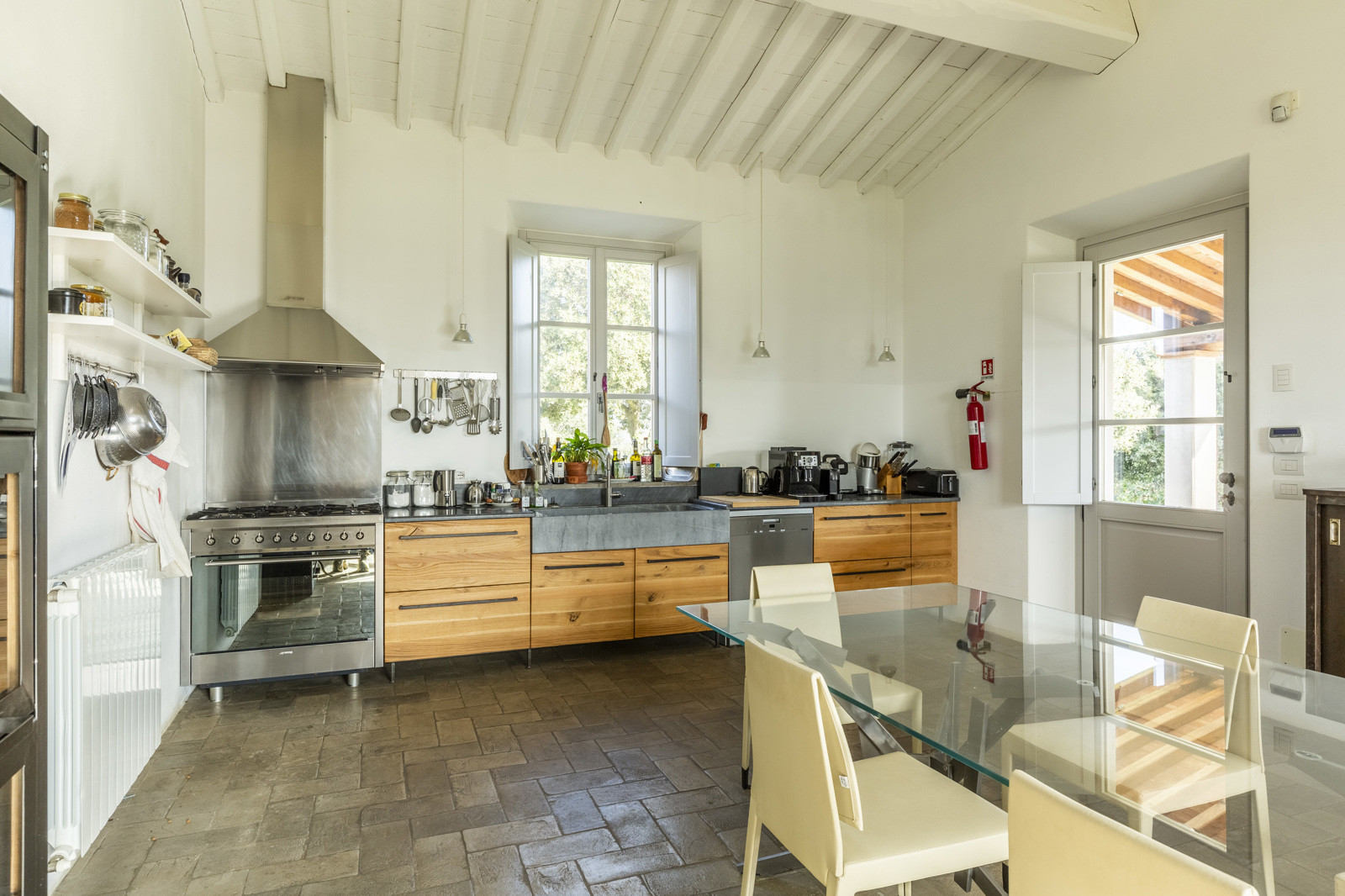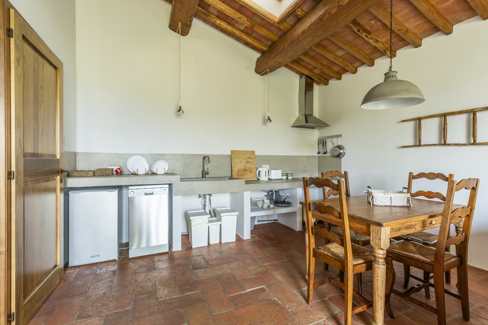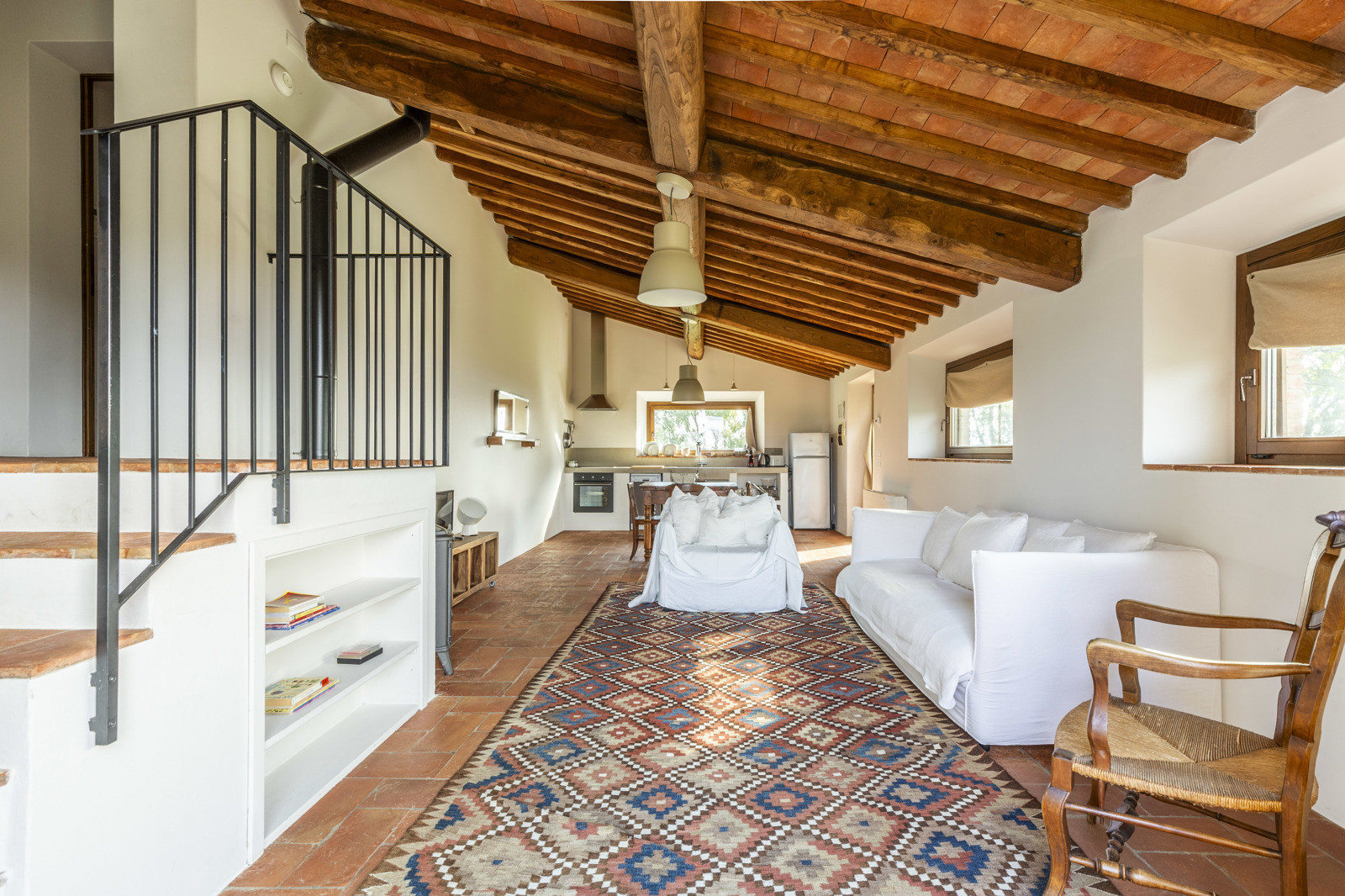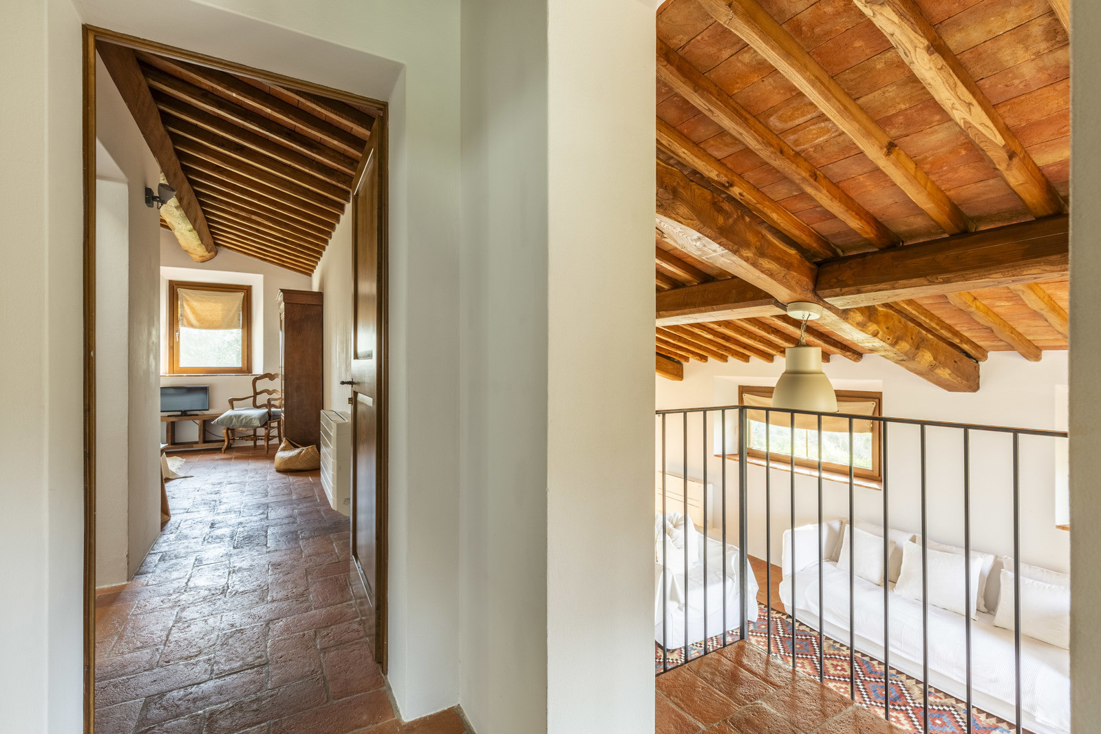 The farmhouse is in excellent condition, thanks to a recent renovation that has preserved the authentic Tuscan style. The materials used, such as terracotta floors and ceilings with beams, enhance the rustic and elegant charm of the property, with attention to detail in every corner.
