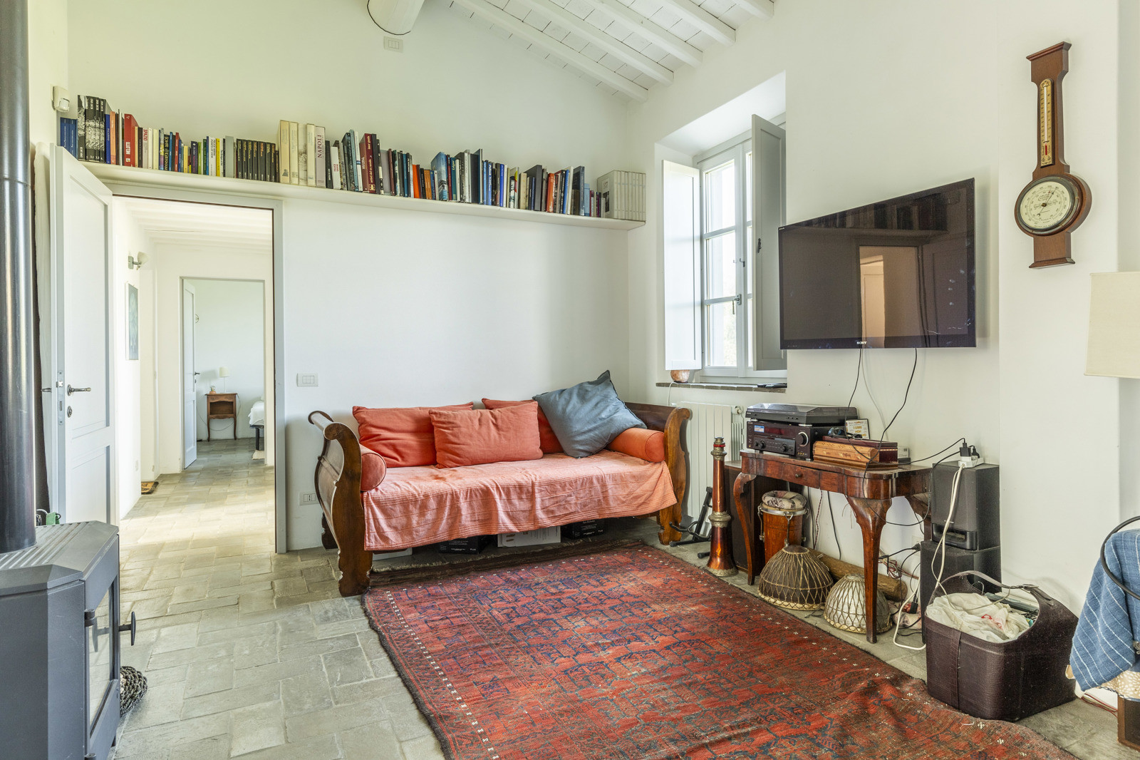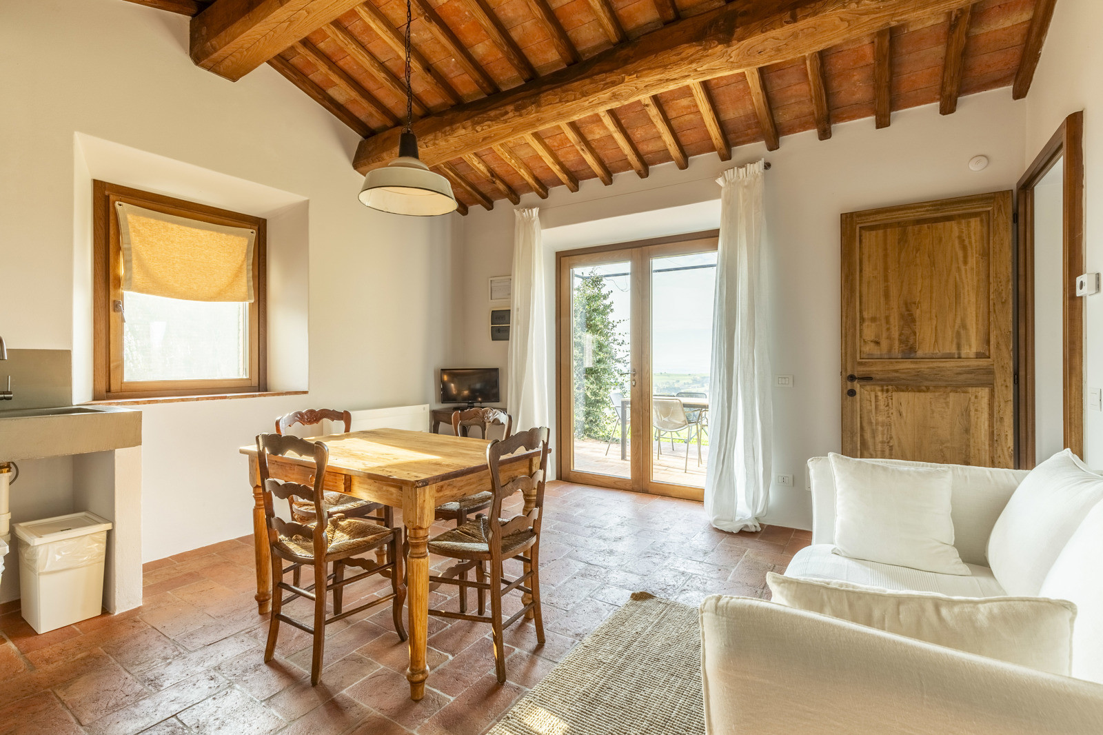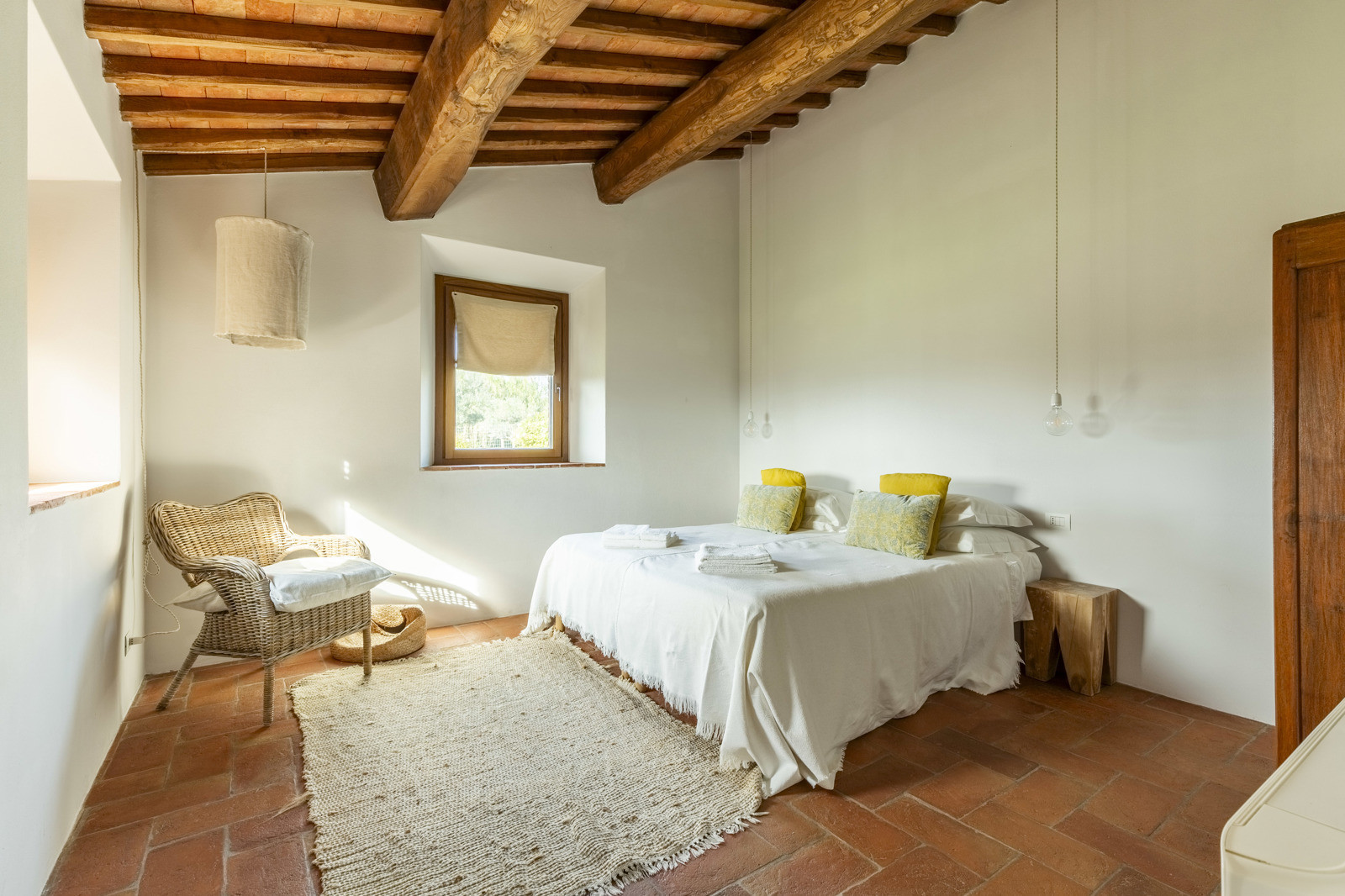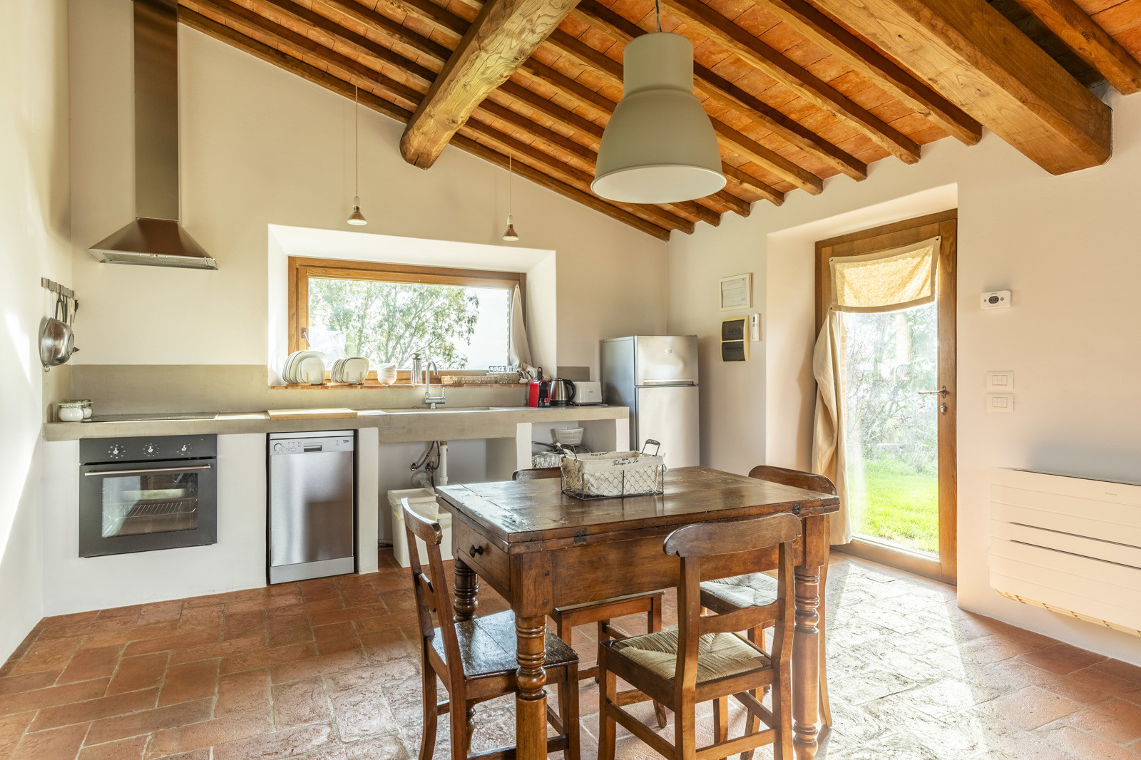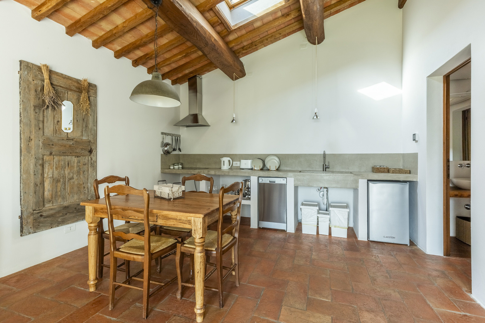 The farmhouse is in excellent condition, thanks to a recent renovation that has preserved the authentic Tuscan style. The materials used, such as terracotta floors and ceilings with beams, enhance the rustic and elegant charm of the property, with attention to detail in every corner.