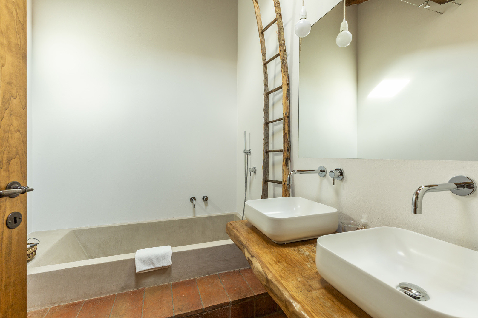 The other buildings, totally covered in stone are divided into guest apartments, two with living room with kitchenette, bedroom and bathroom and one with living room, kitchen, two bedrooms and two bathrooms. In the suite is a lovely living room with kitchenette, a bathroom and a room equipped with a central bath with a view towards the sea.