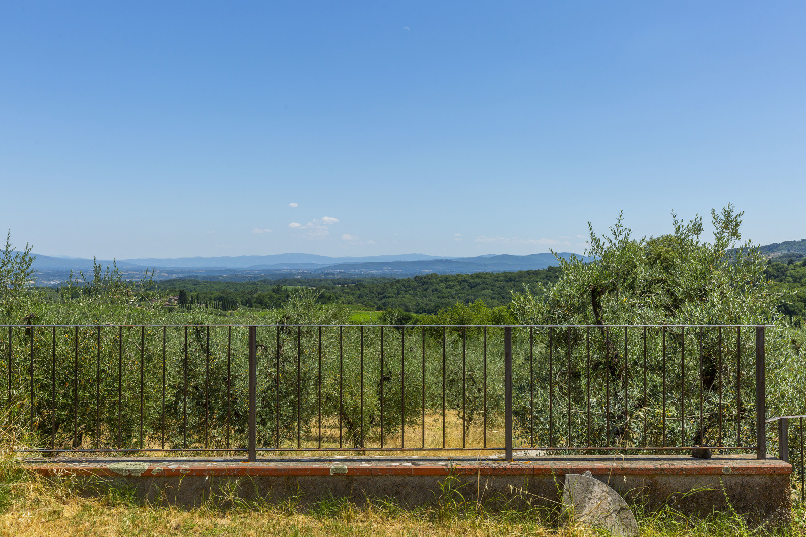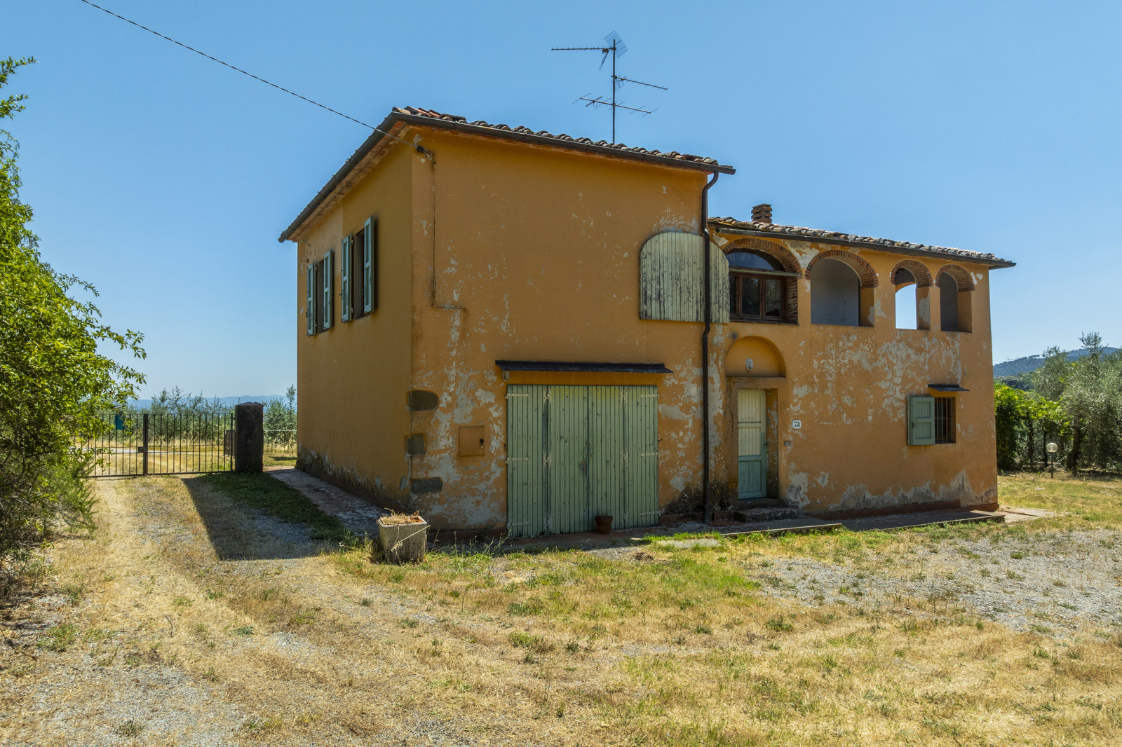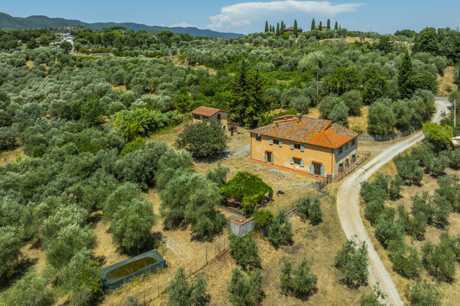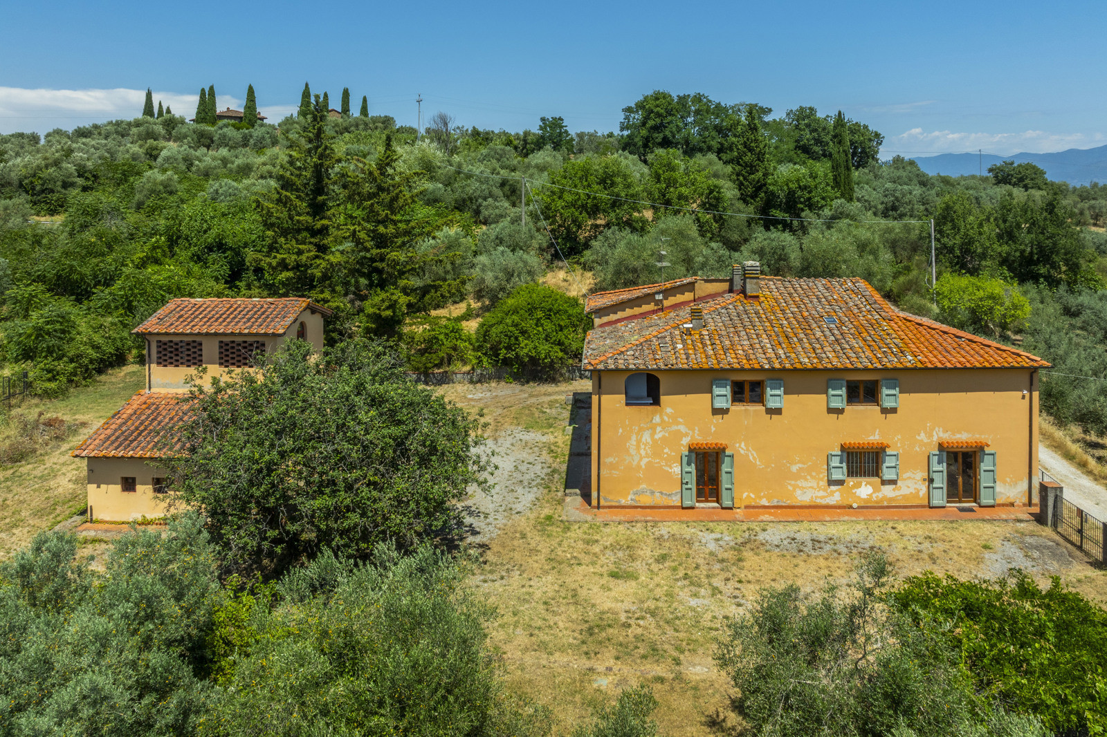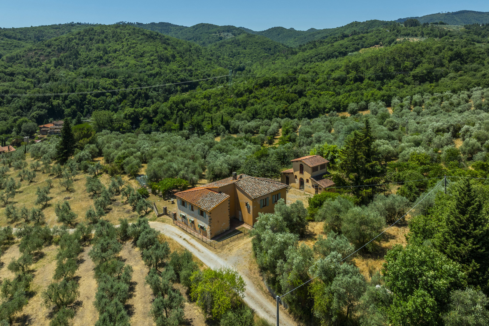The property is surrounded by about 3,000 sqm of fenced land with two internal driveways, with about 30 olive trees and numerous fruit trees (apricot, plum, cherry, pear, fig, etc.). About 5 hectares of olive grove with about 1,000 trees and about 9 hectares of forest and arable land complete the estate.