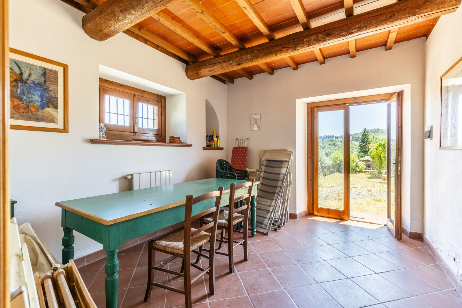 The property includes a shed of about 25 sqm, perfect for storing equipment or vehicles, and a small storage room of 5 sqm. There is also an agricultural outbuilding of about 75 sqm, currently used for storage, which offers further possibilities for agricultural activities, crafts or for develop additional guest spaces.