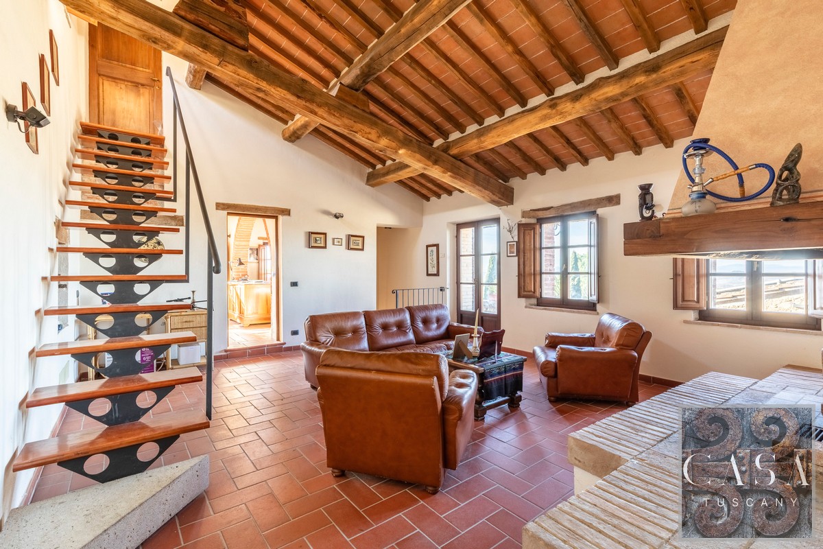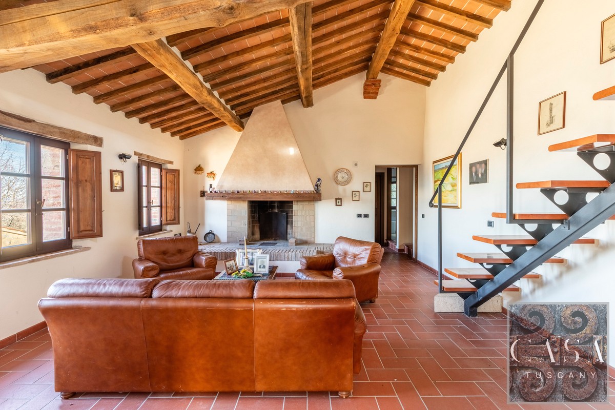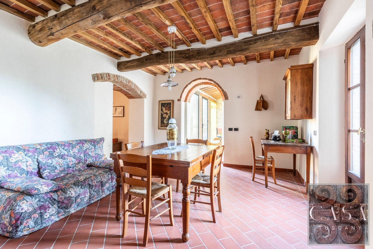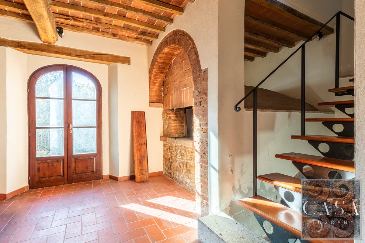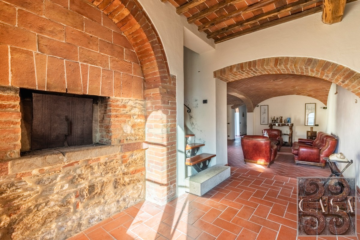 The interiors retain the charm of Tuscan rural architecture: on the ground floor there is a traditional living room with stunning vaulted ceilings, on the first floor there are impressive high ceilings with exposed wooden beams, terracotta floors throughout, and a large central fireplace that becomes the heart of the living area.