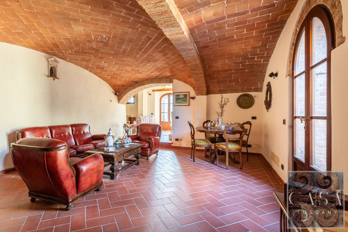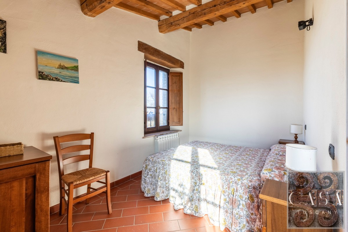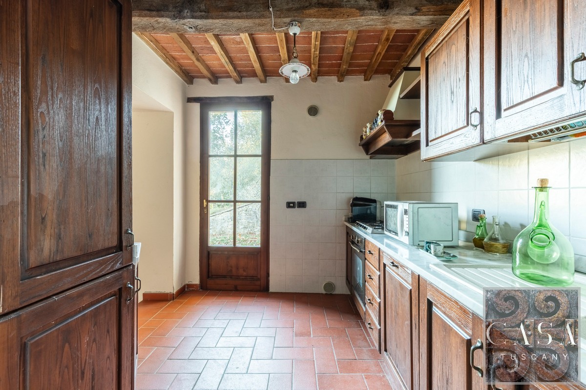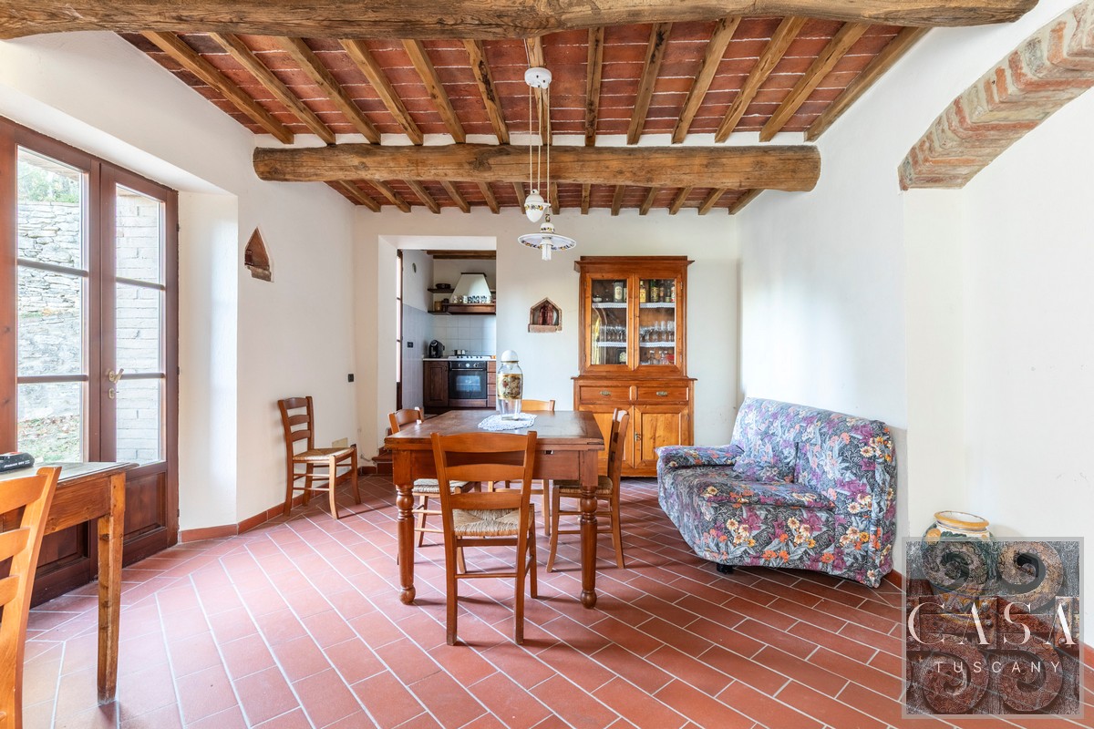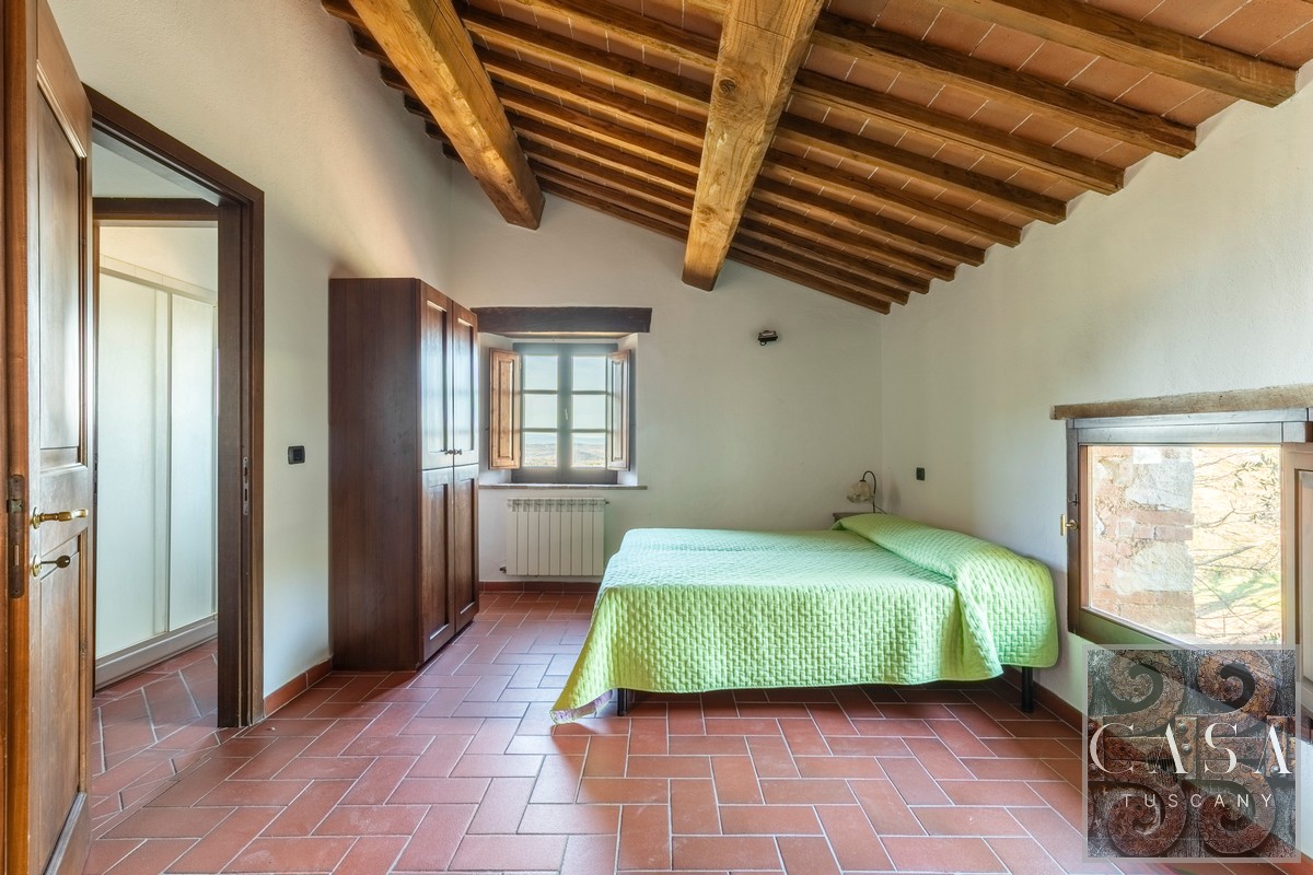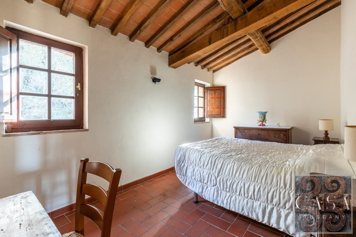 The interiors retain the charm of Tuscan rural architecture: on the ground floor there is a traditional living room with stunning vaulted ceilings, on the first floor there are impressive high ceilings with exposed wooden beams, terracotta floors throughout, and a large central fireplace that becomes the heart of the living area.