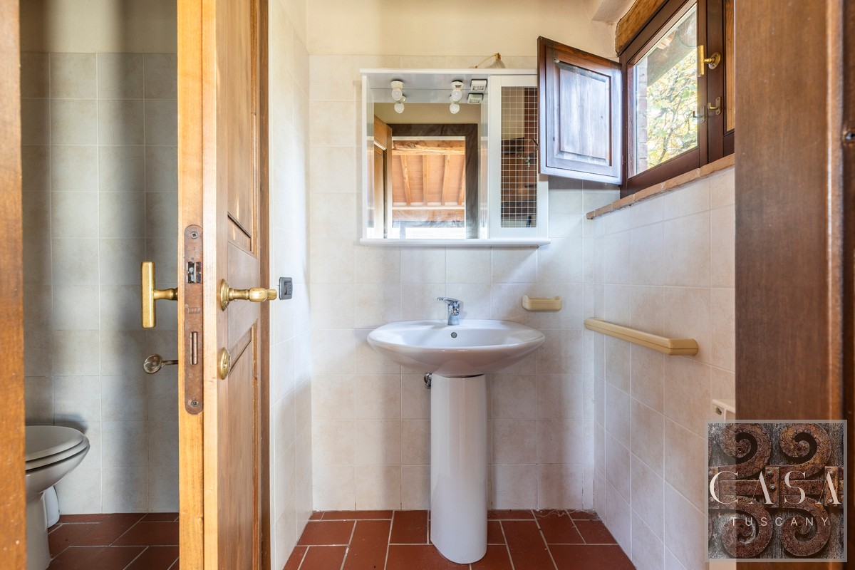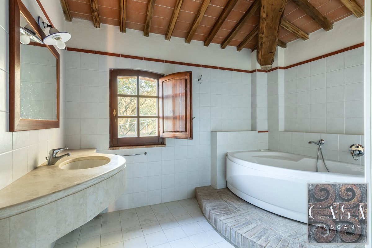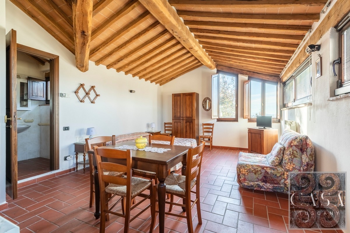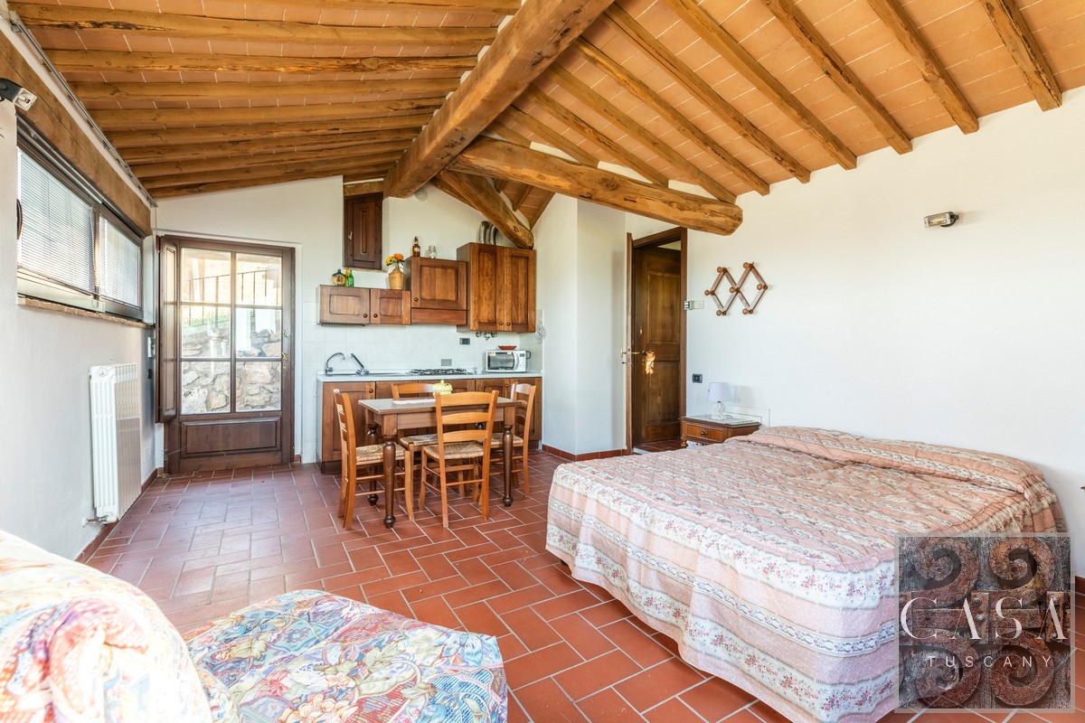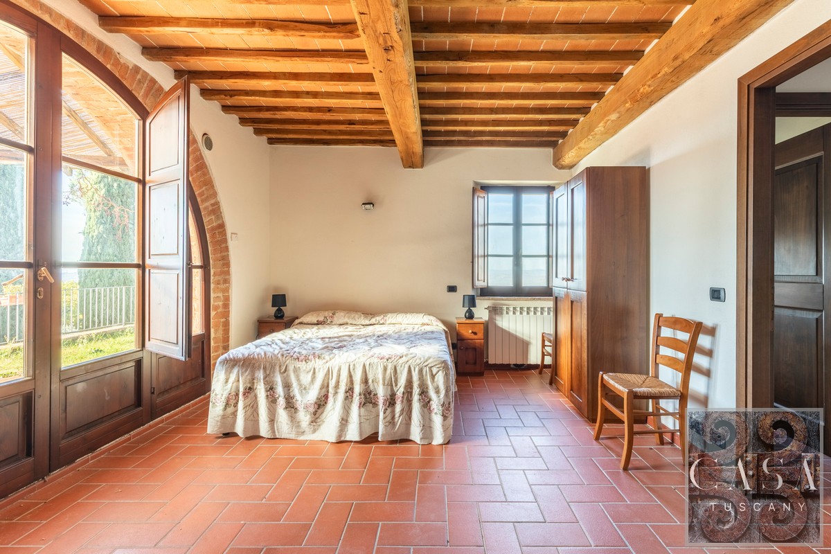 The interiors retain the charm of Tuscan rural architecture: on the ground floor there is a traditional living room with stunning vaulted ceilings, on the first floor there are impressive high ceilings with exposed wooden beams, terracotta floors throughout, and a large central fireplace that becomes the heart of the living area.
