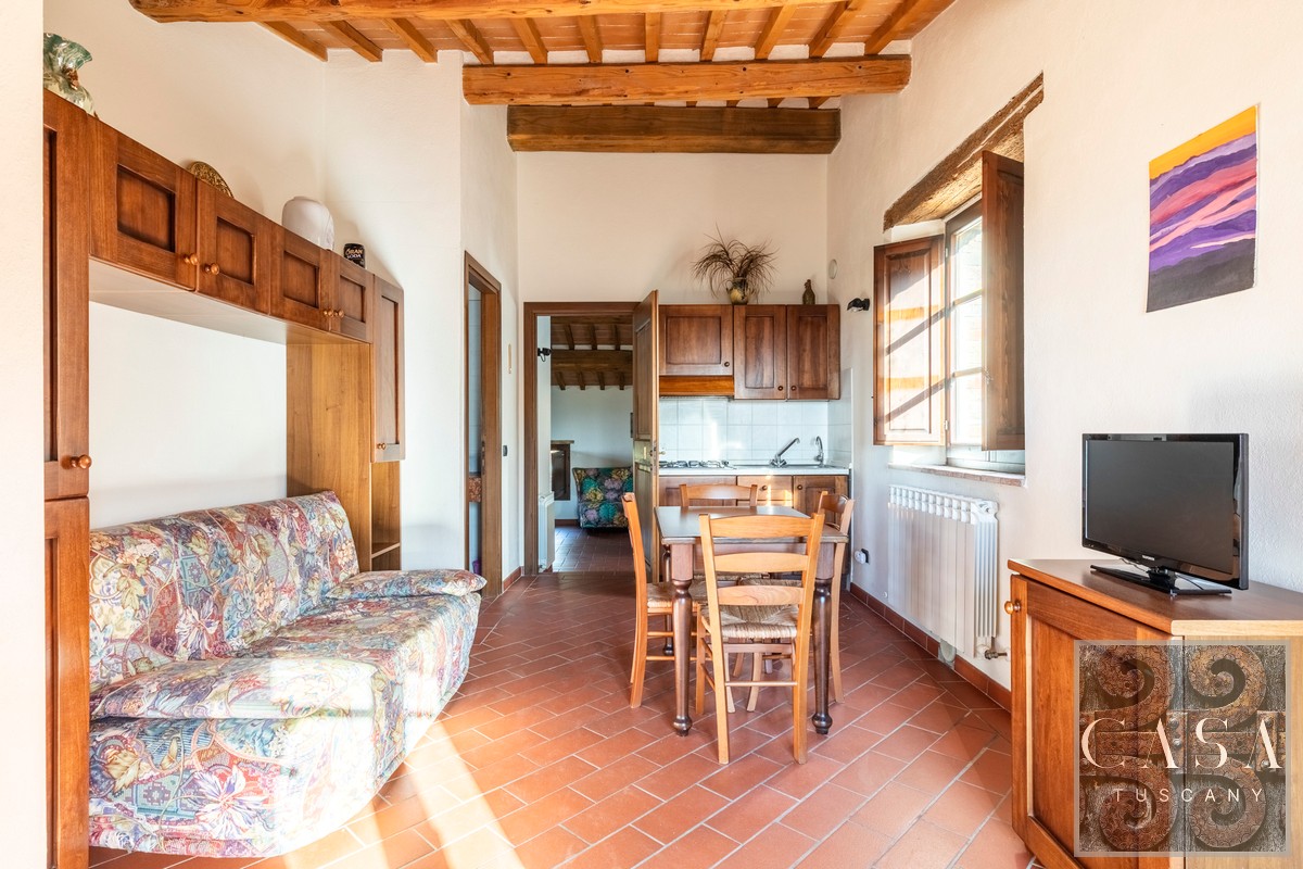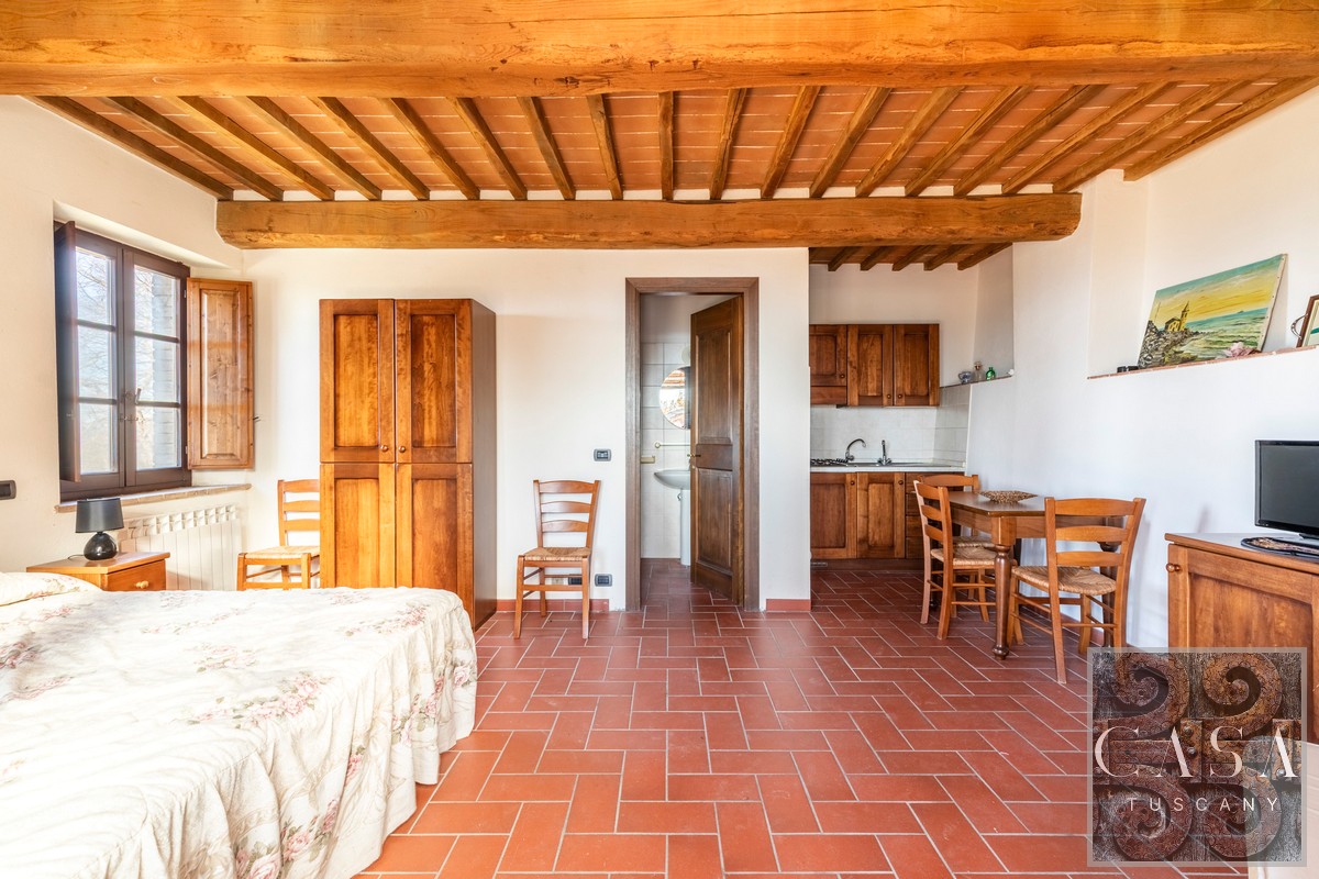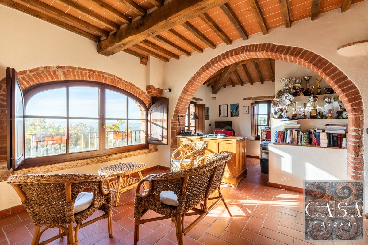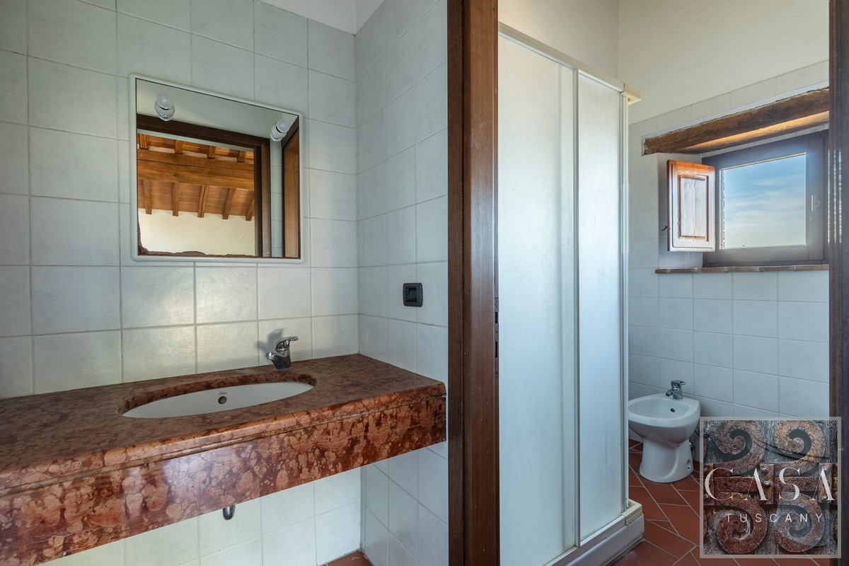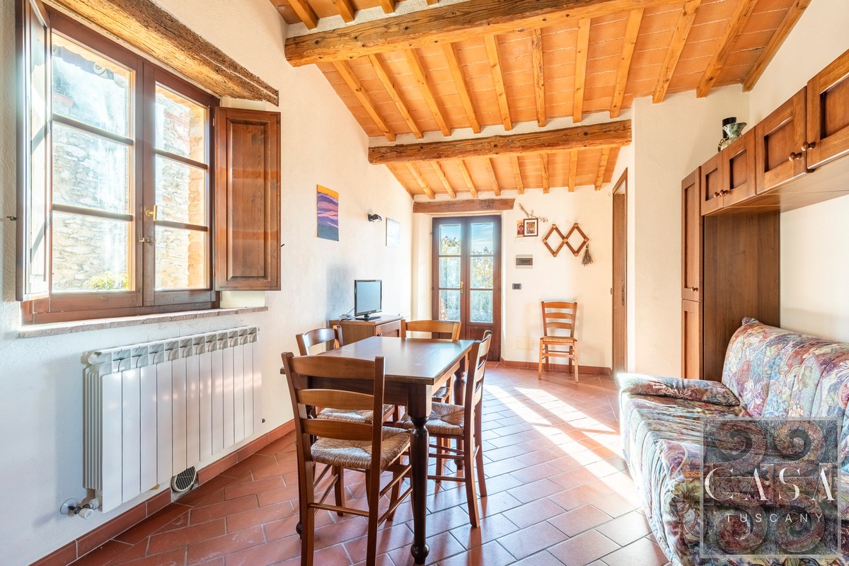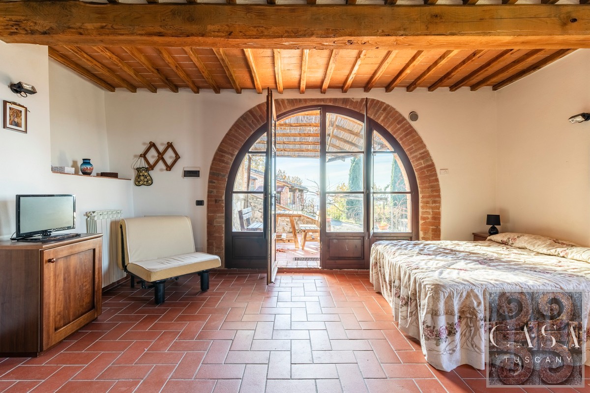 The interiors retain the charm of Tuscan rural architecture: on the ground floor there is a traditional living room with stunning vaulted ceilings, on the first floor there are impressive high ceilings with exposed wooden beams, terracotta floors throughout, and a large central fireplace that becomes the heart of the living area.