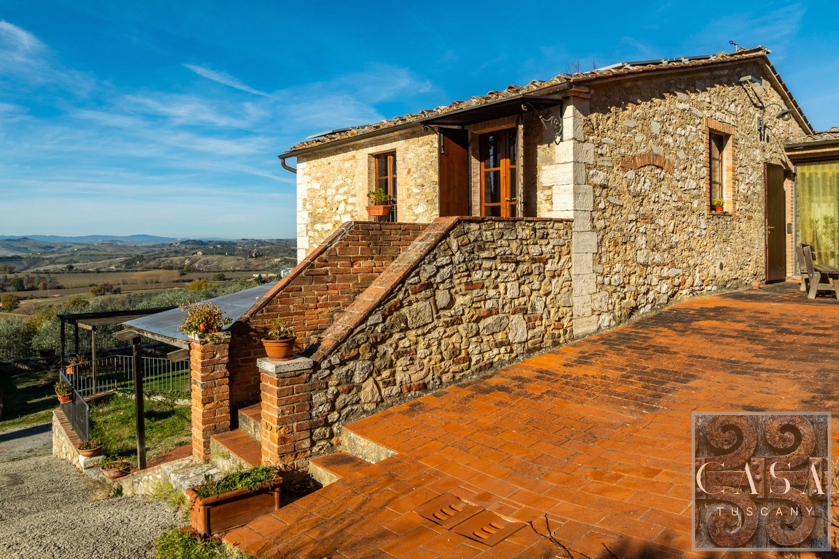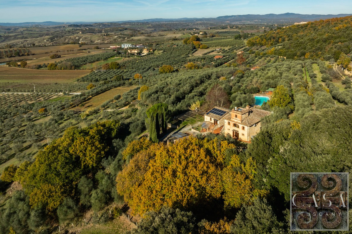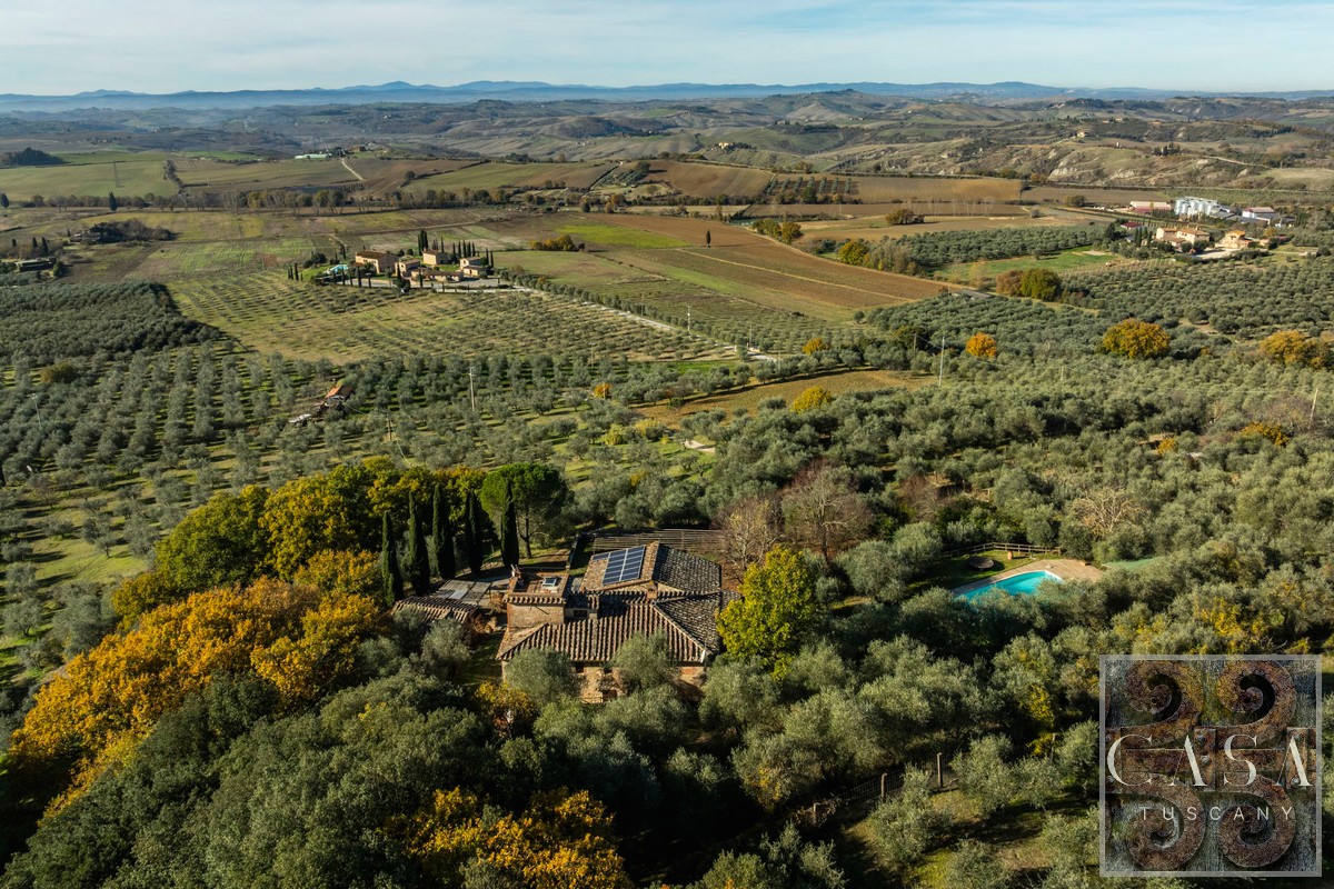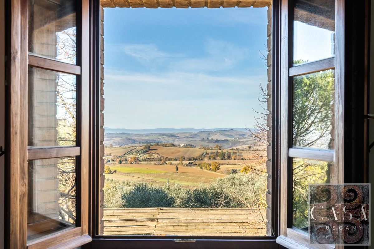 Just a few minutes east of Siena and all amenities, this historic country house dominates an open and endless view of the Tuscan landscape. The location is private but not isolated, accessible via a short stretch of gravel road, and surrounded by over 19 hectares of land, including a garden, panoramic swimming pool, and 18 hectares of olive groves.