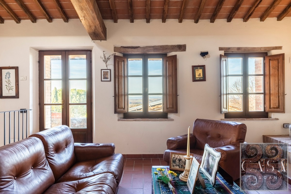 The house dates back to the 1700s and is spreads over five levels with a total area of 464 square meters, culminating in a charming tower with a terrace and boundless views of the Sienese hills.