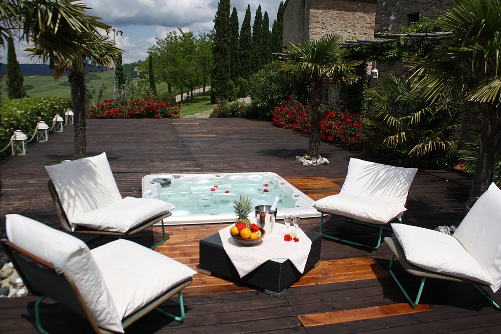 A tiled terrace with Jazuzzi is a perfect place for the guests to relax and enjoy their holiday.