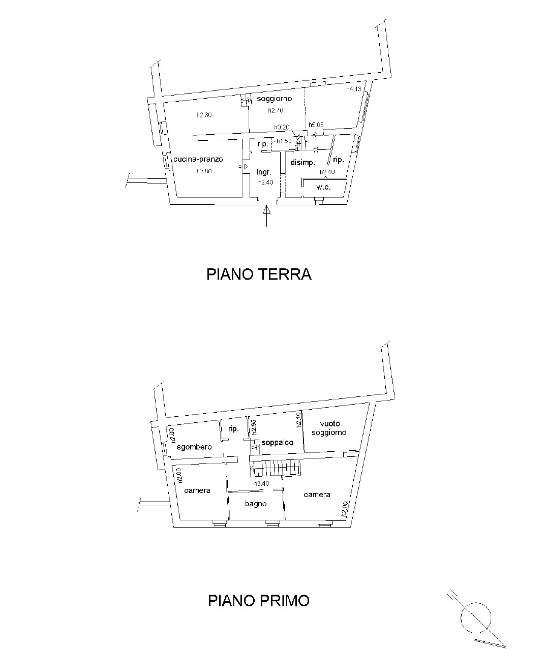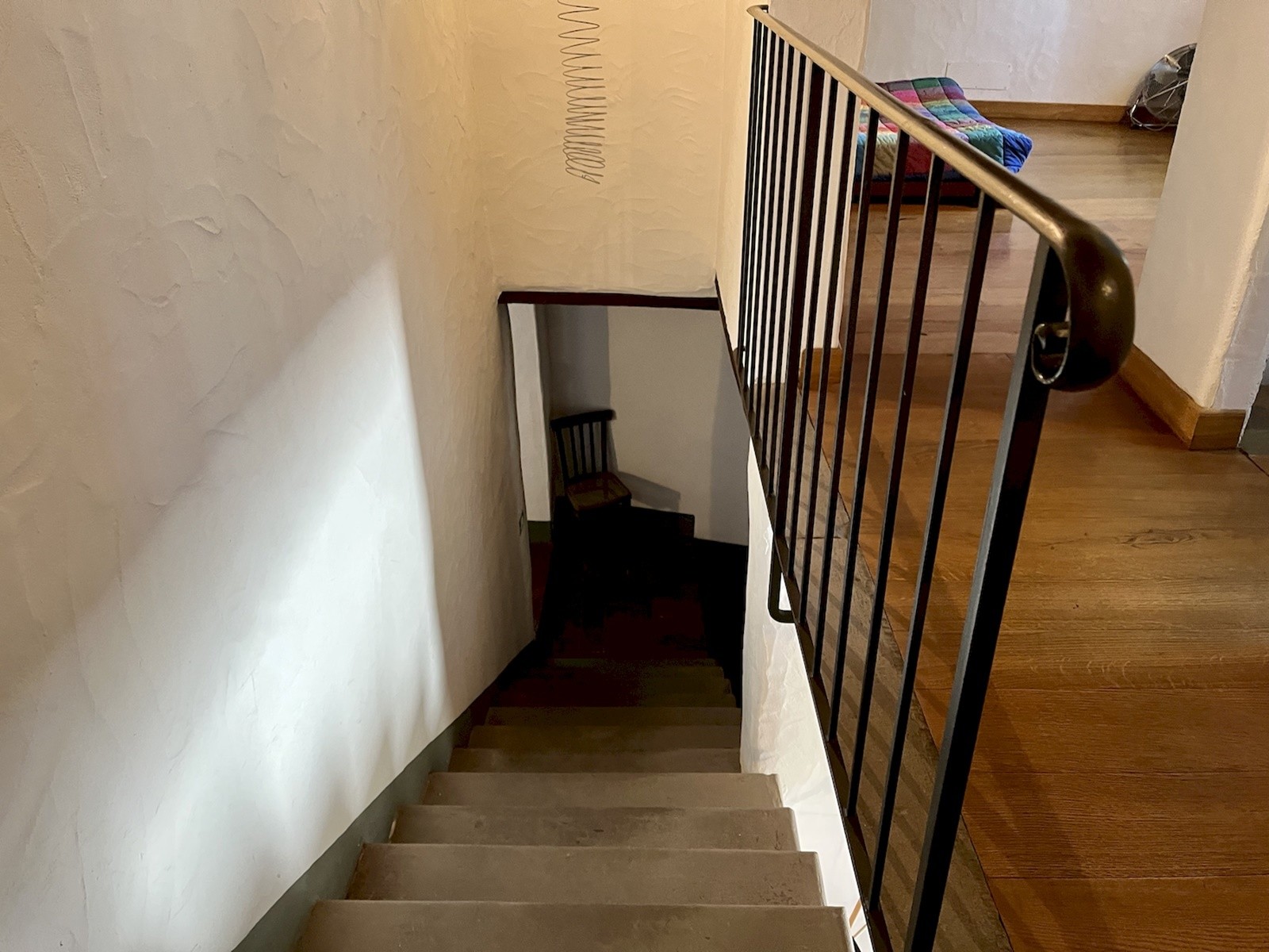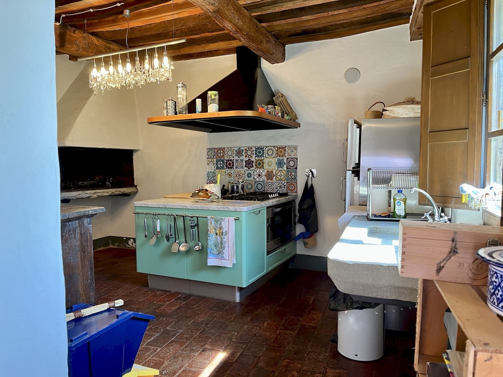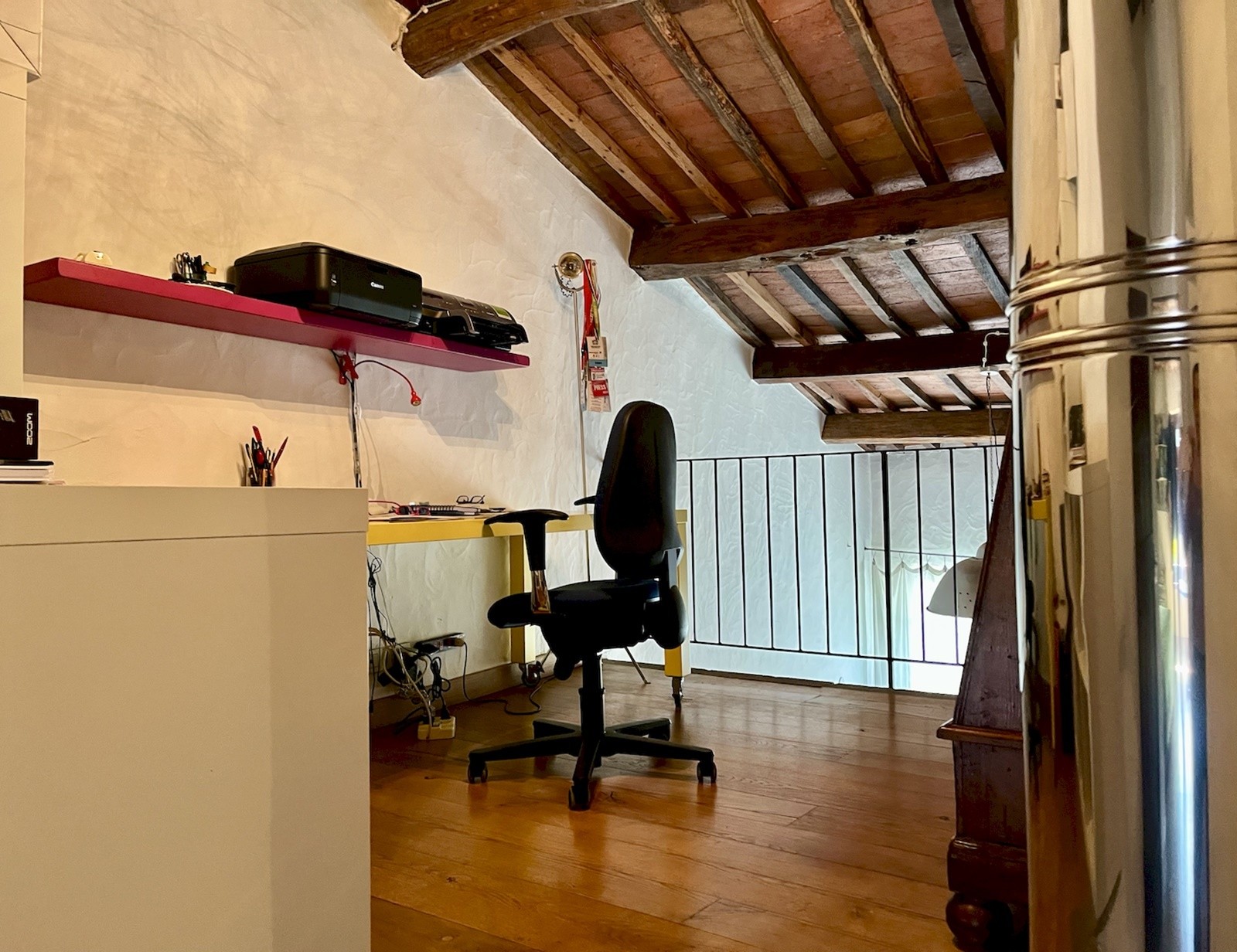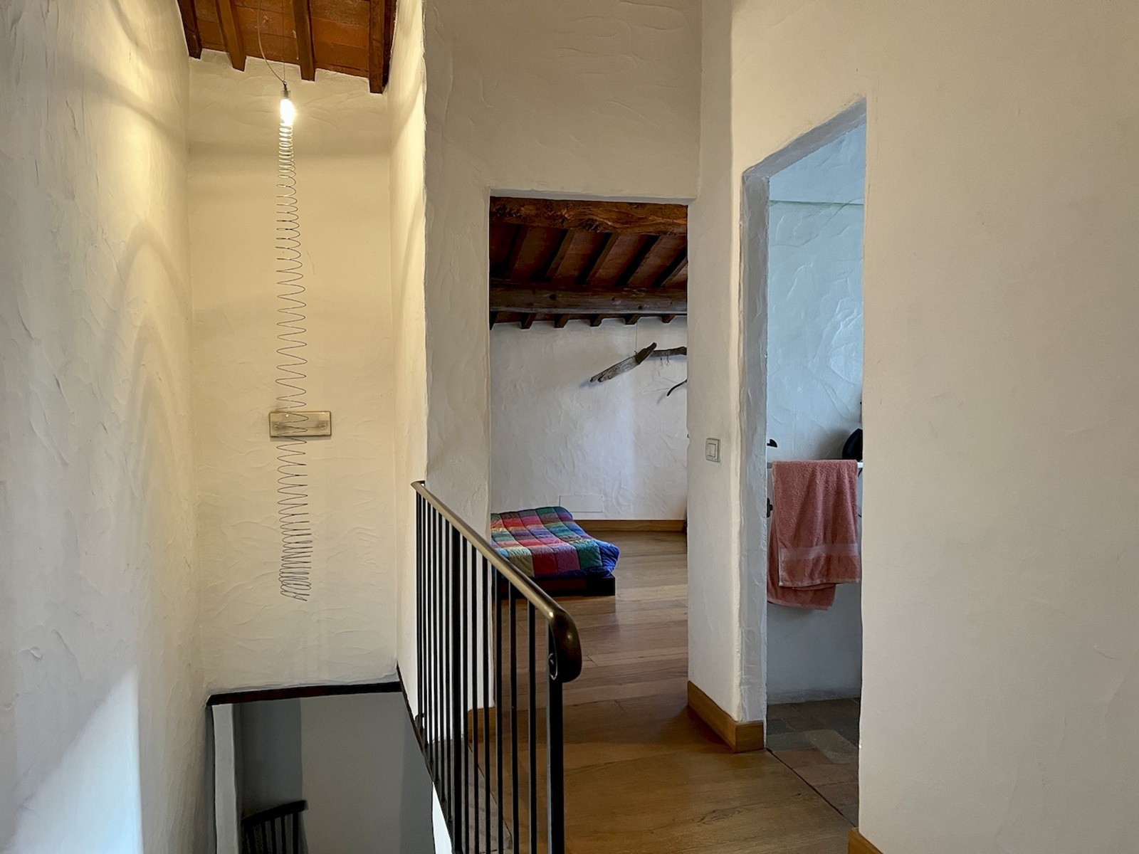 On the ground floor there is the living area where we find a large entrance hall, a storage room in the basement, a hallway, a bathroom, a storage room for use as a technical room and laundry, a large living area with fireplace and a kitchen. On the first floor, a hallway, a bathroom, three bedrooms, one of which is smaller, a storage room and a mezzanine area used as a study, overlooking the living room.