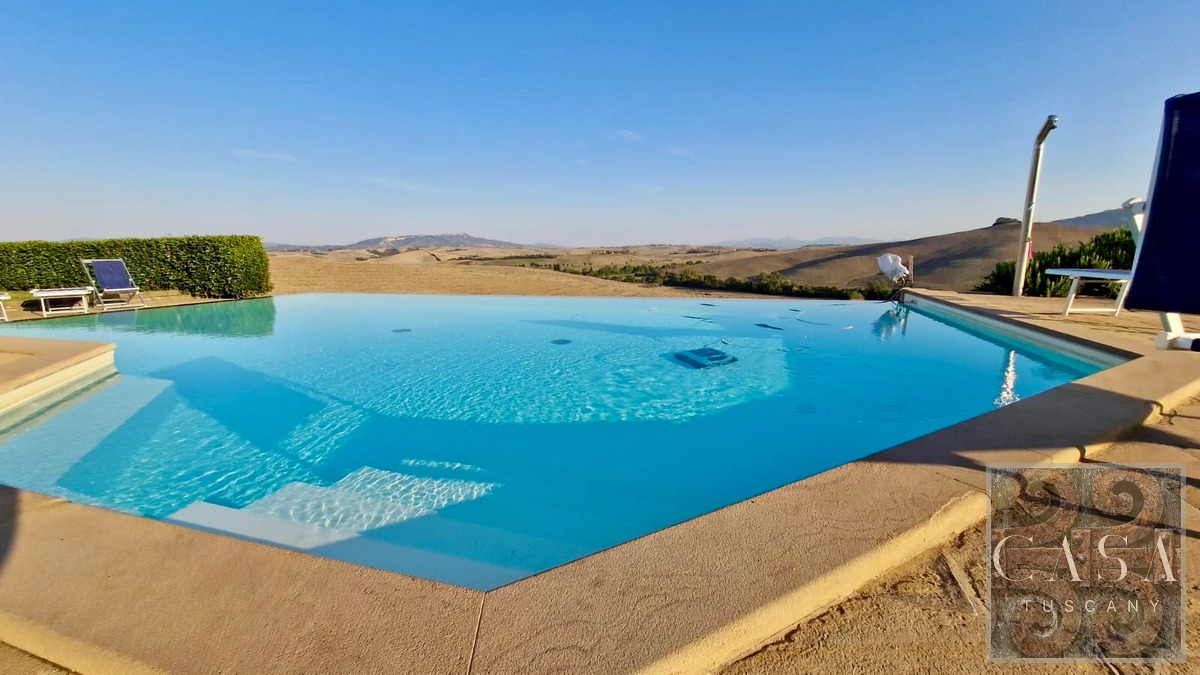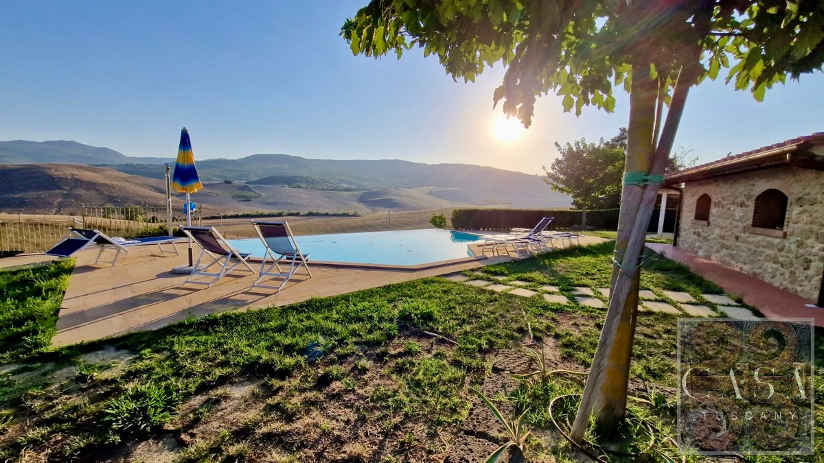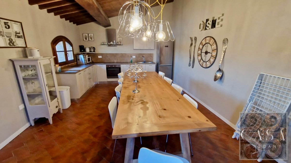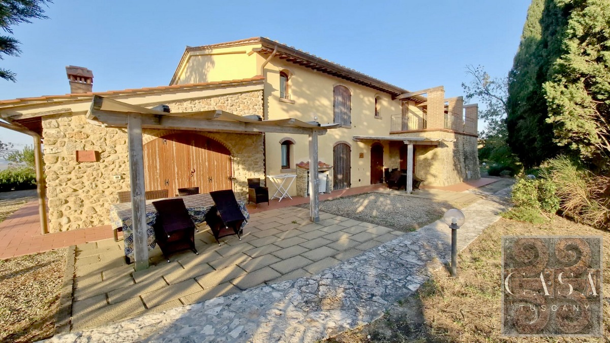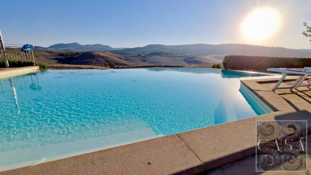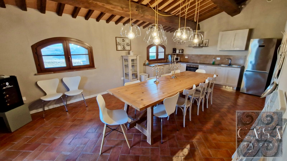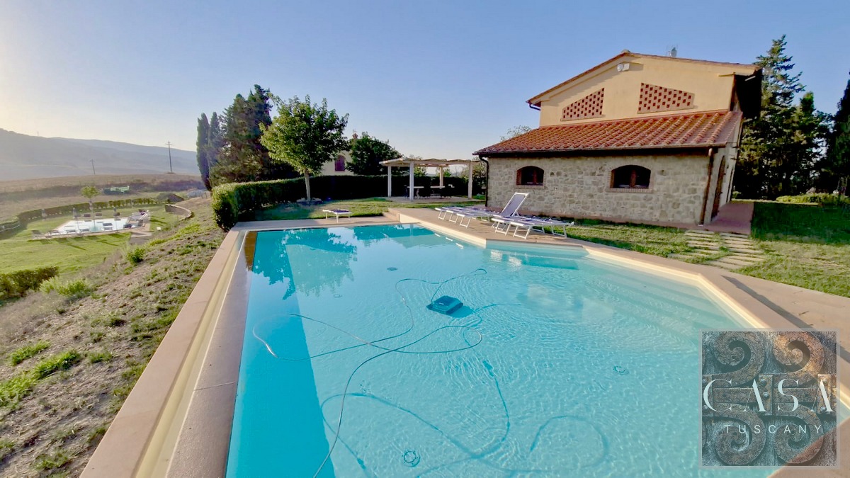 Near Lajatico, in the Pisa province of Tuscany, with 360 degree views, on a sunny dominant hill with a view of Andrea Bocelli’s famous Teatro del Silenzio, a complex of approximately 1,000 sqm in total, perfectly and finely restored in rustic Tuscan style with quality materials.