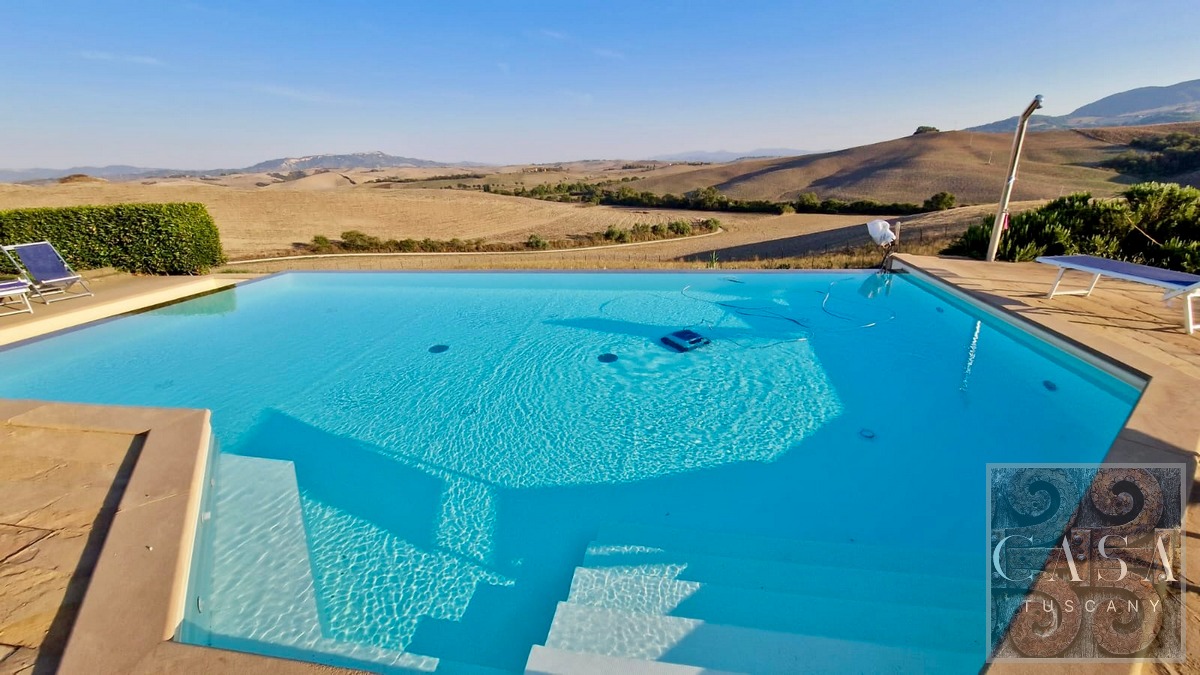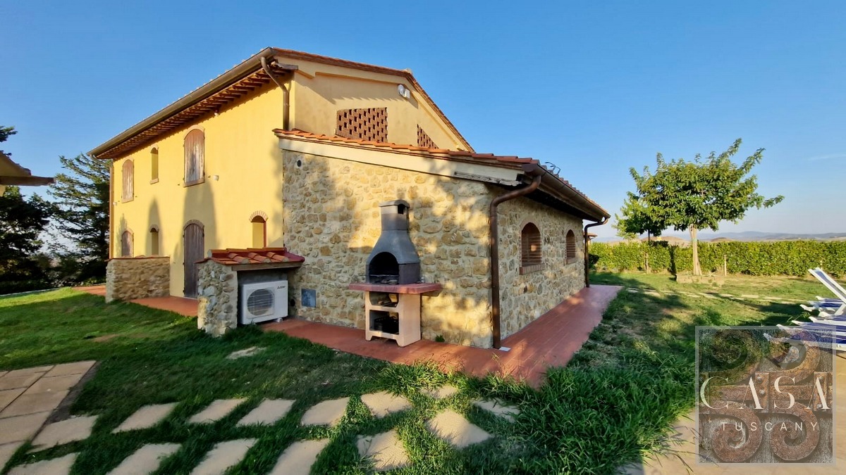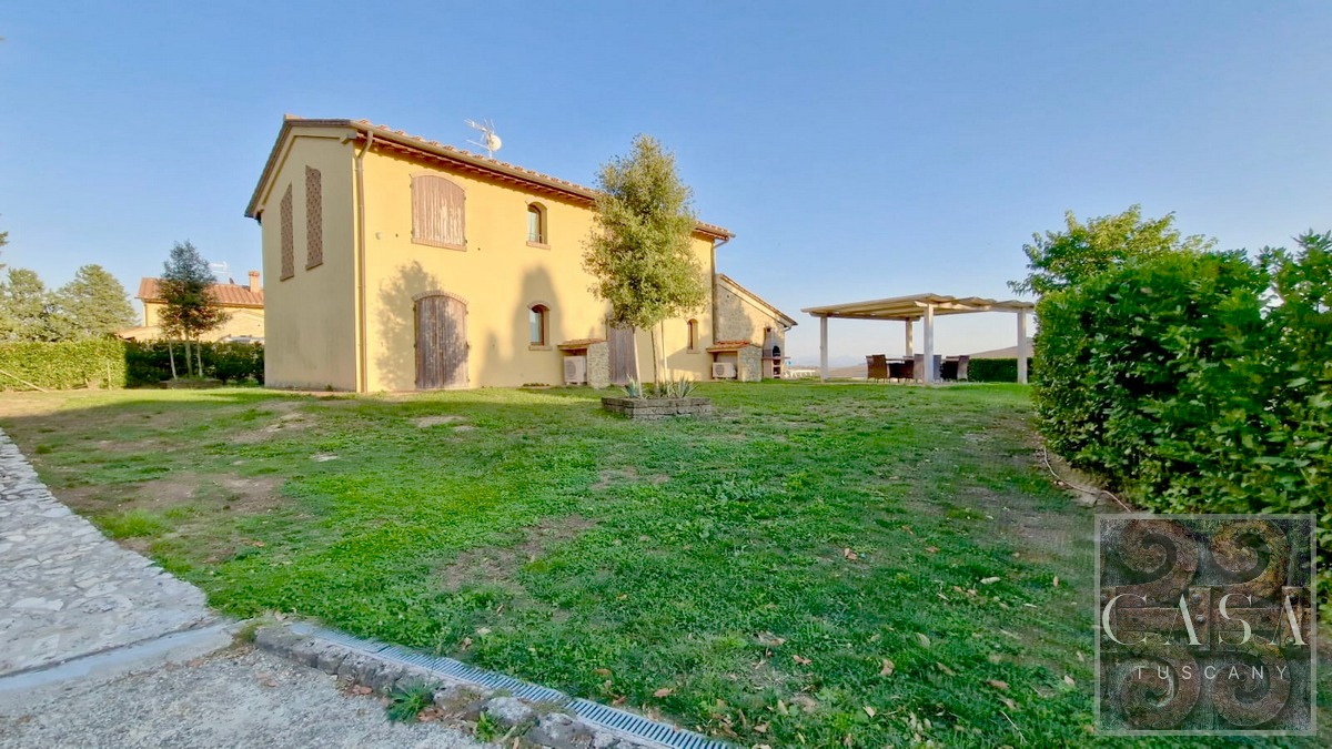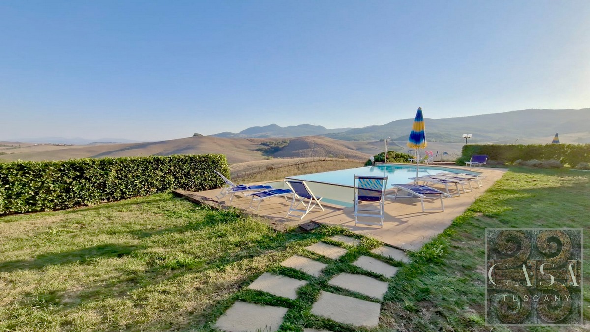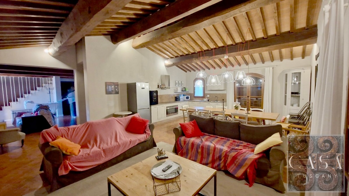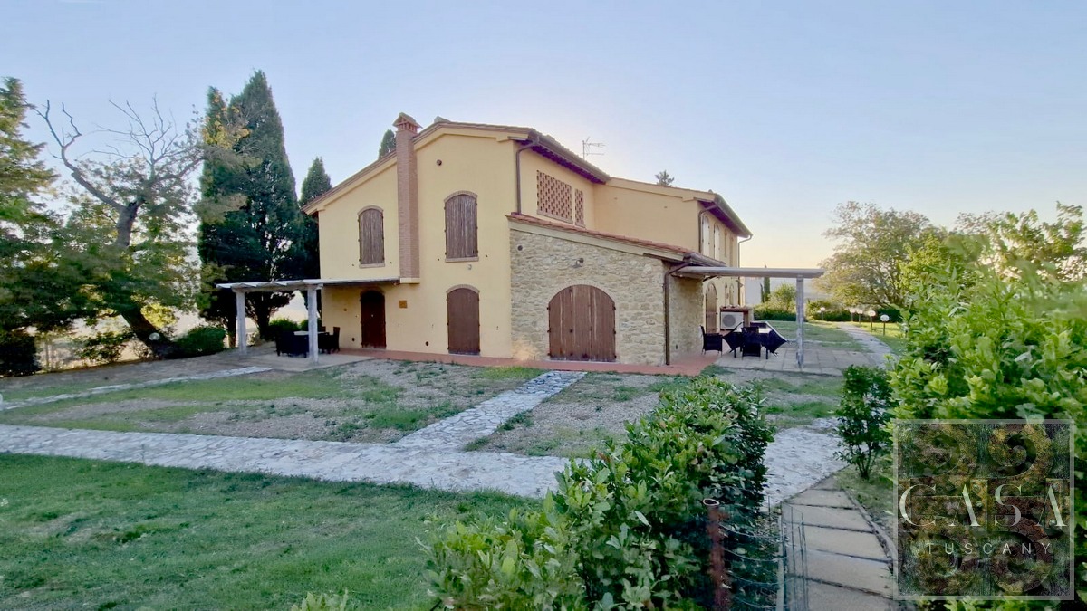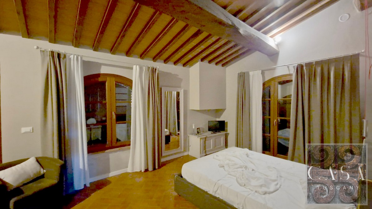 Near Lajatico, in the Pisa province of Tuscany, with 360 degree views, on a sunny dominant hill with a view of Andrea Bocelli’s famous Teatro del Silenzio, a complex of approximately 1,000 sqm in total, perfectly and finely restored in rustic Tuscan style with quality materials.