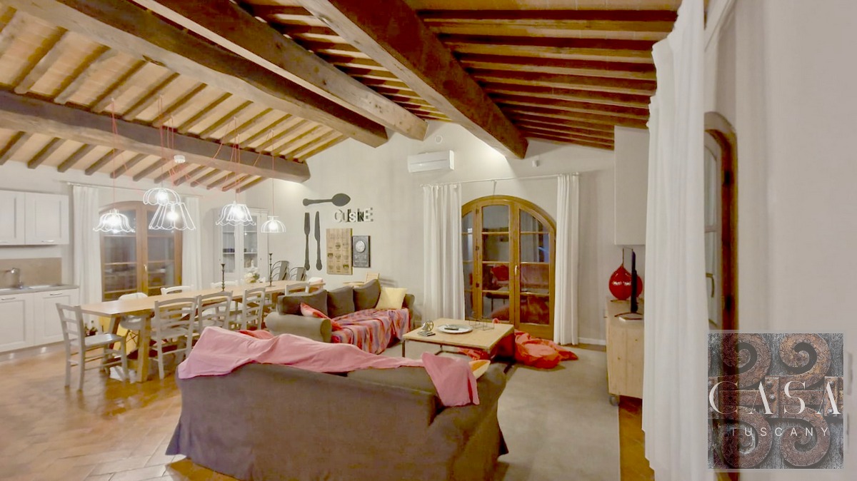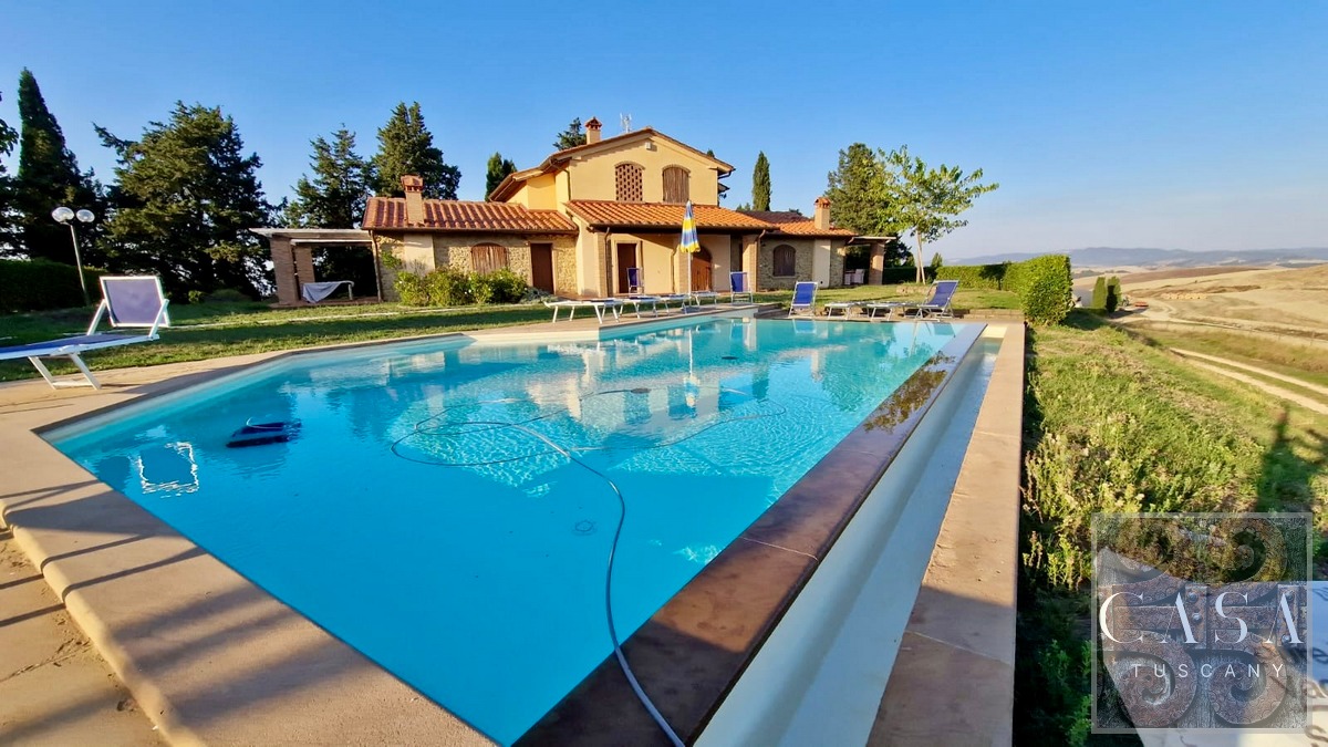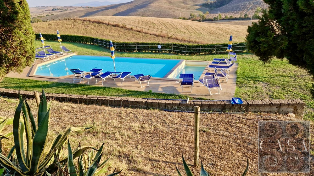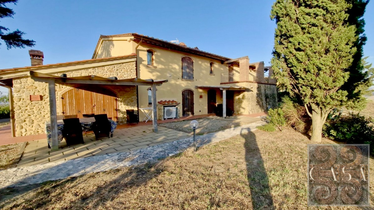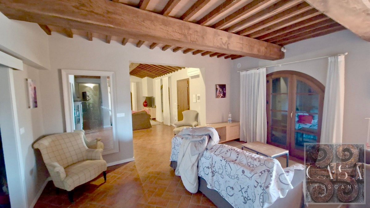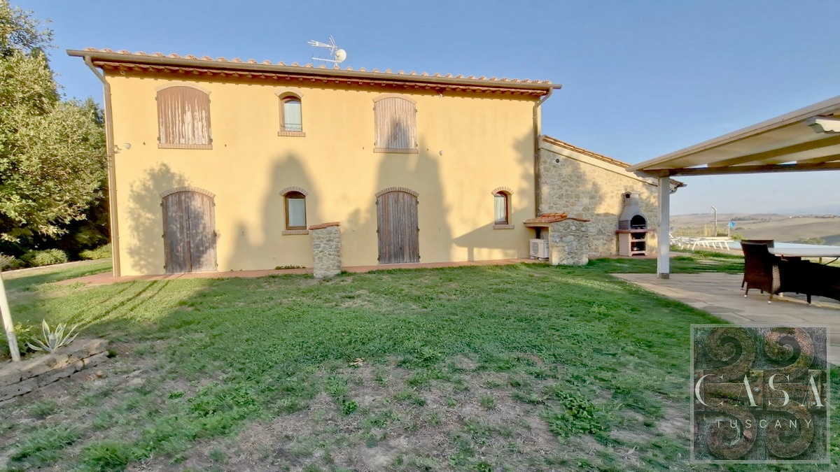 Near Lajatico, in the Pisa province of Tuscany, with 360 degree views, on a sunny dominant hill with a view of Andrea Bocelli’s famous Teatro del Silenzio, a complex of approximately 1,000 sqm in total, perfectly and finely restored in rustic Tuscan style with quality materials.