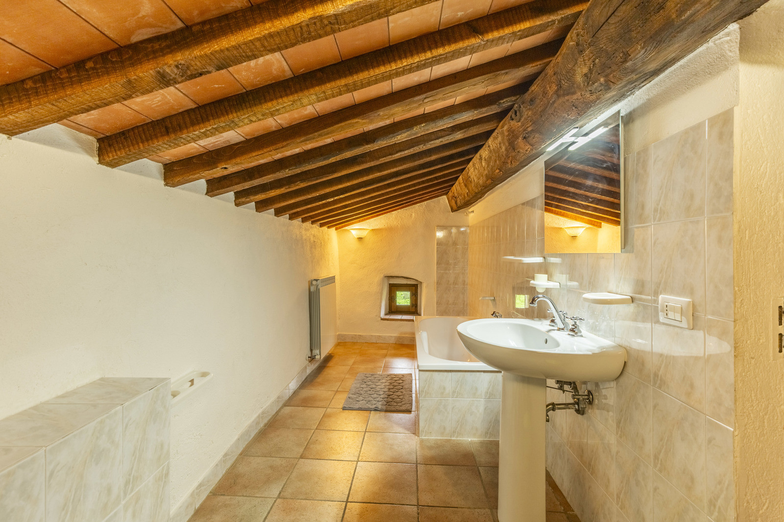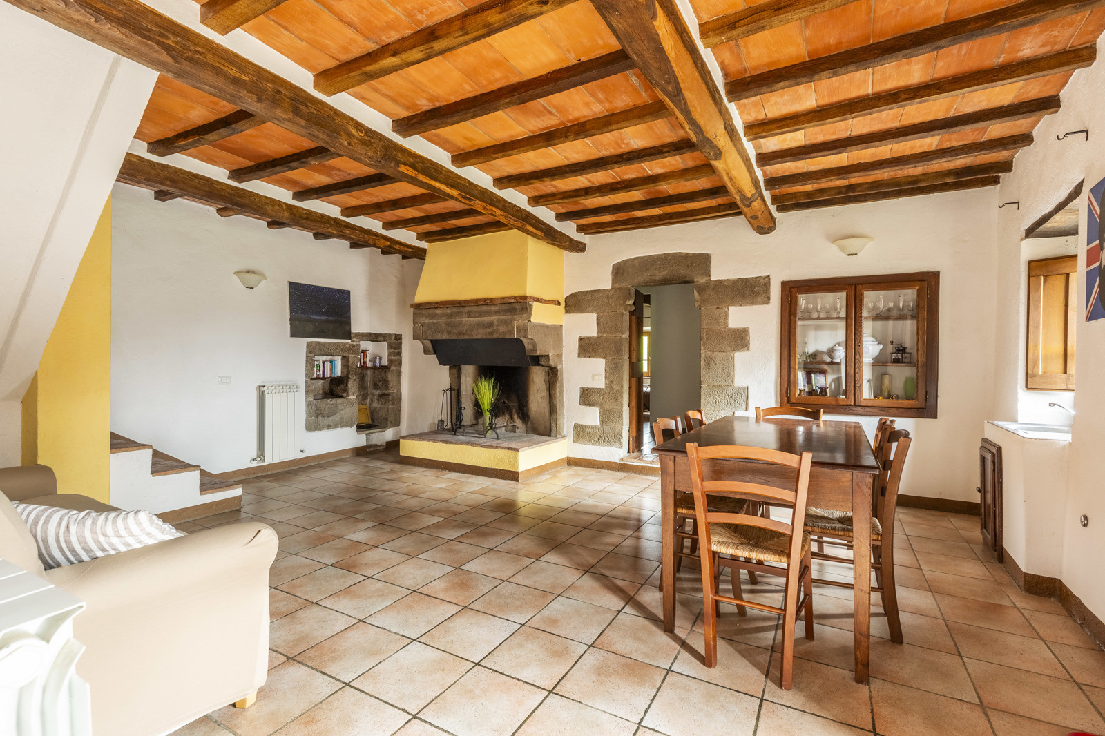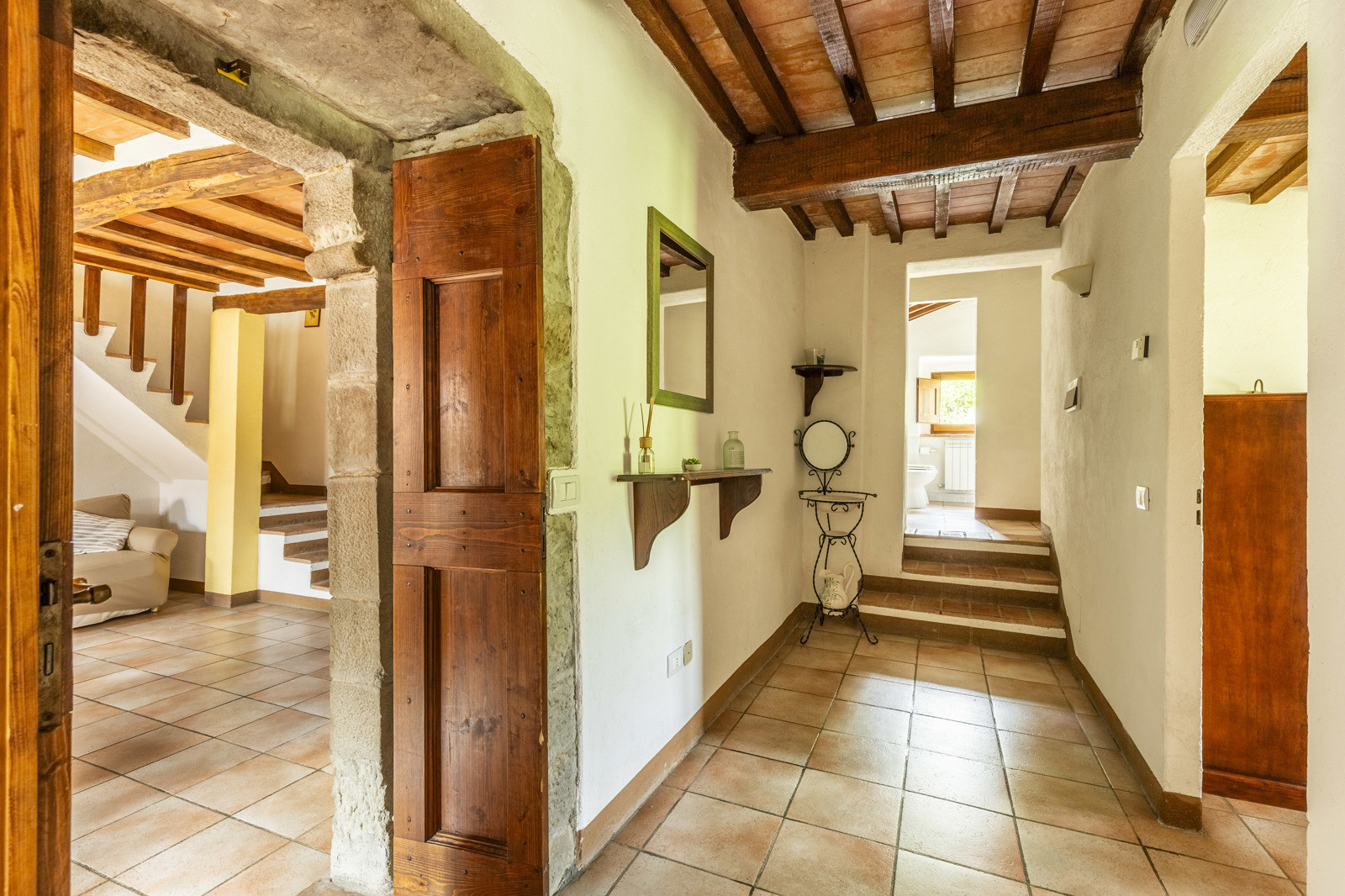 On the first floor, with access by an ancient external staircase we find a second living area with a splendid working period fireplace. On the left we find the first bedroom with en-suite bathroom, on the opposite side 3 more bedrooms with a shared bathroom.