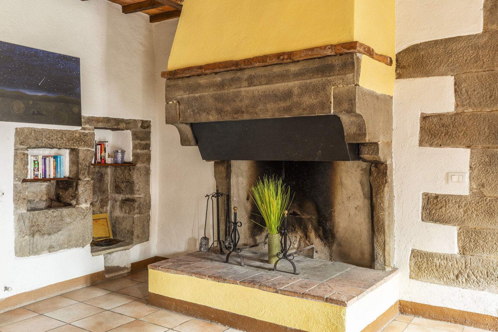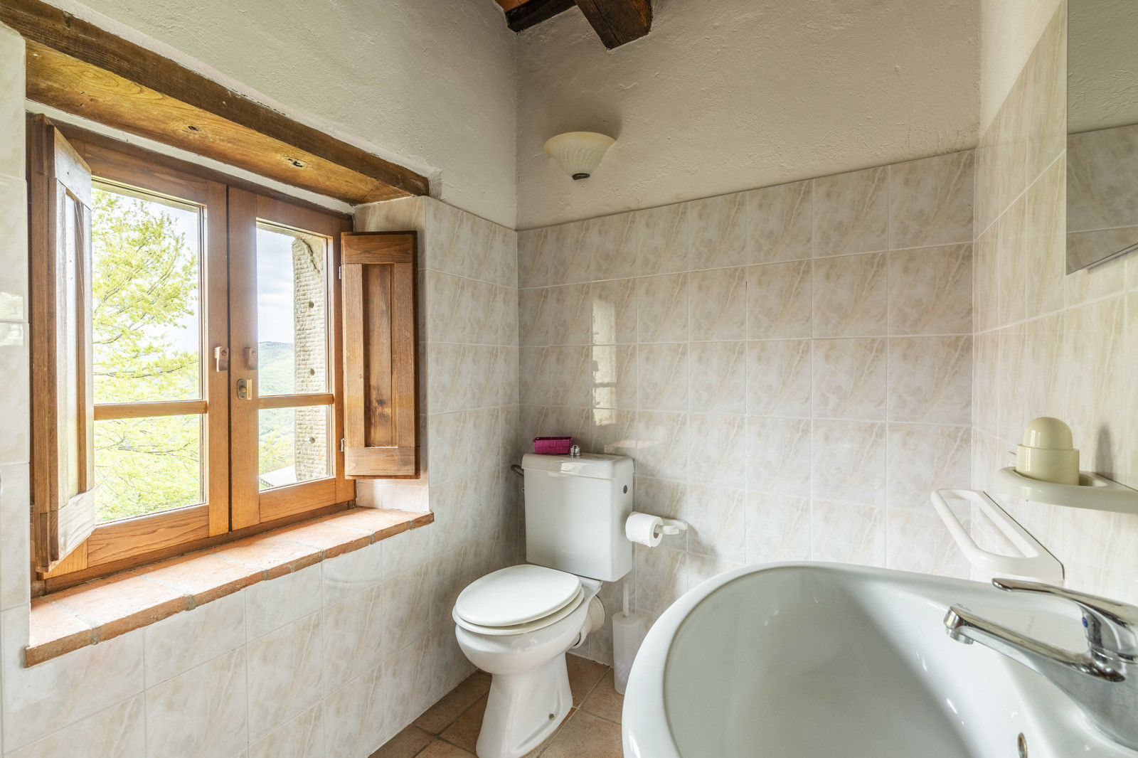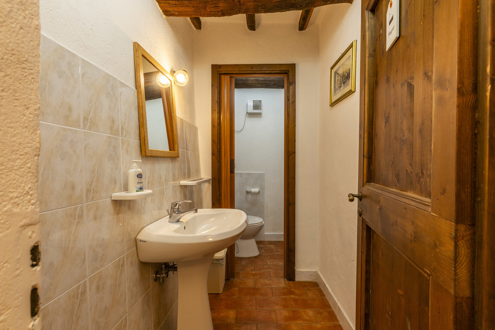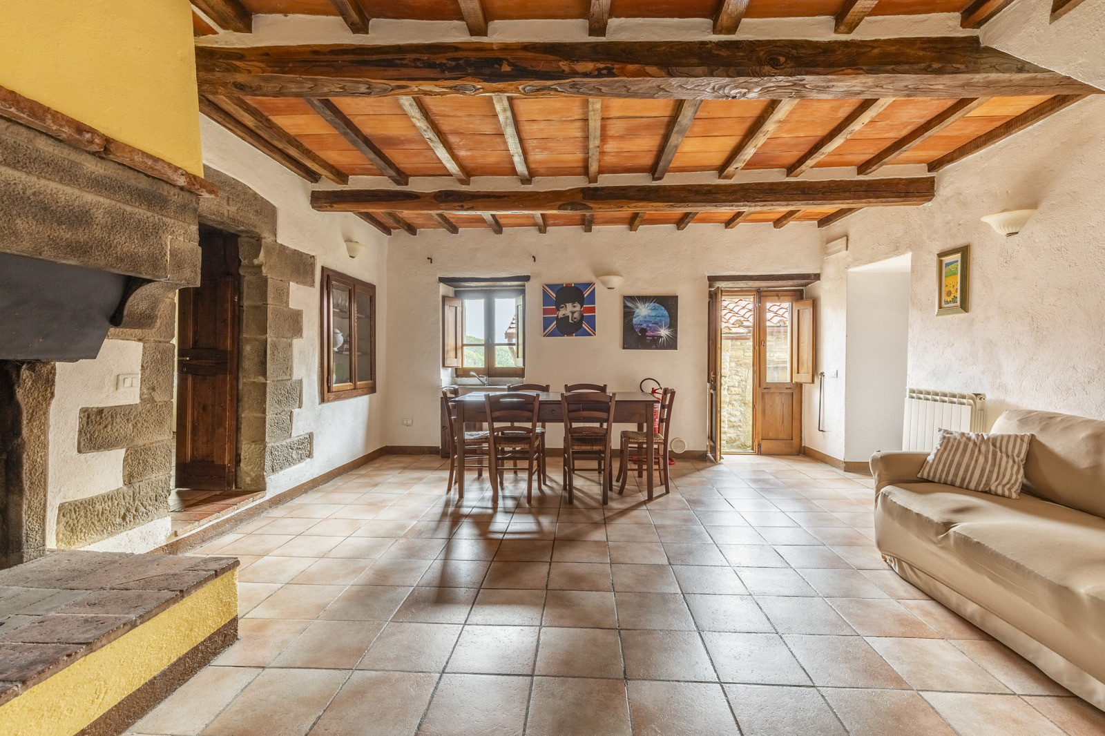 On the first floor, with access by an ancient external staircase we find a second living area with a splendid working period fireplace. On the left we find the first bedroom with en-suite bathroom, on the opposite side 3 more bedrooms with a shared bathroom.