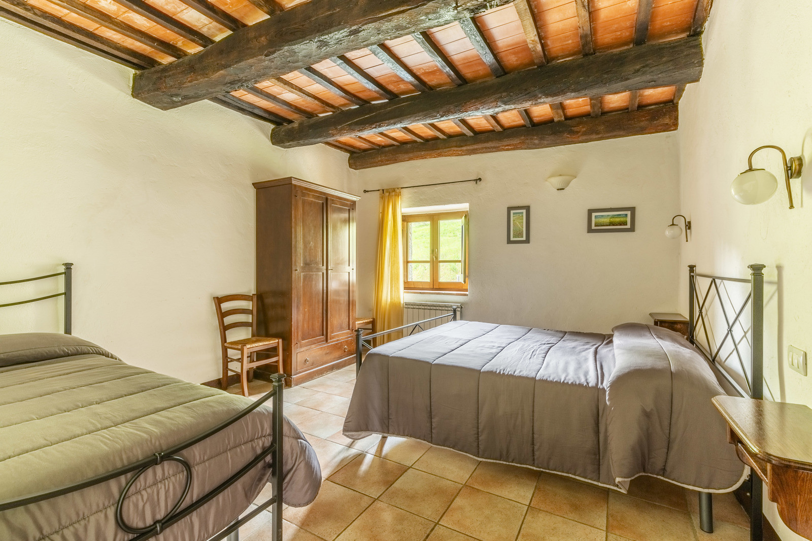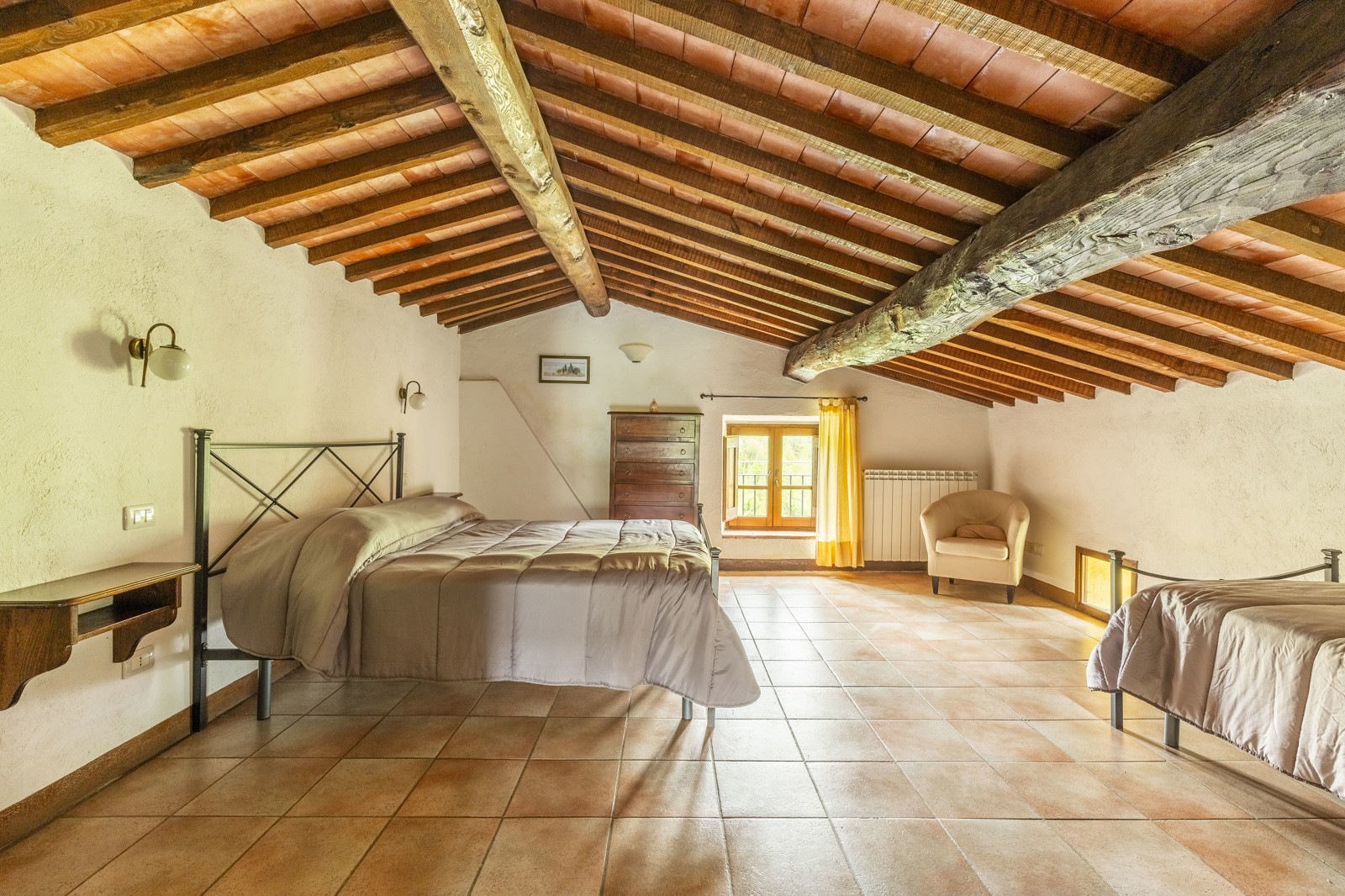 The property is in excellent condition, with the last two renovations done in the 1990s and 2015. it features fine original materials such as terracotta for the floors, exposed wooden beams with terracotta tiles for the ceilings. The facade is in gray stone, typical of Cortona. The farmhouse has LPG central heating with 3 separate boilers. 70m working well for irrigation and the swimming pool. The roof of the annex has been insulated and waterproofed. Already present internet/wi-fi connection.