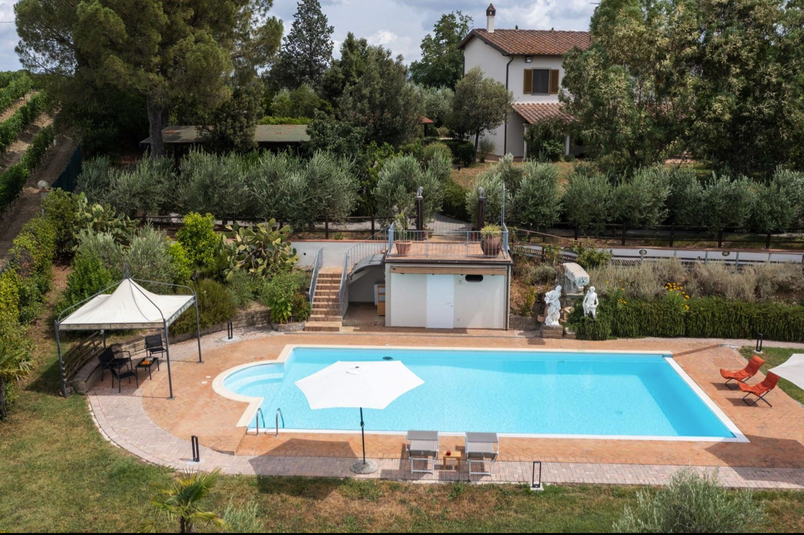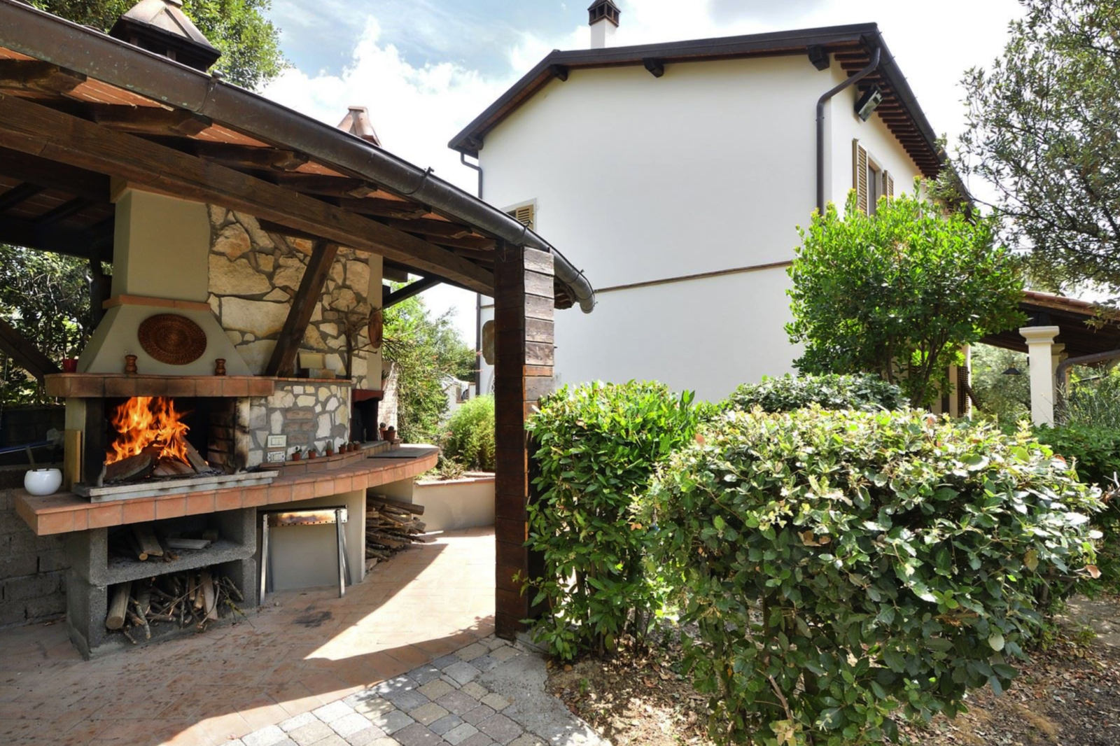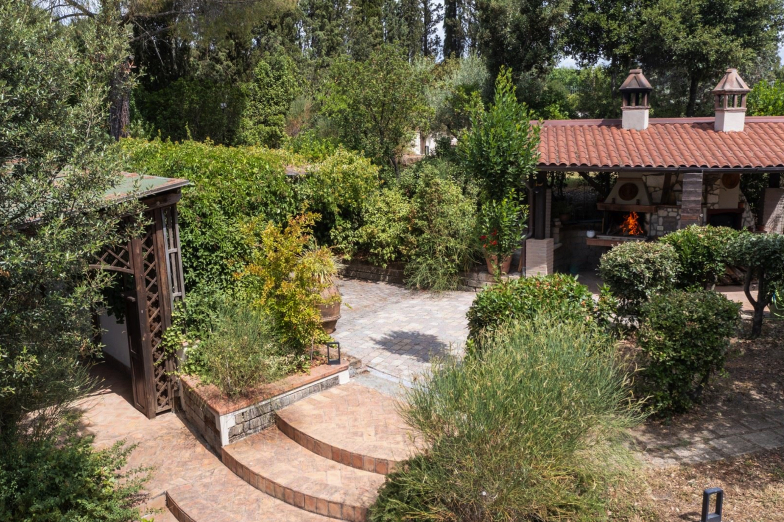 Strategically placed at various points in the garden are two panoramic pergolas, one with a wood-burning oven and barbecue, a small annex used for laundry and others for storing garden tools.